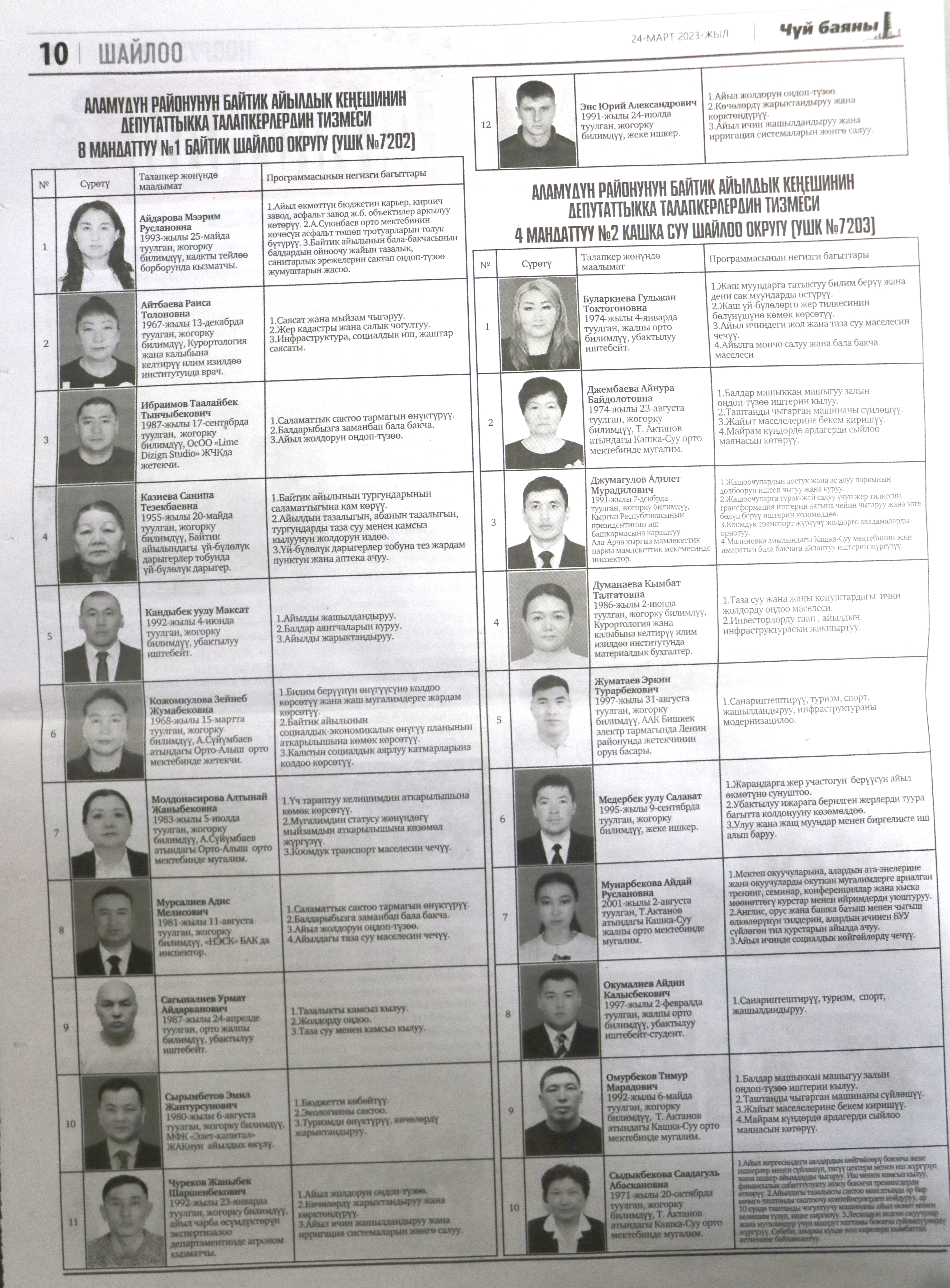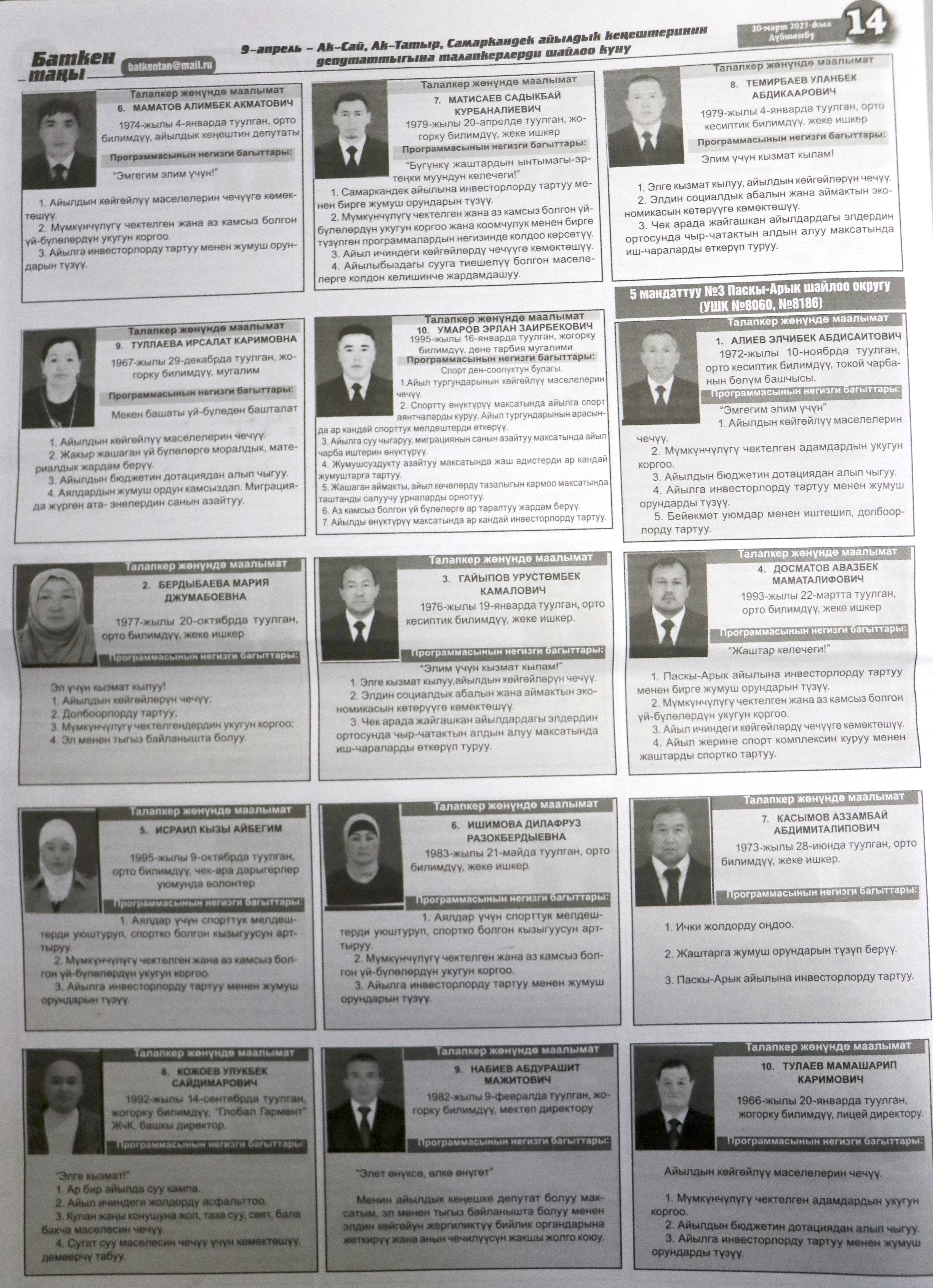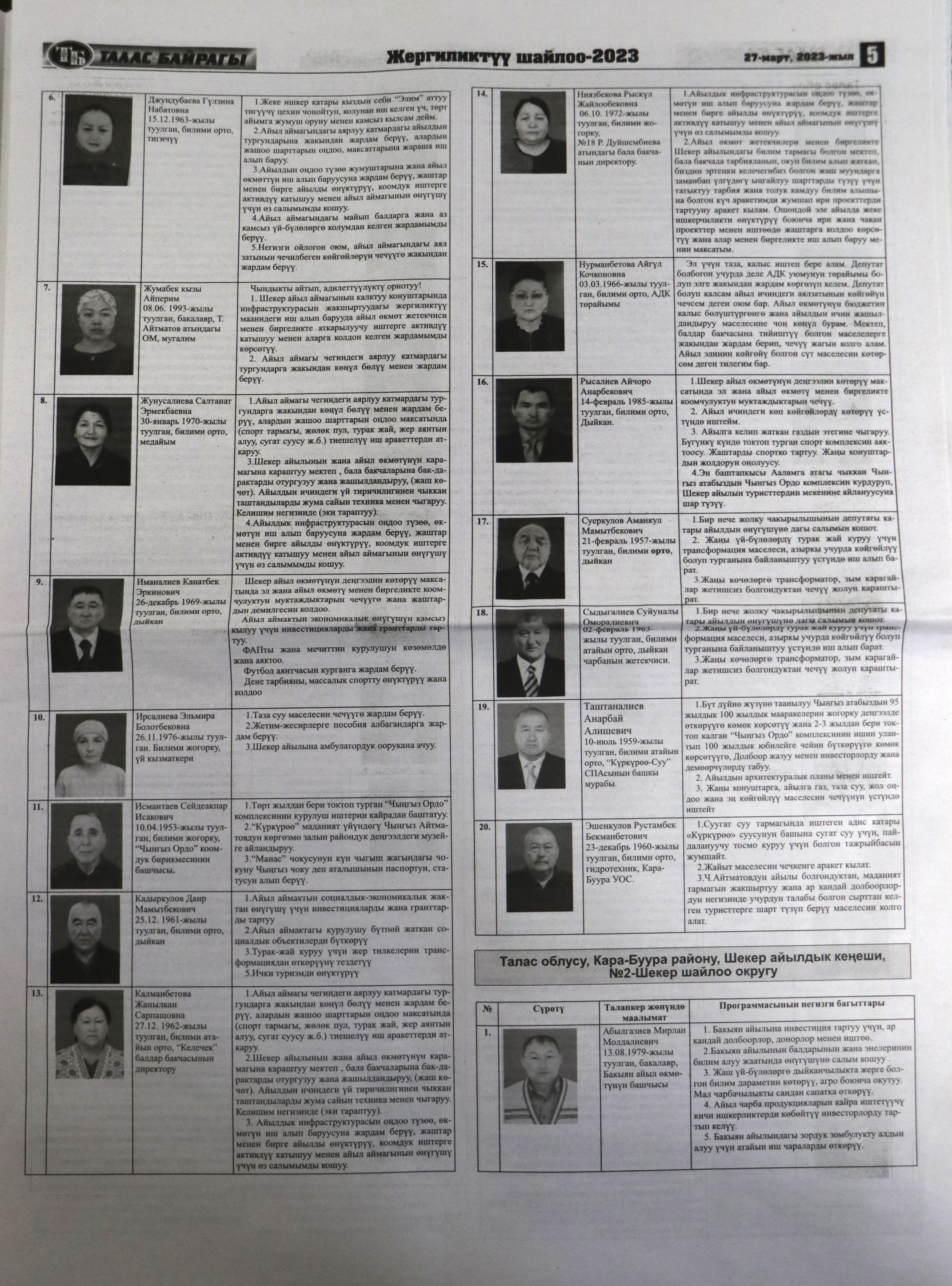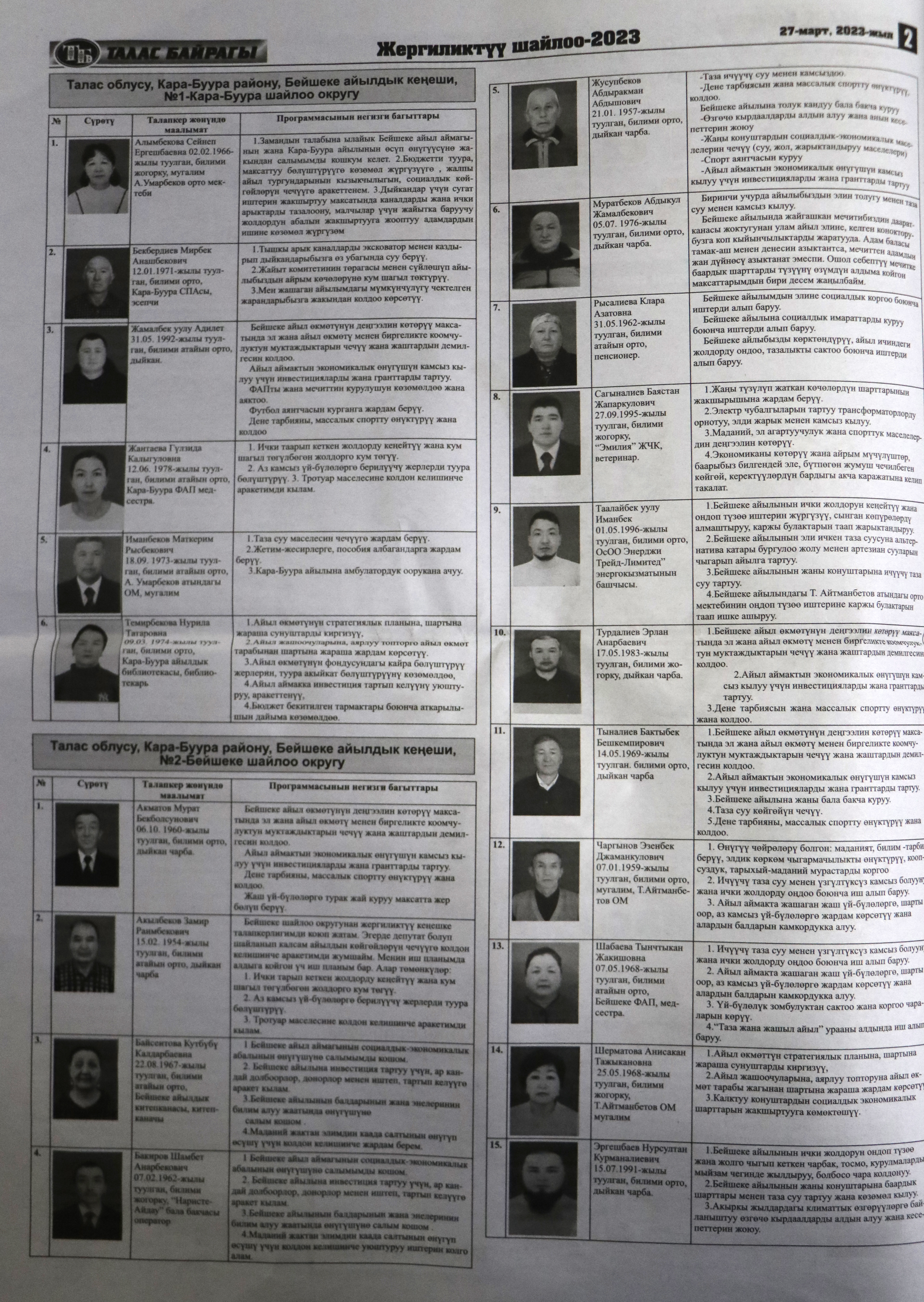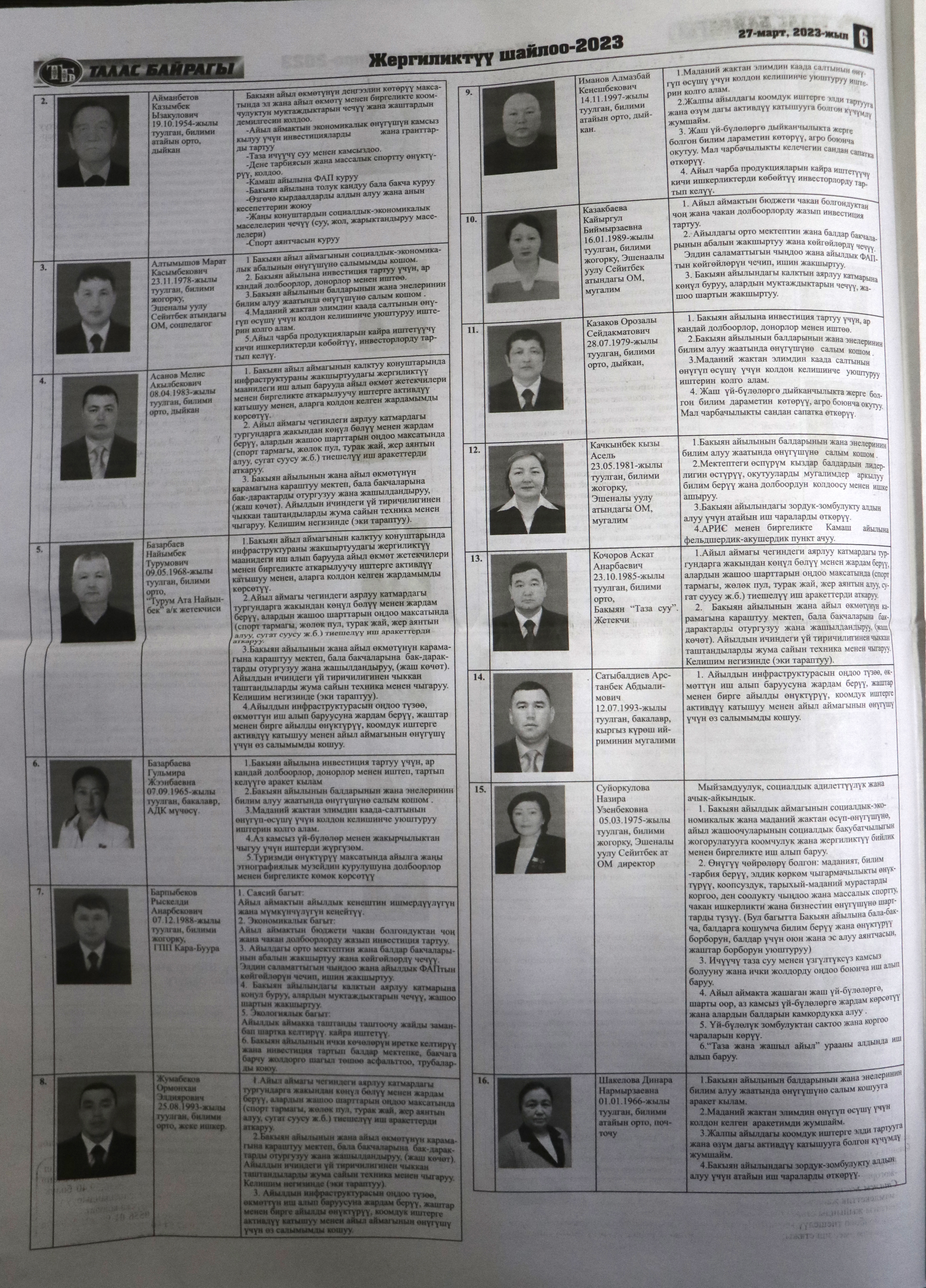 Жергиликтүү кеңештерлдин депутаттыгына талапкерлер жѳнүндѳ шайлоочуларды маалымдоо максатында БШК райондук жана облустук гезиттерде маалыматтарды жарыялаган.