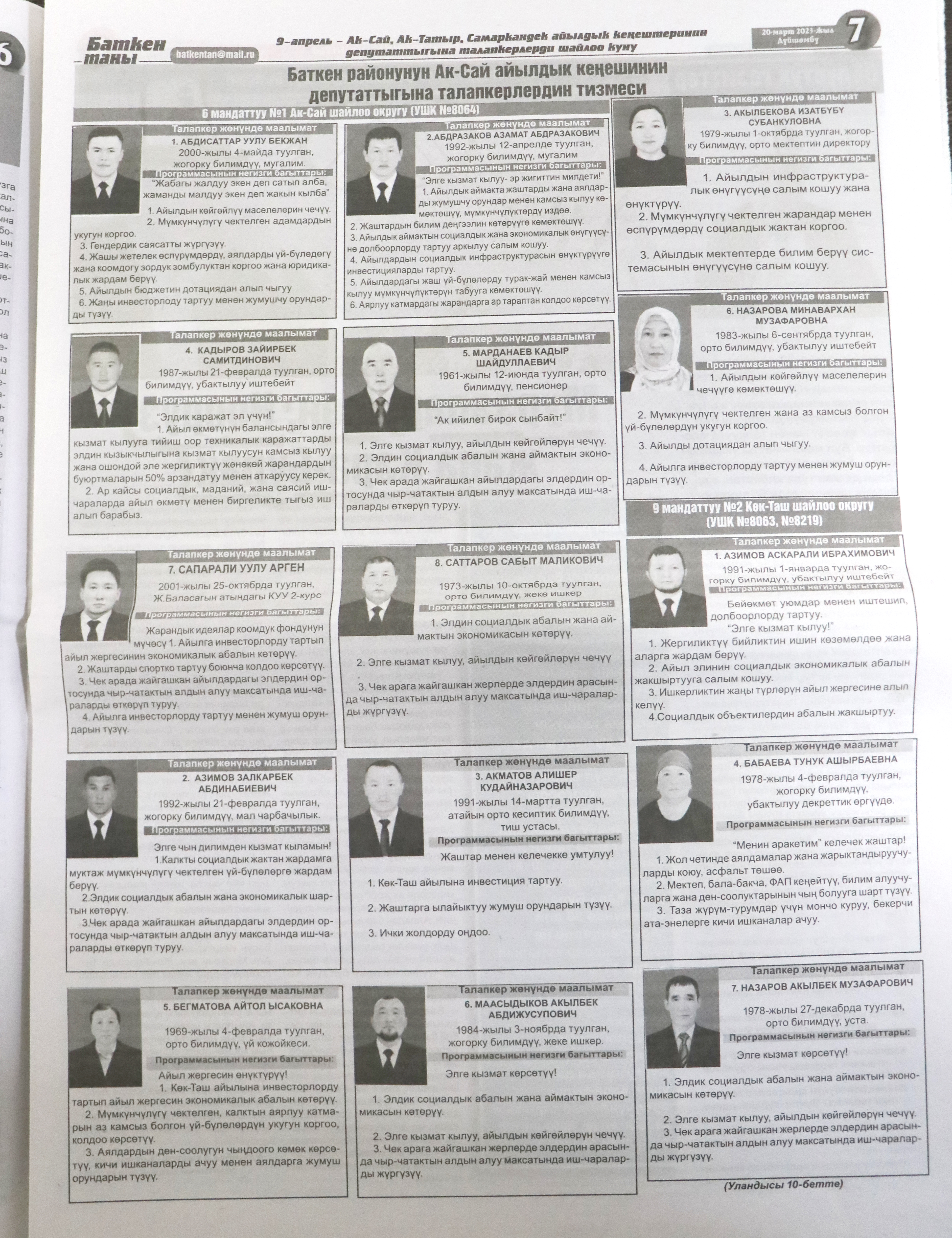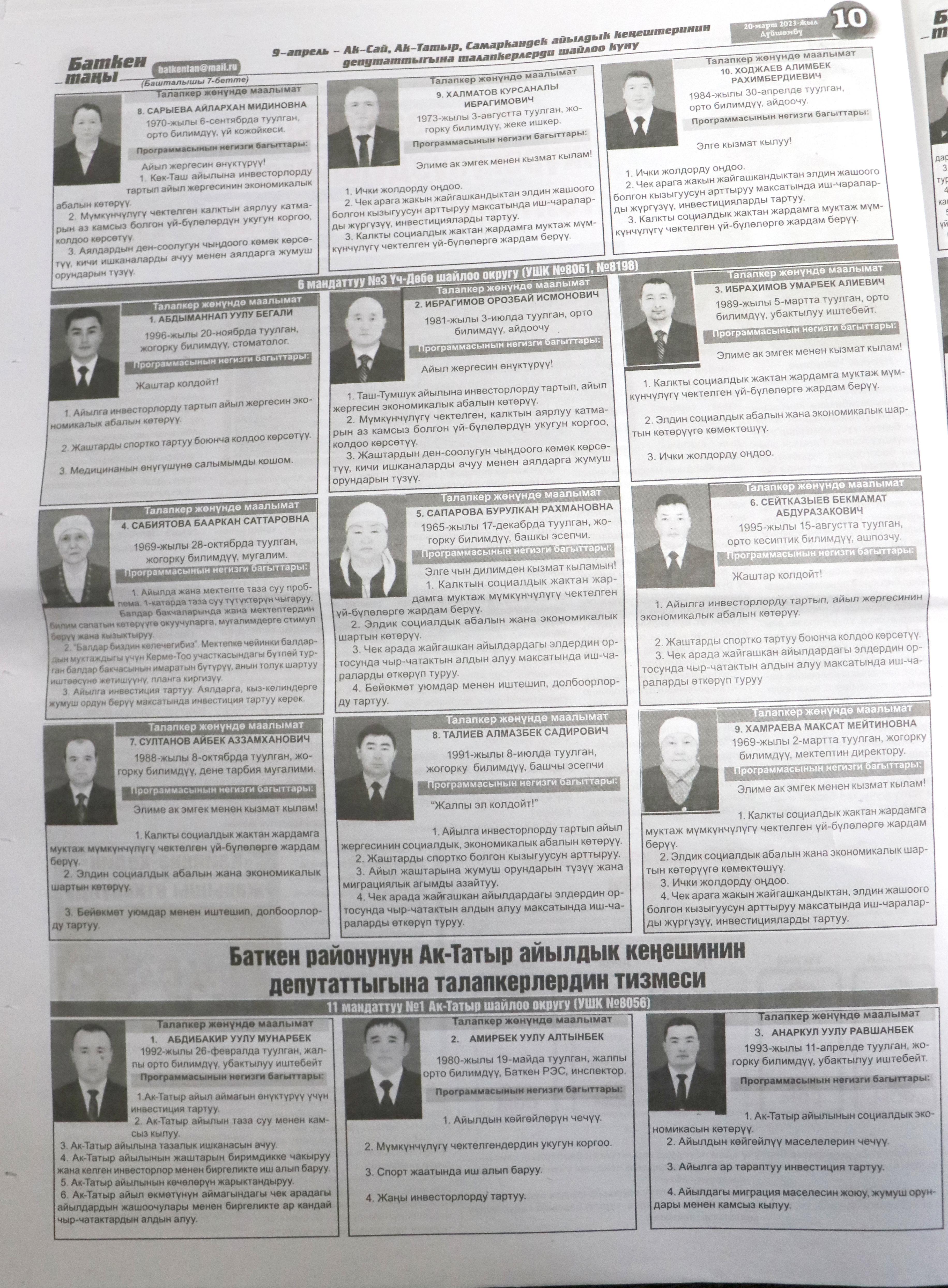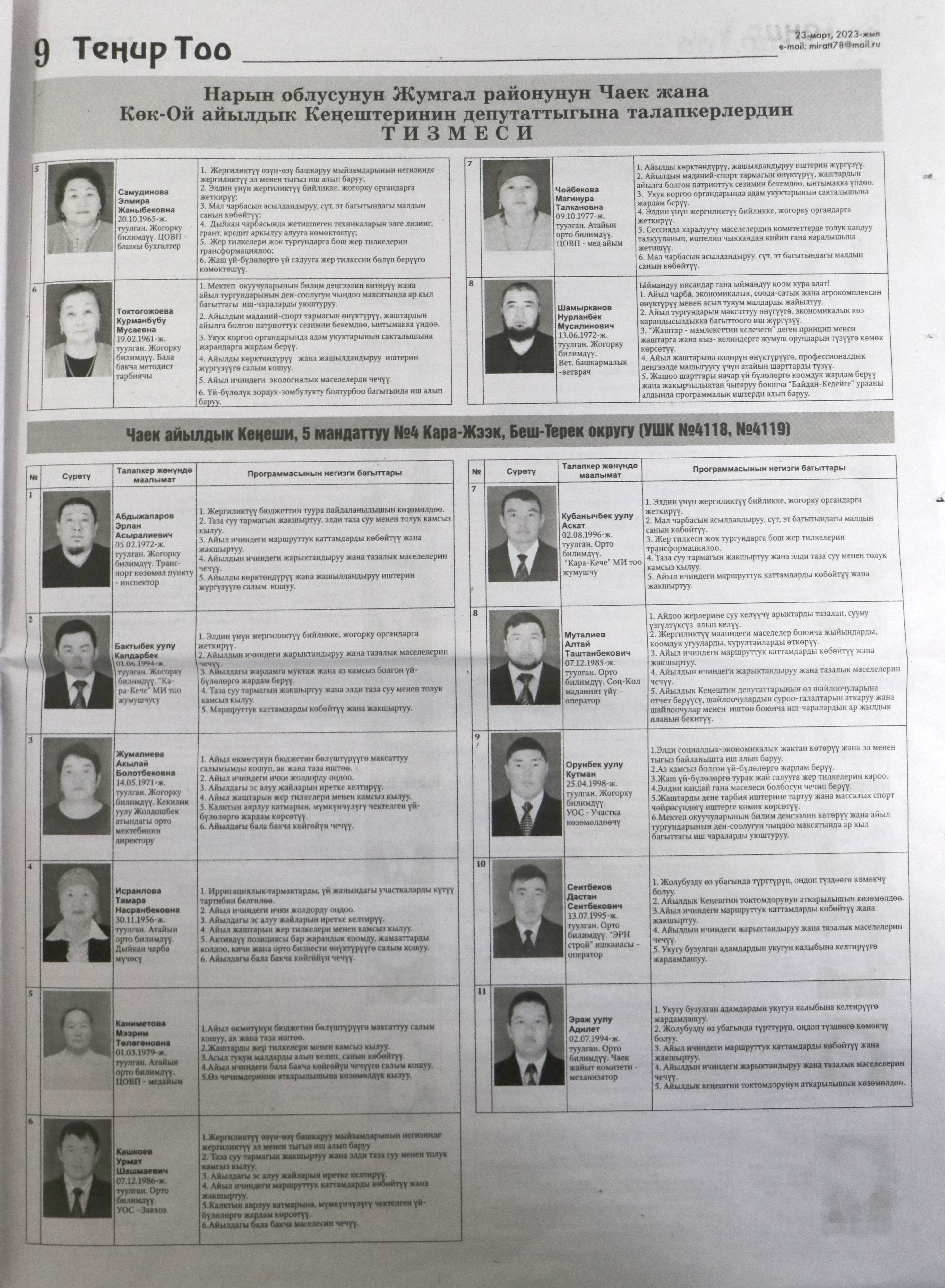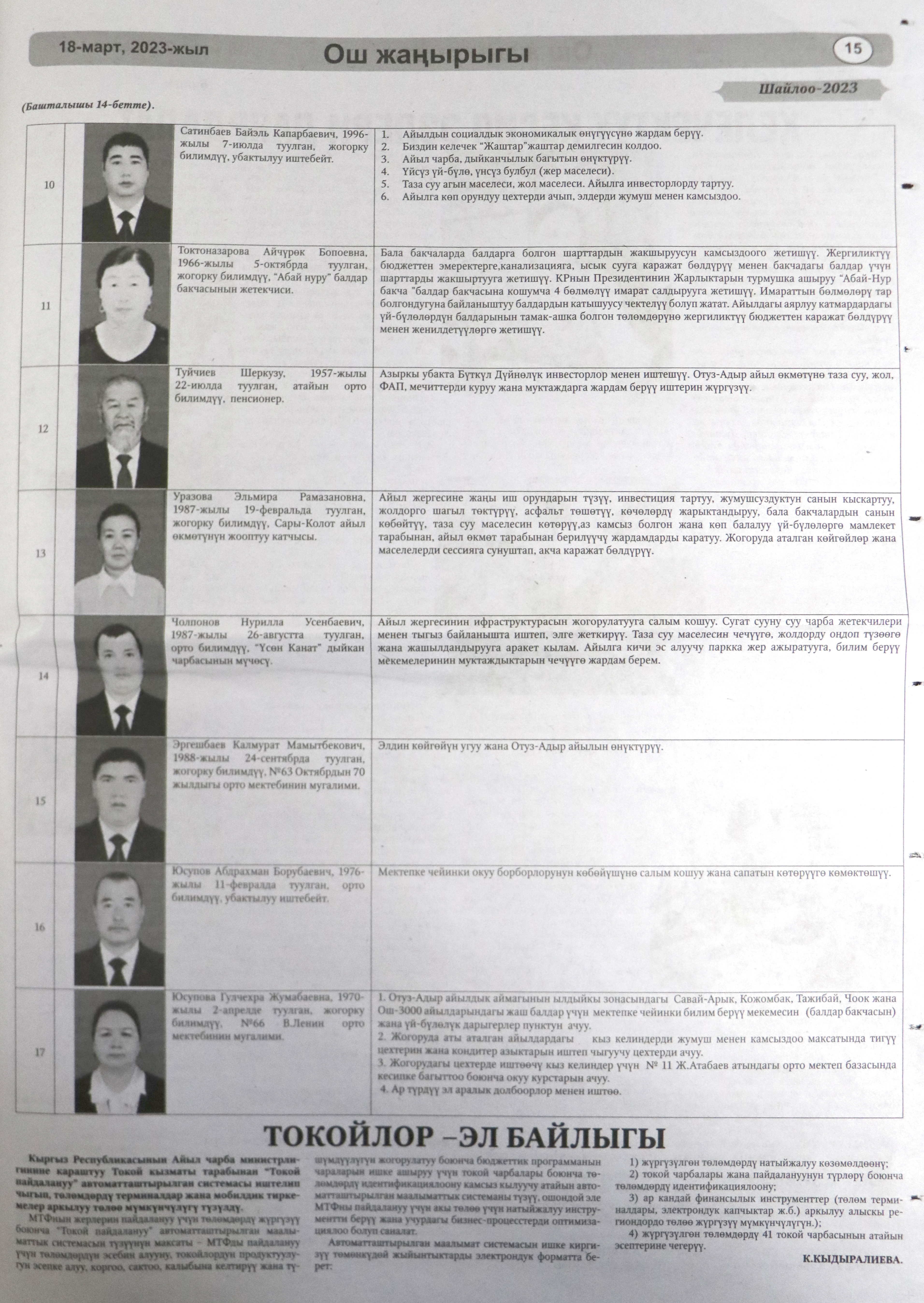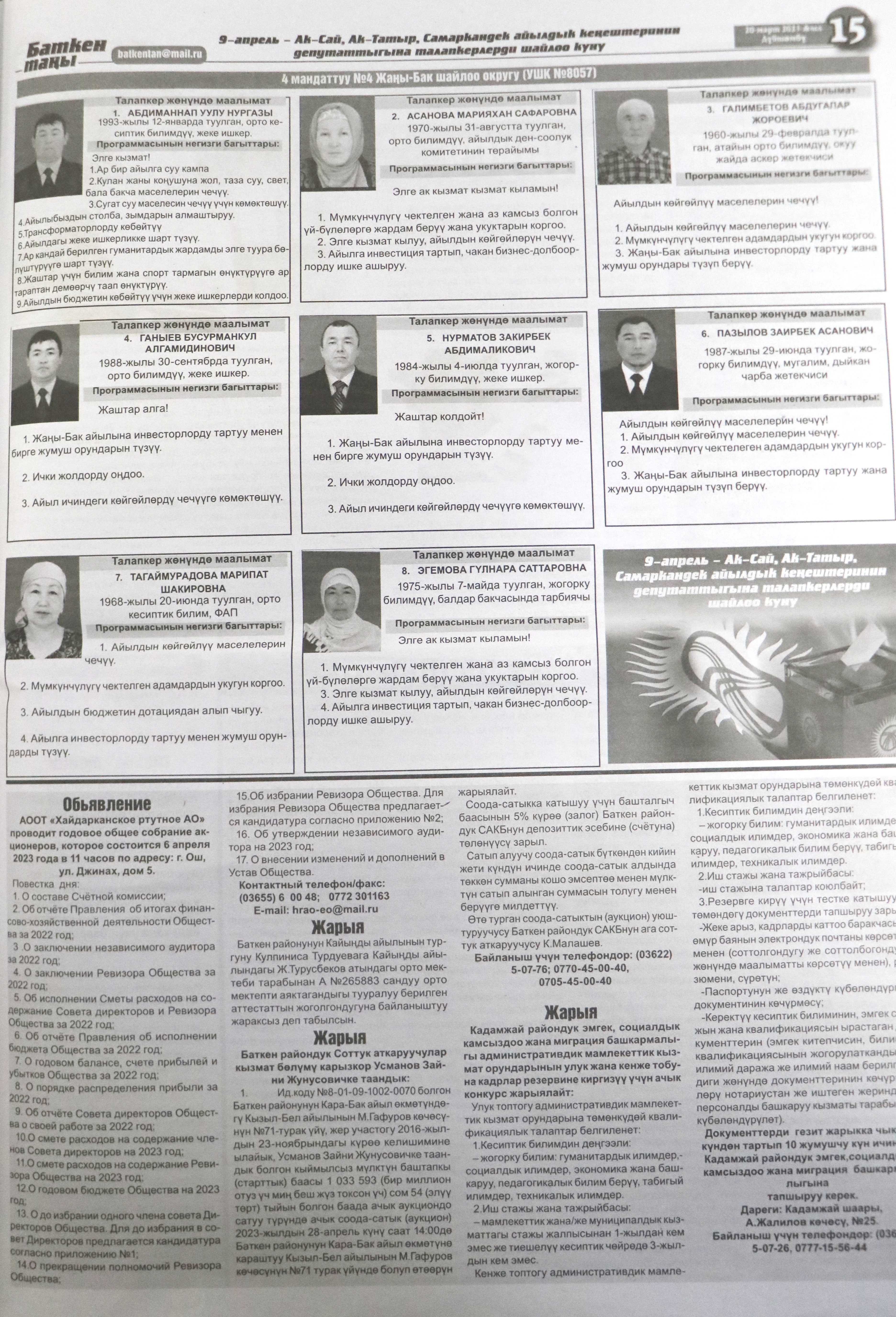 Жергиликтүү кеңештерлдин депутаттыгына талапкерлер жѳнүндѳ шайлоочуларды маалымдоо максатында БШК райондук жана облустук гезиттерде маалыматтарды жарыялаган.