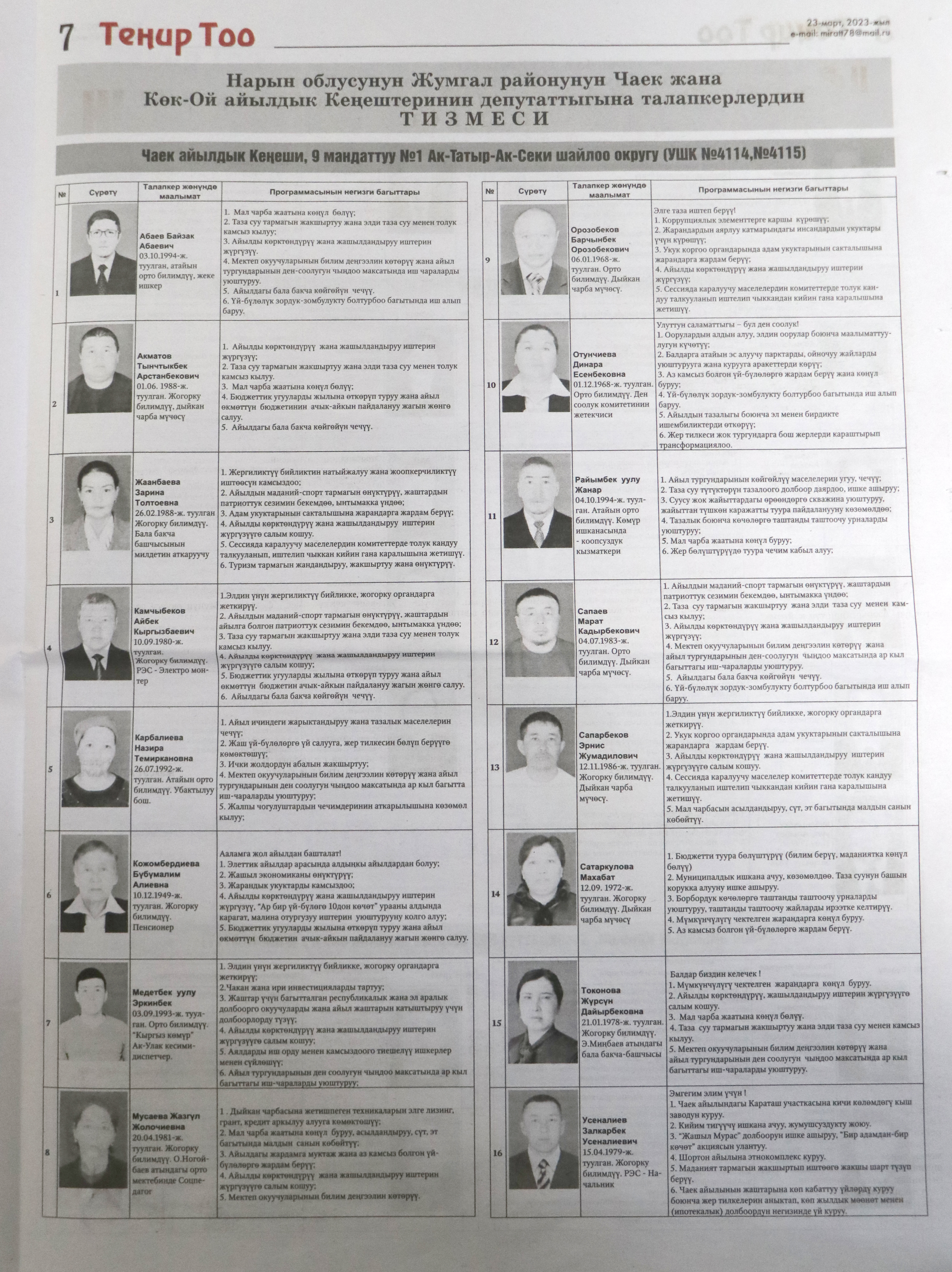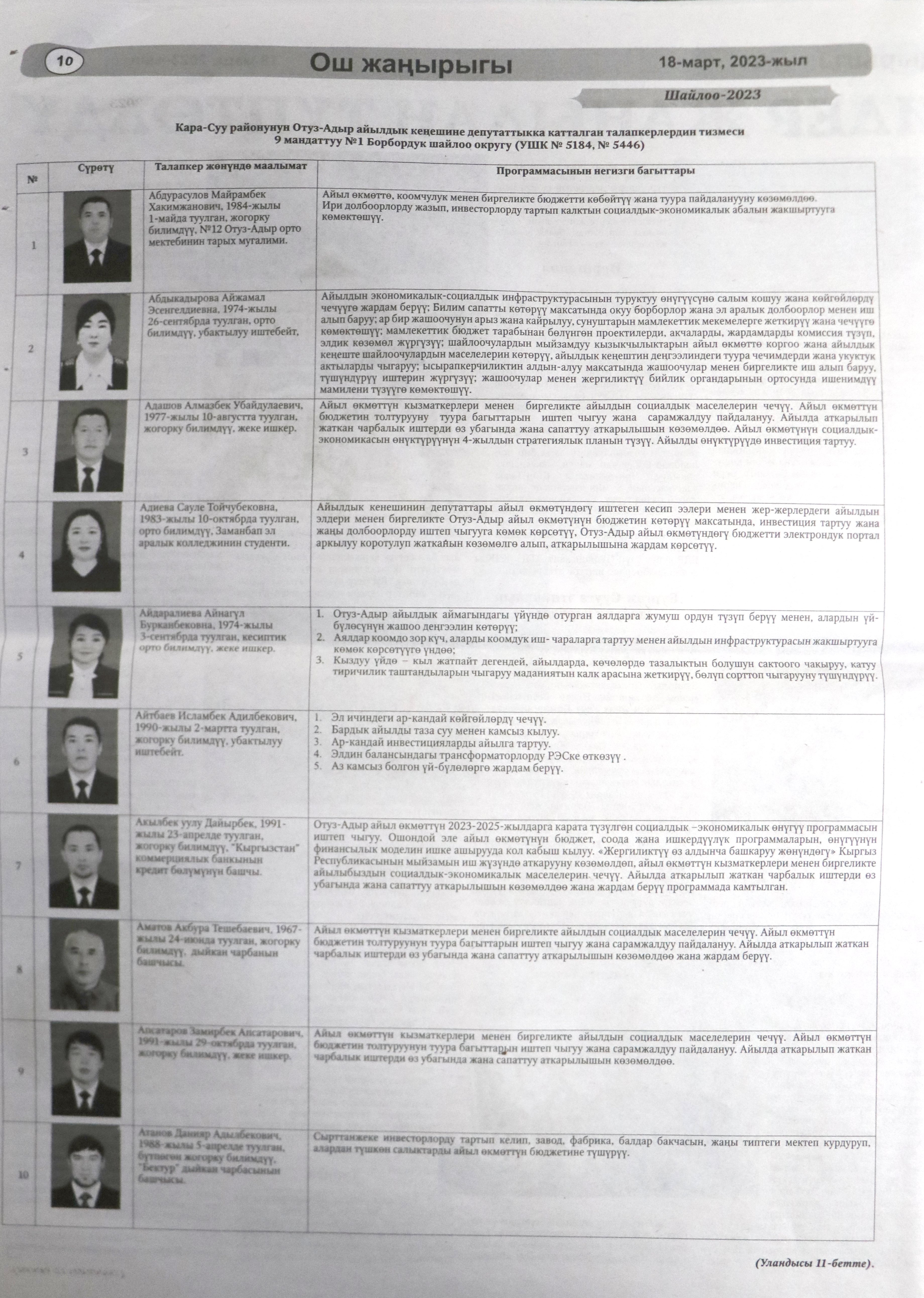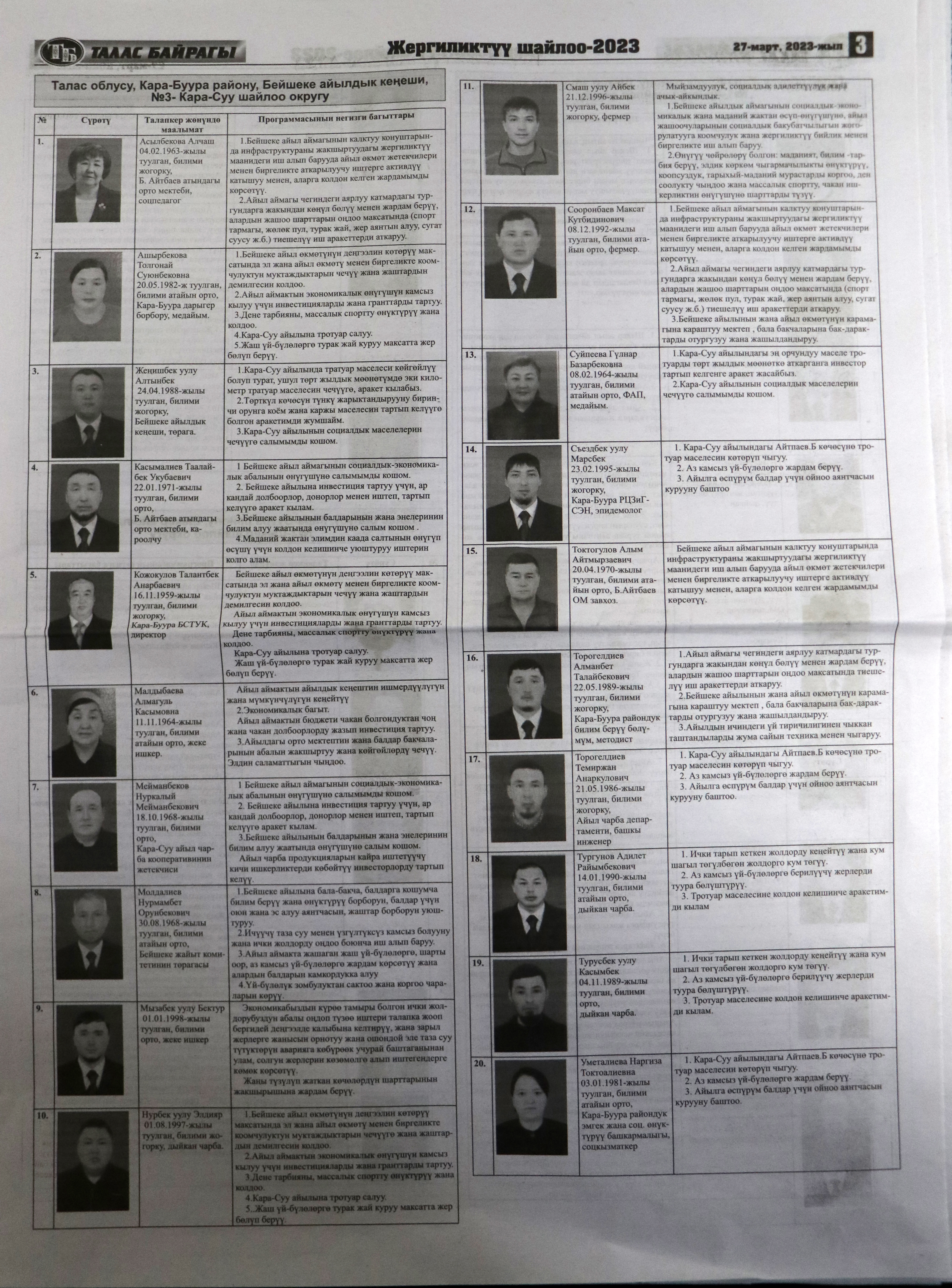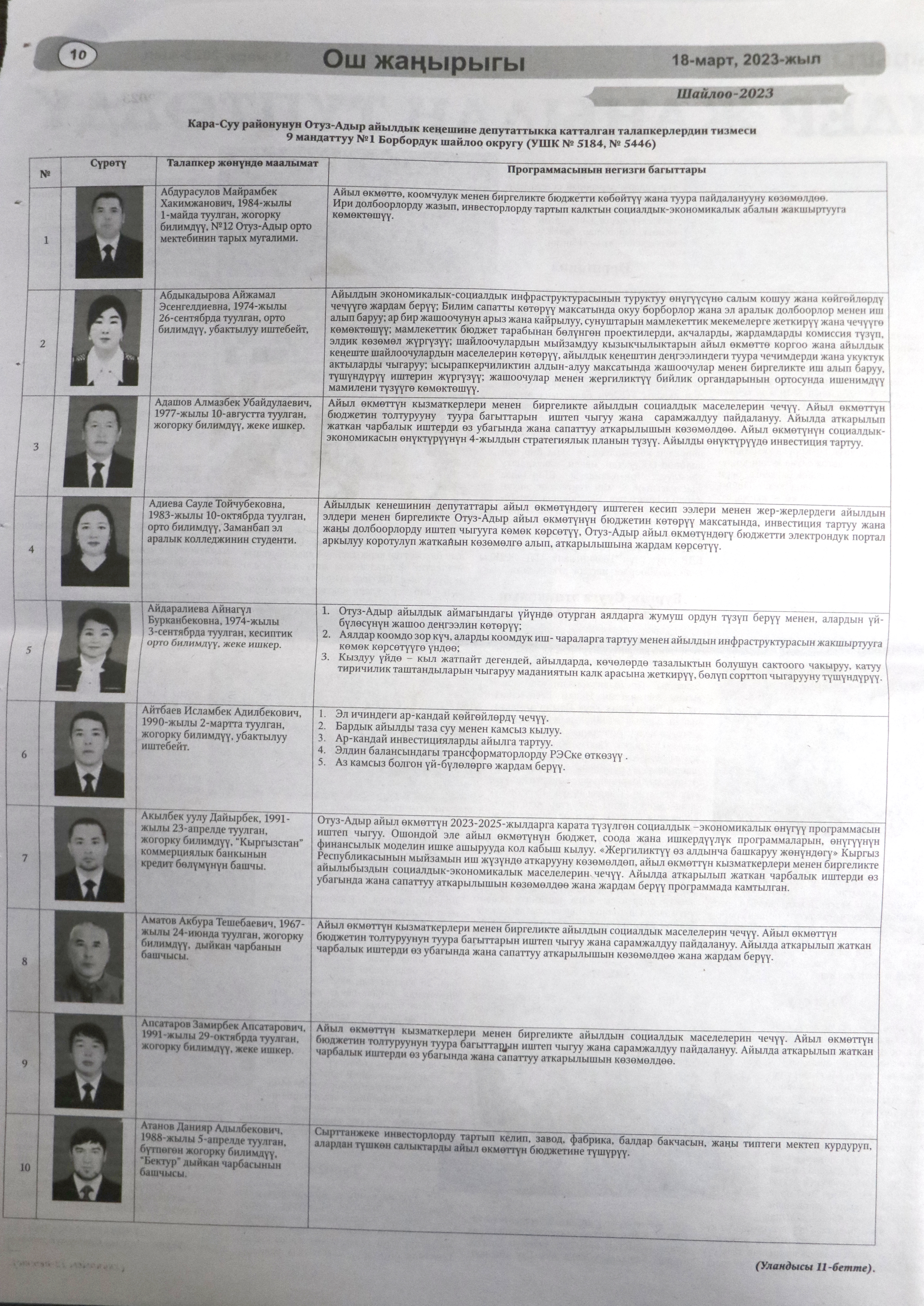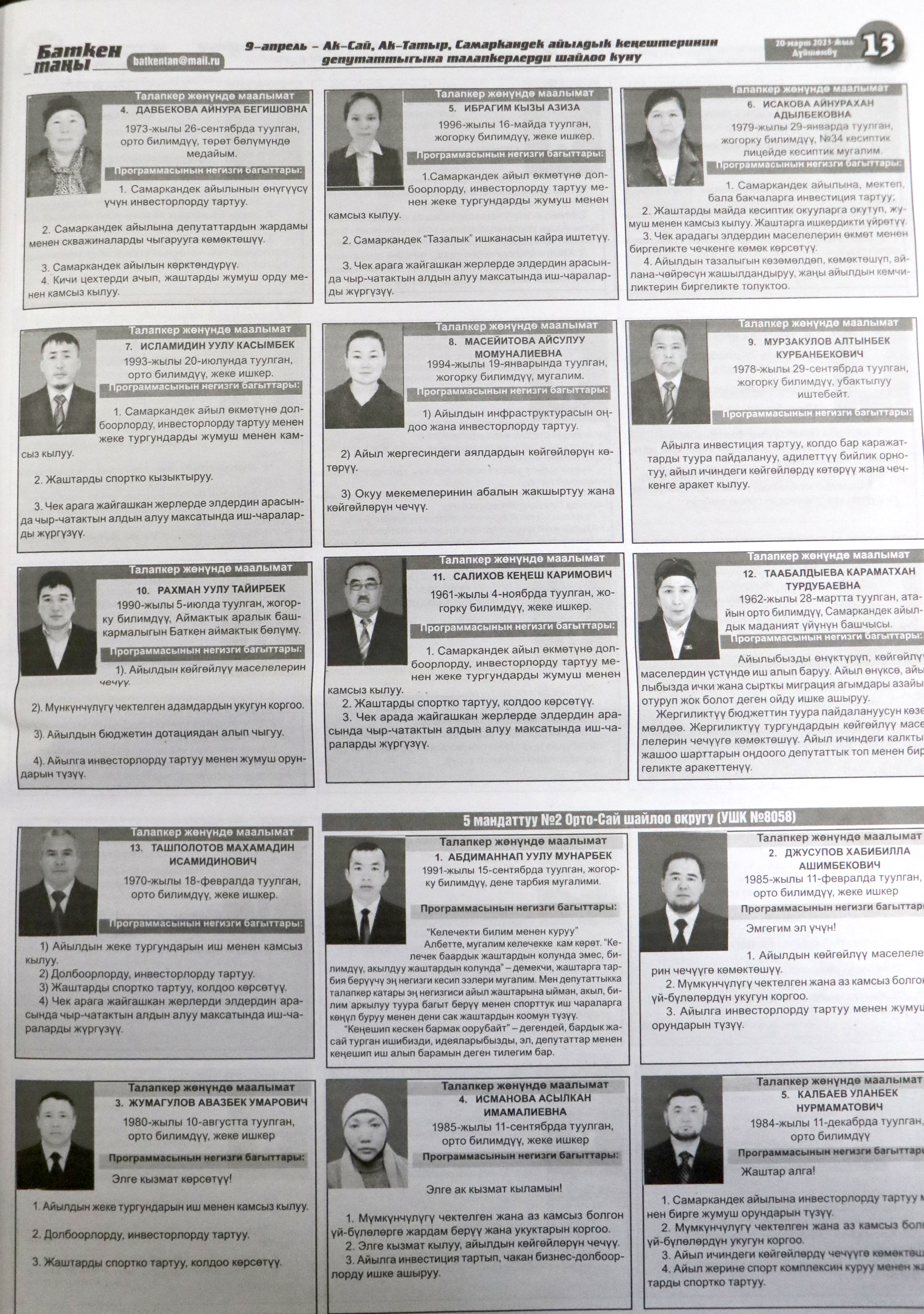 Жергиликтүү кеңештерлдин депутаттыгына талапкерлер жѳнүндѳ шайлоочуларды маалымдоо максатында БШК райондук жана облустук гезиттерде маалыматтарды жарыялаган.
