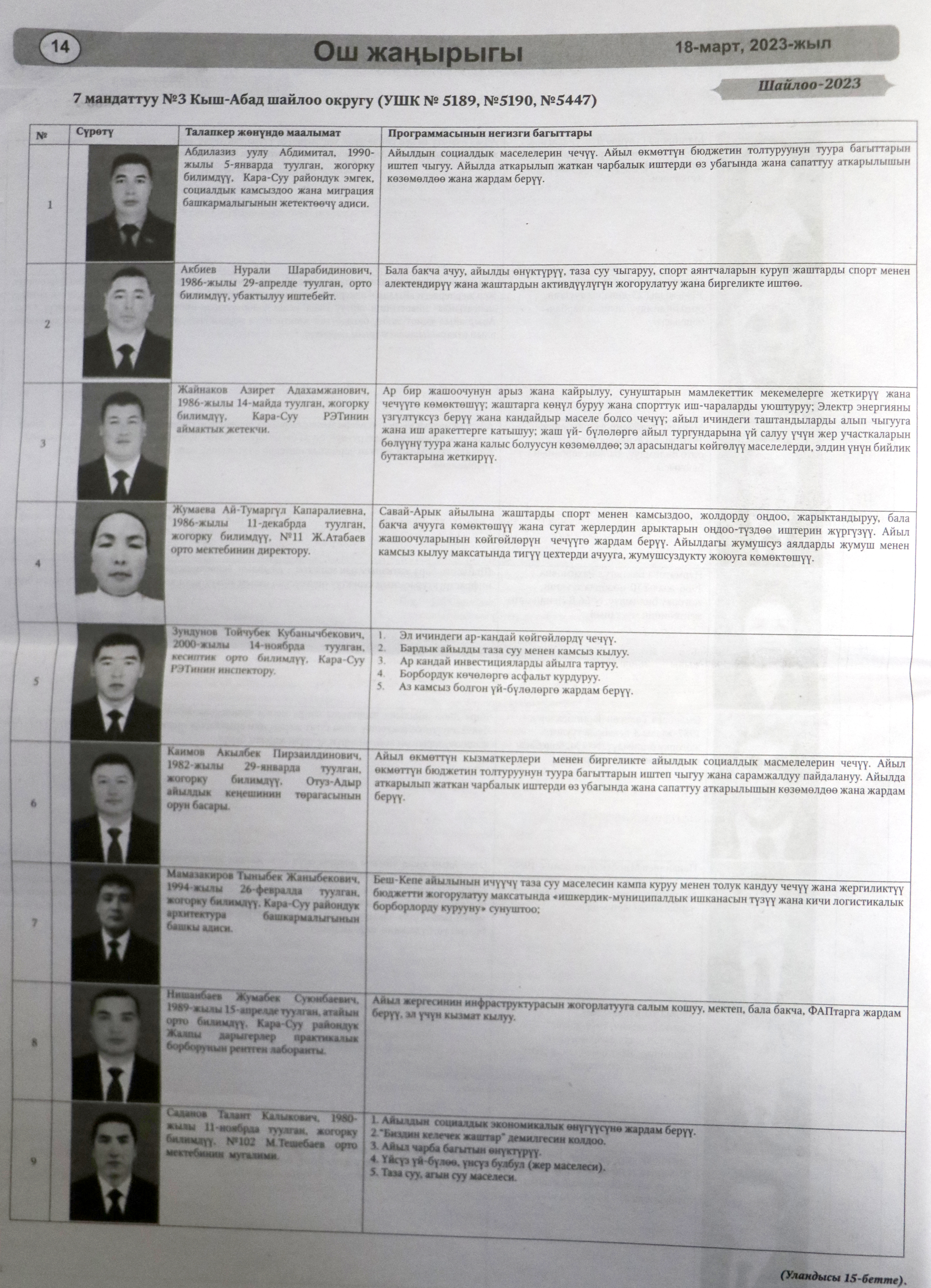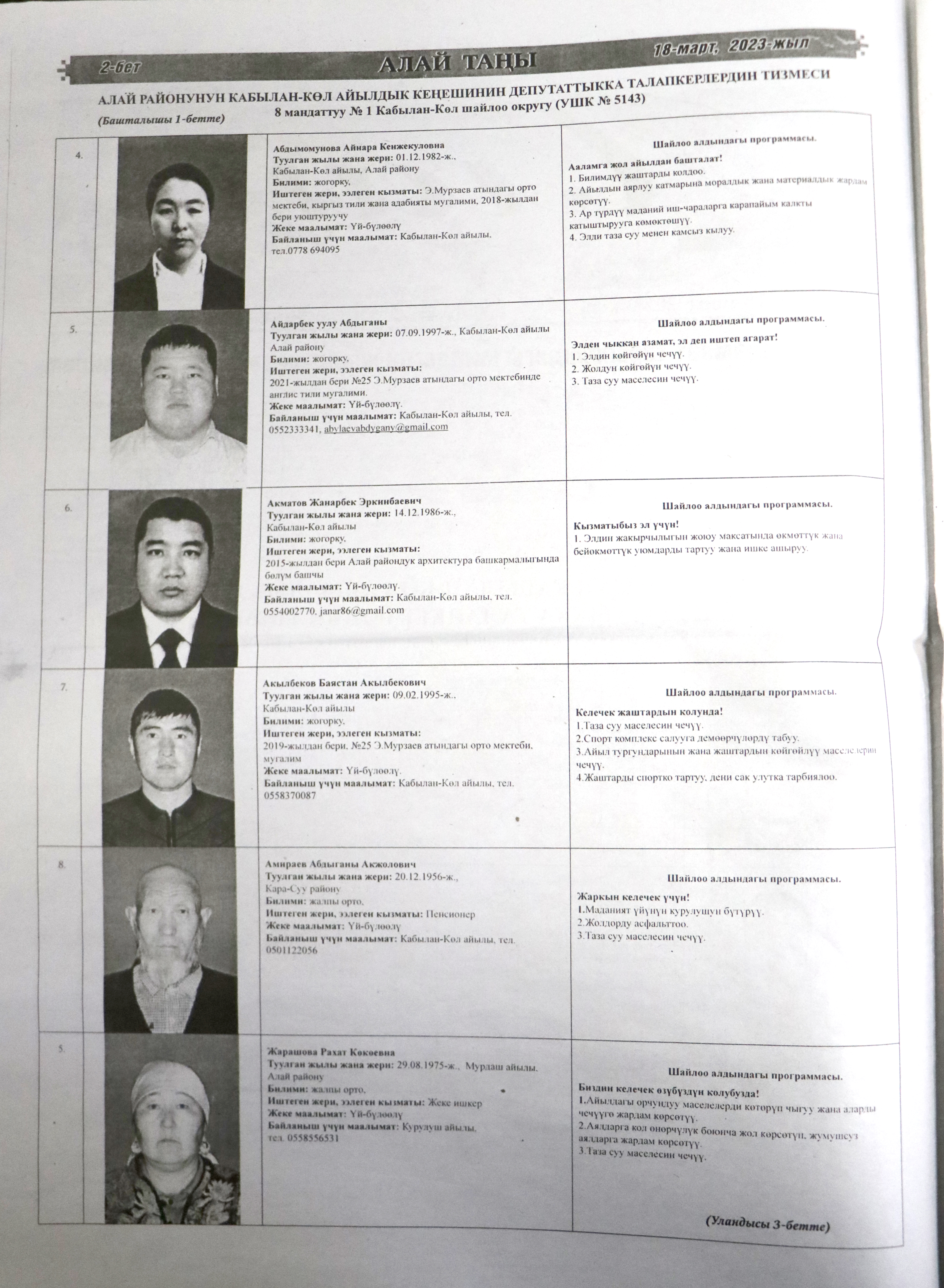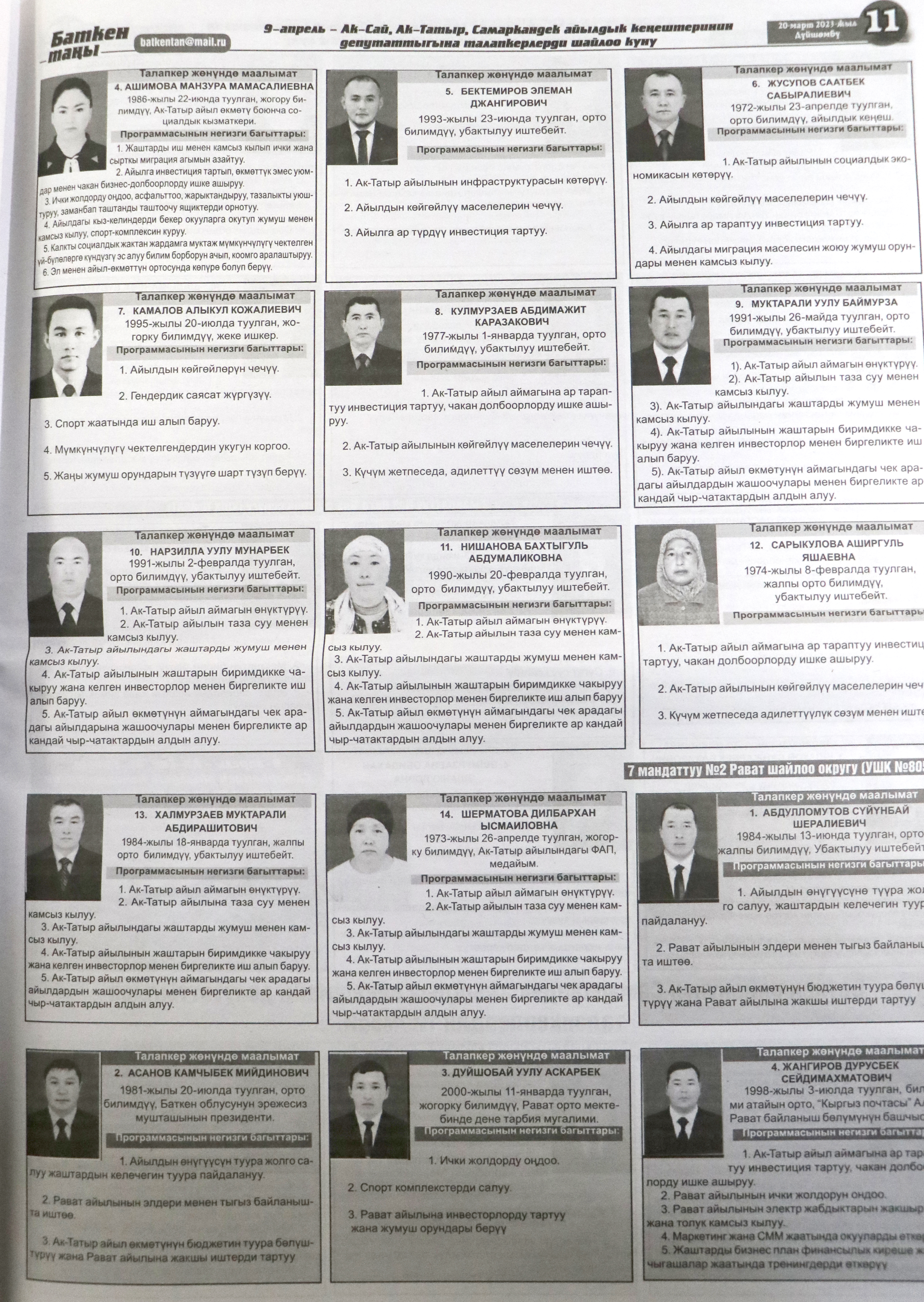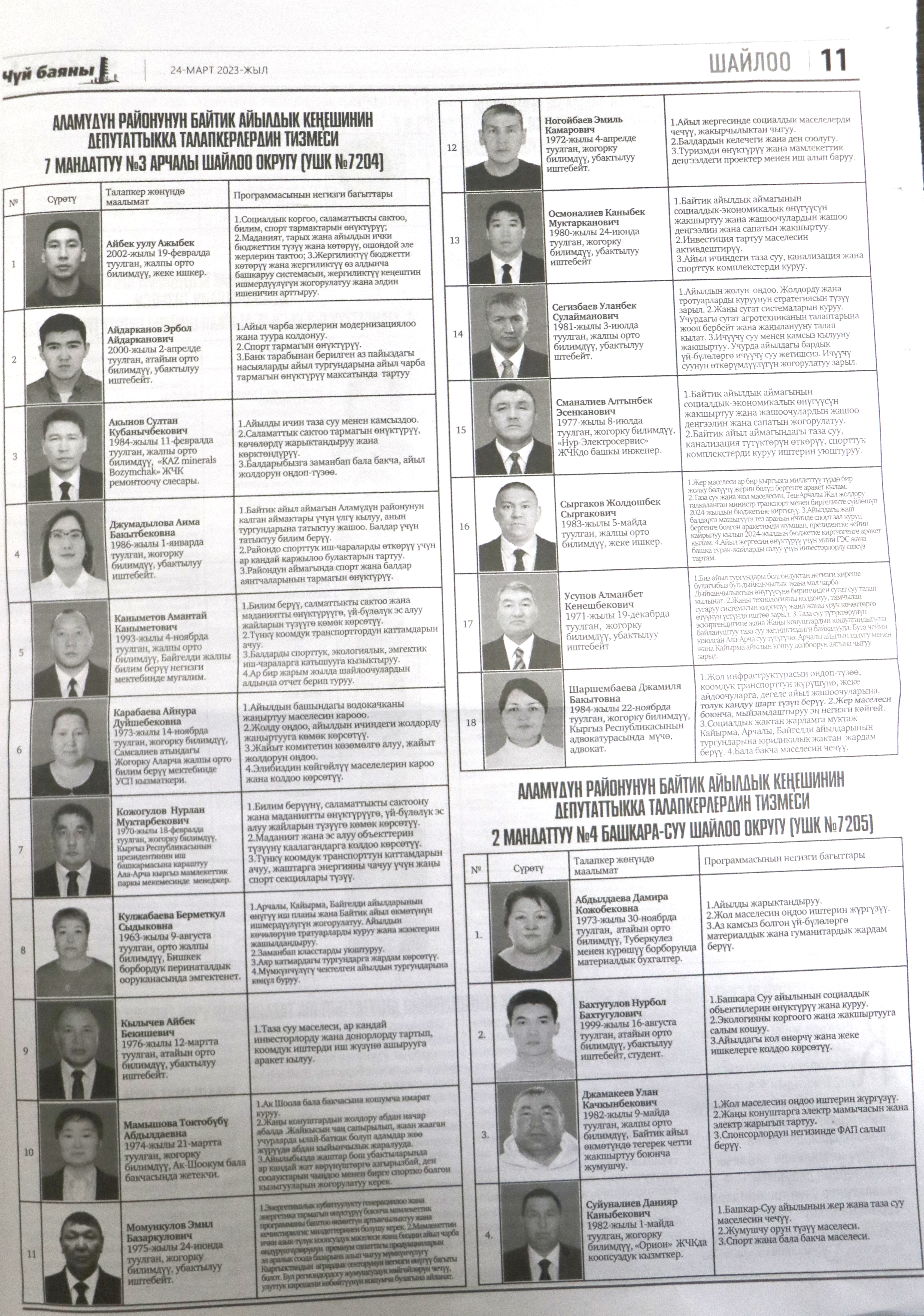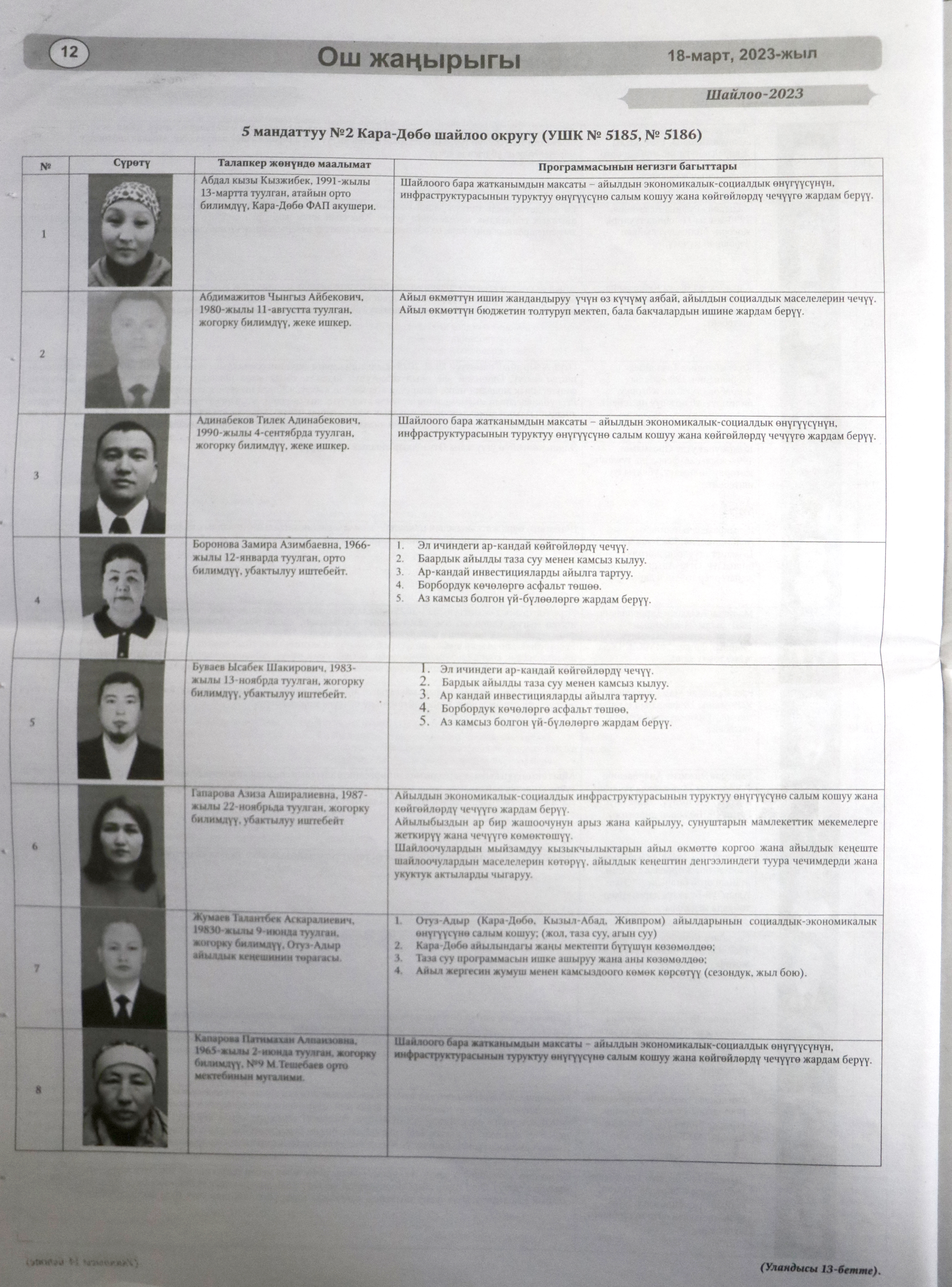 Жергиликтүү кеңештерлдин депутаттыгына талапкерлер жѳнүндѳ шайлоочуларды маалымдоо максатында БШК райондук жана облустук гезиттерде маалыматтарды жарыялаган.