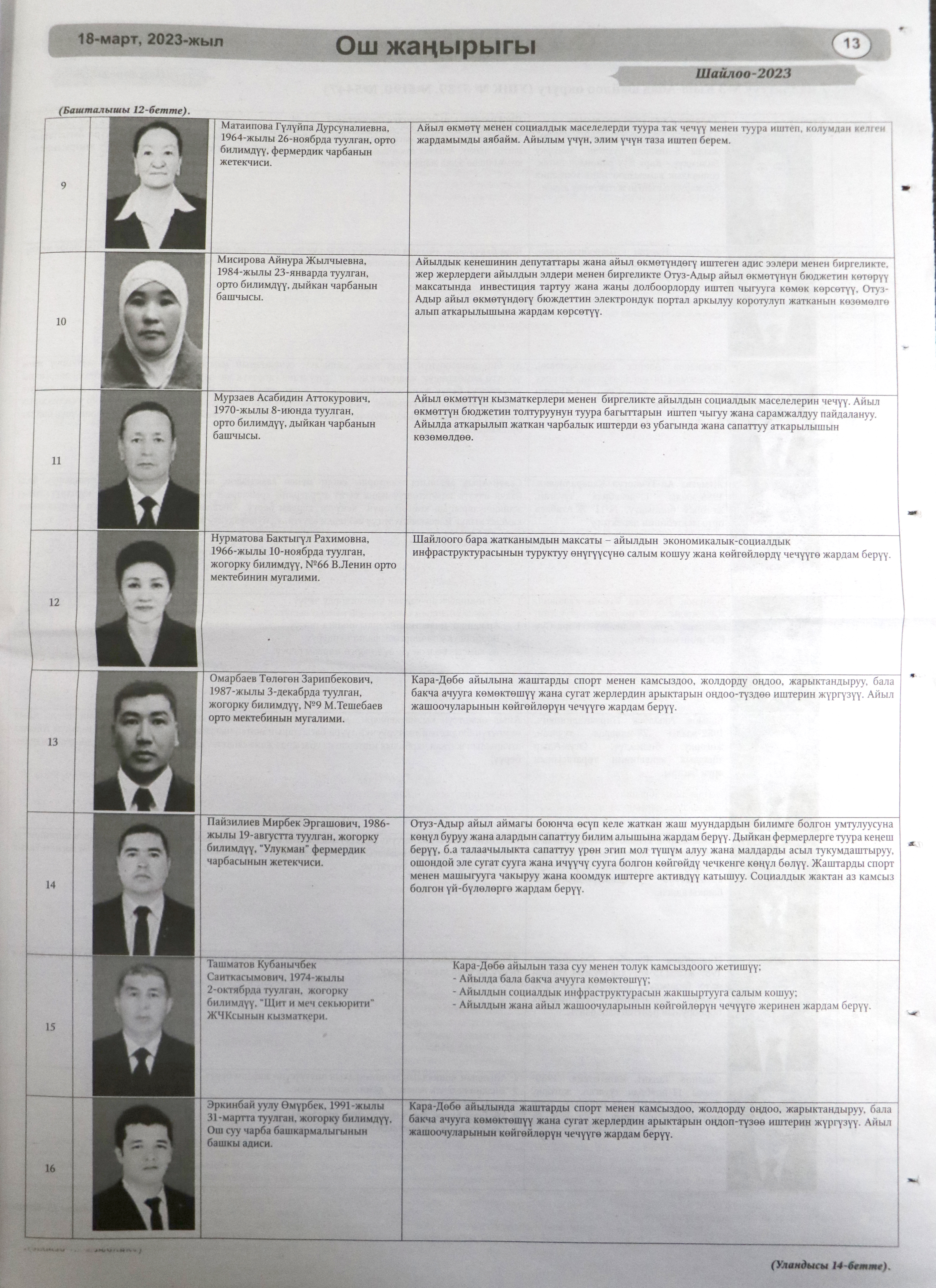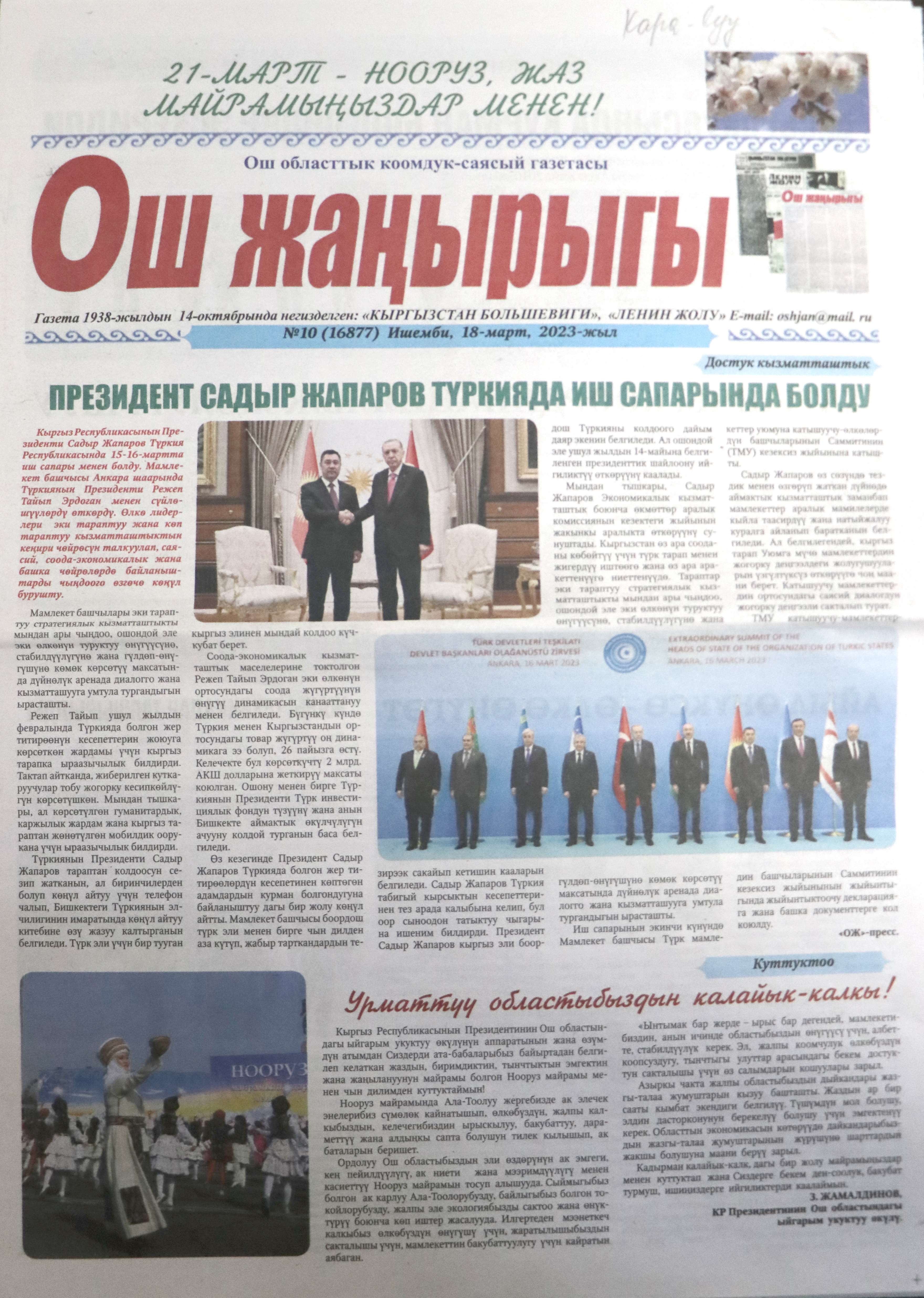 - «Ош Жаңырыгы» Ош облустук гезитти - 18.03.2023-ж. №10 (16877)