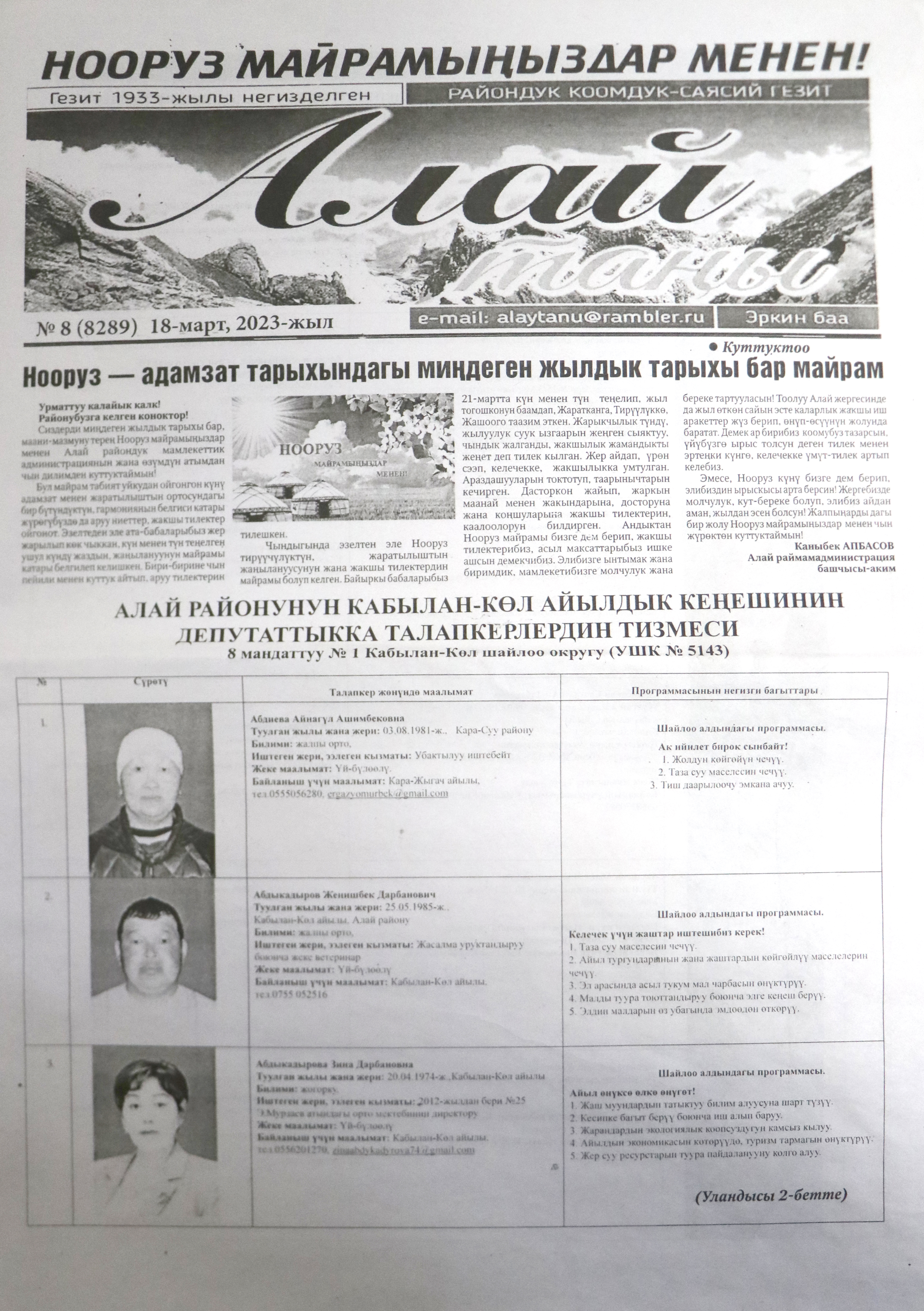 - «Алай Таңы» Алай району - 18.03.2023-ж. №8 (8289)