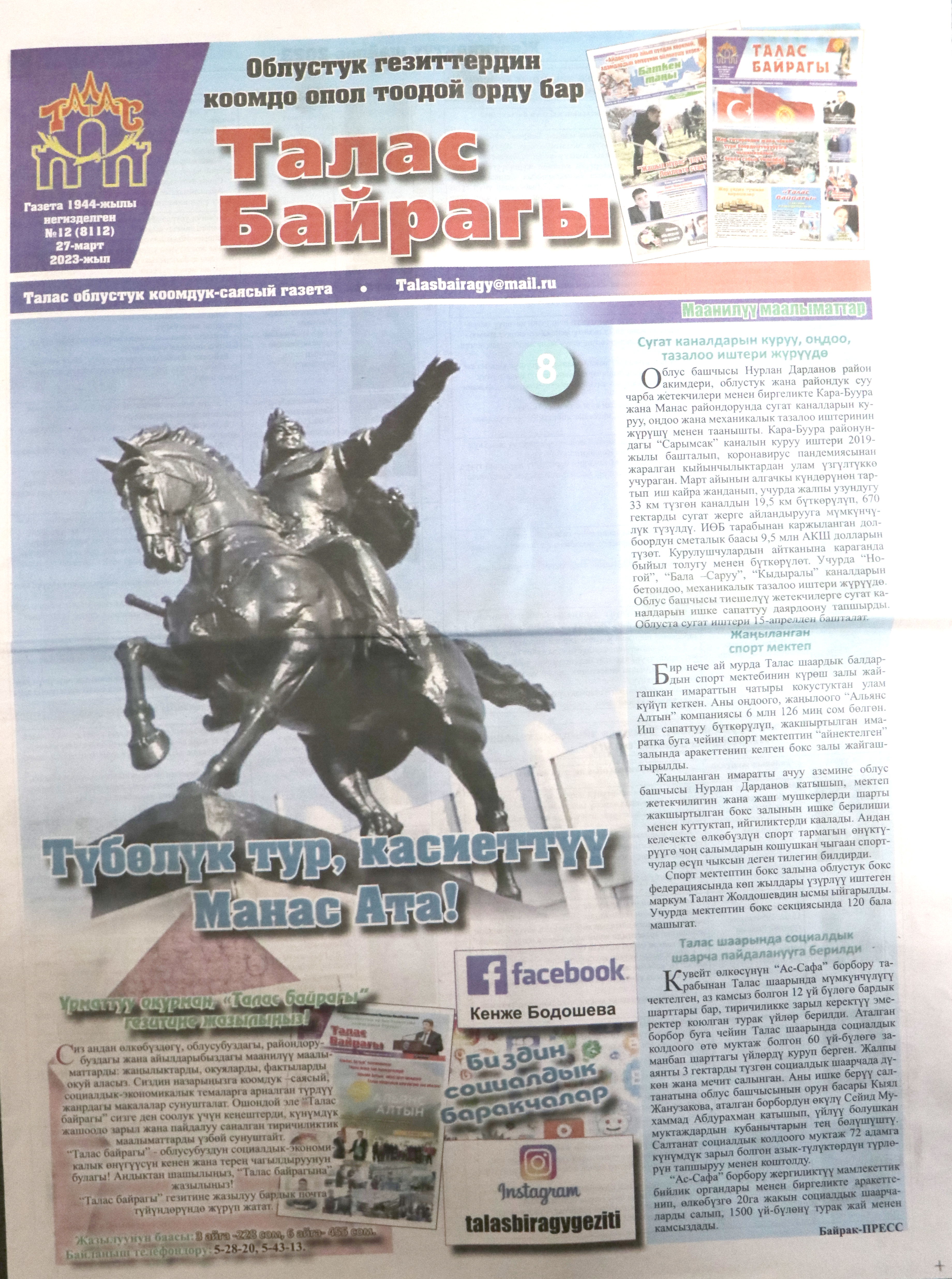 - «Талас байрагы» Талас облустук гезити - 27.03.2023-ж. №12 (8112)