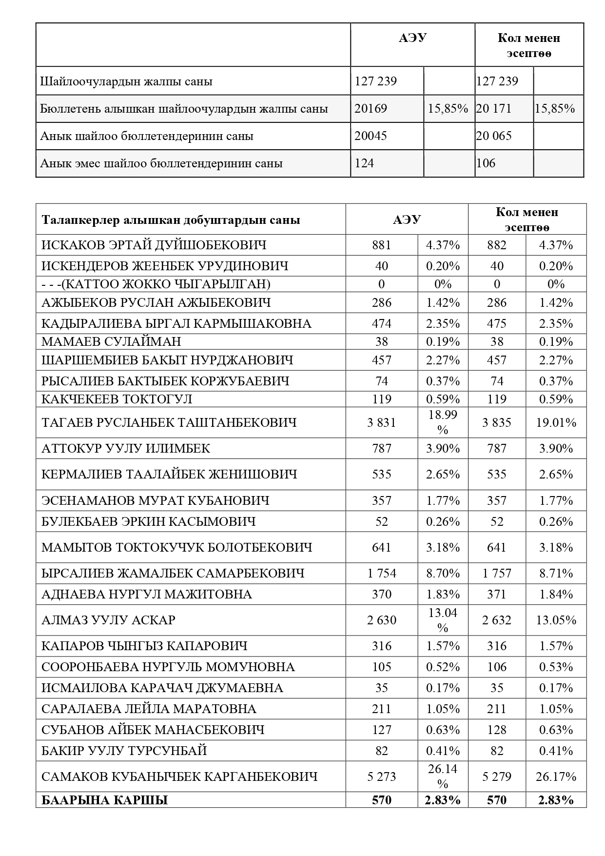№26 Ленин округу боюнча Жогорку Кеңештин депутатын кайра шайлоодо добуш берүүнүн алдын ала жыйынтыгы – АЭУ жана кол менен эсептѳѳнүн маалыматтары боюнча