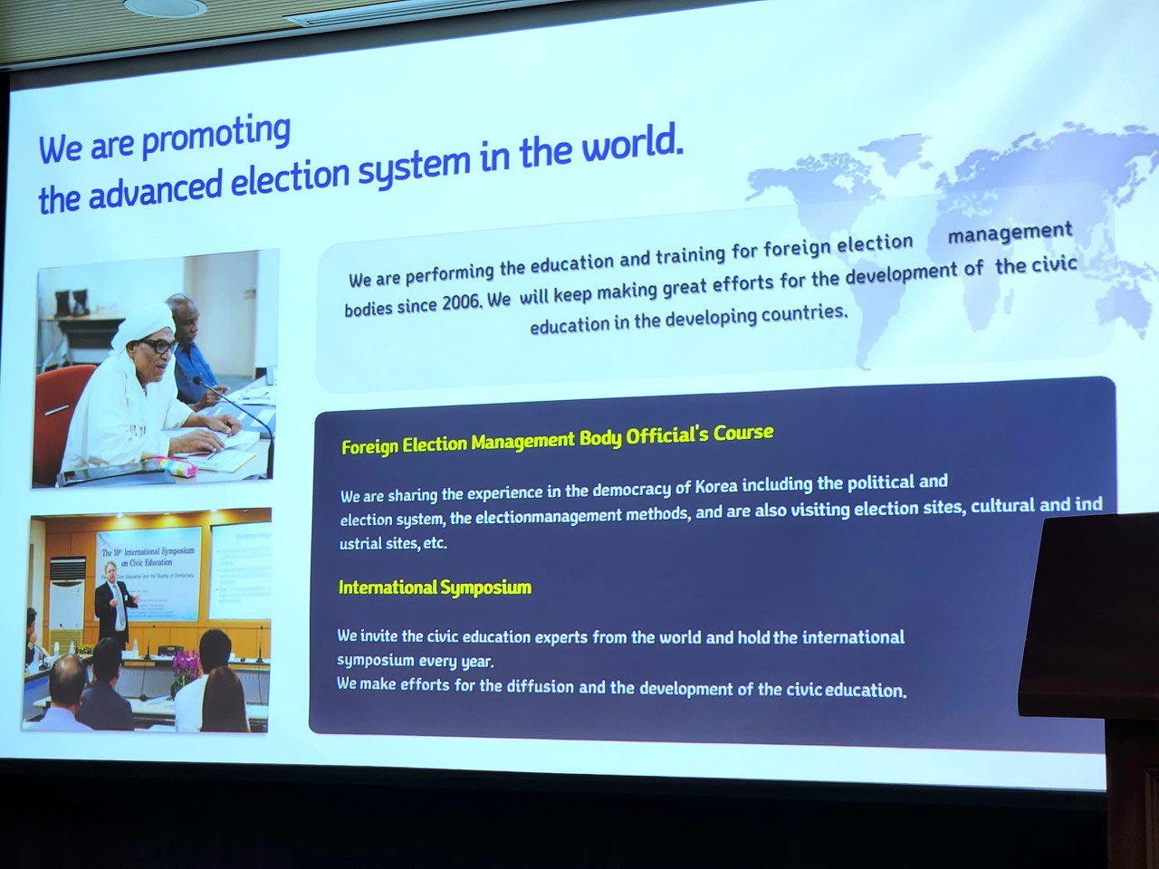Кыргыз Республикасынын Шайлоо жана референдум өткөрүү боюнча борбордук комиссиясынын делегациясы Кореянын Борбордук шайлоо комиссиясына караштуу Кореянын Жарандык билим берүү борборуна барды, Борбор жарандарды шайлоо маселеси боюнча кеңири маалымдоо жана окутуу программасын ишке ашырат. Кореянын Борбордук шайлоо комиссиясына караштуу Жарандык билим берүү борбору мектеп окуучулары, студенттер, шайлоого биринчи жолу катышып жаткан жаштар үчүн курстарды, ошондой эле болочок талапкерлер үчүн саясий лидерлик курстарын жана башкалар үчүн курстарды өткөрөт. Жарандык билим берүү борбору 1992-жылы түзүлгөн жана Кореяда демократиянын жана адам укуктарынын баалуулуктарын жайылтууга кѳмѳктѳшкѳн белгилүү институтка айланган.