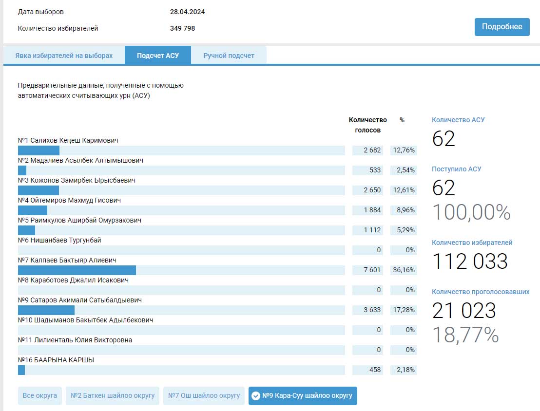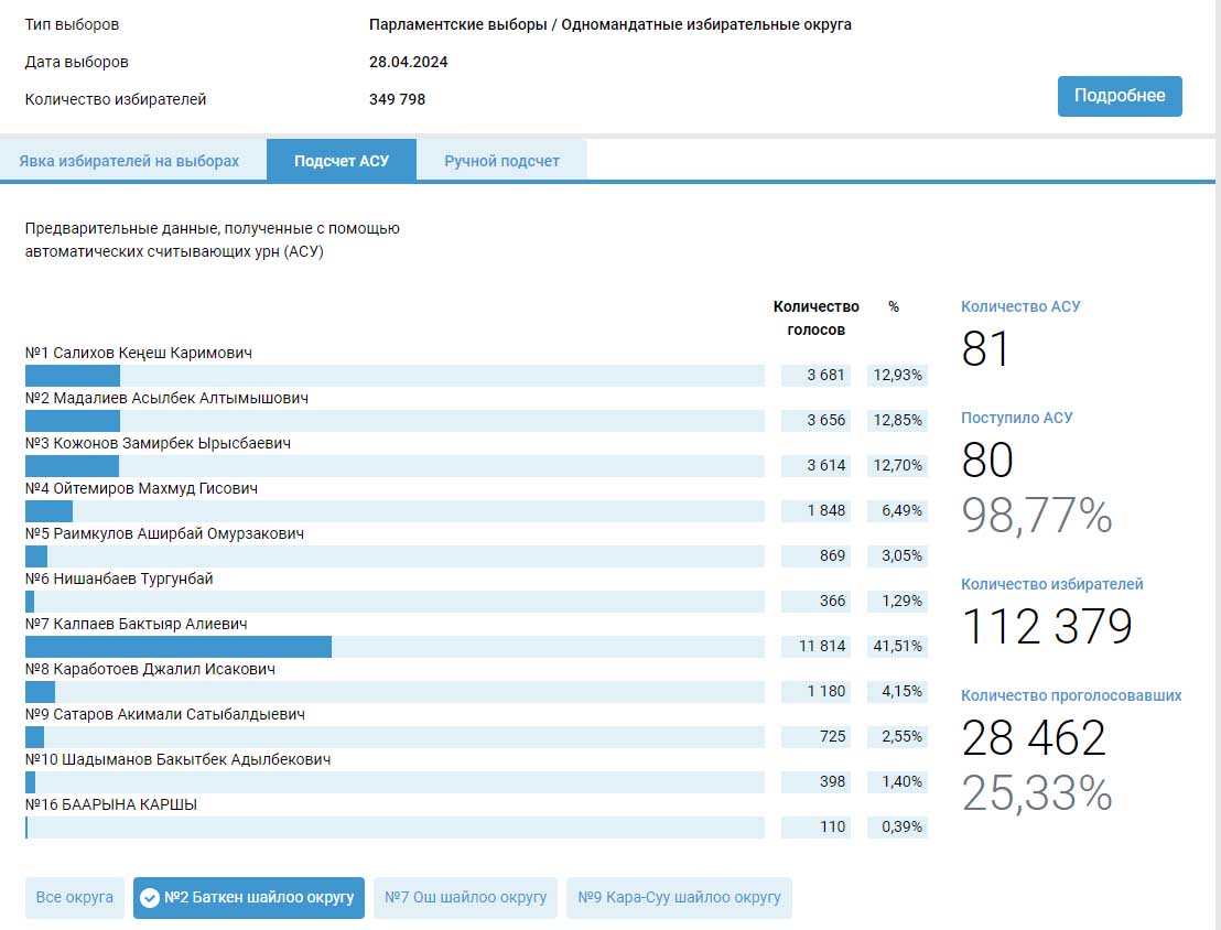 Баткен, Ош жана Кара-Cуу шайлоо округдары боюнча Жогорку Кеңешинин депутаттарын мөөнөтүнөн мурда шайлоодо добуш берүүнүн алдын ала жыйынтыктары - 2024-жылдын 28-апрелинде саат 20:40ка карата 198 участоктун 197нен (99,5%) алынган АЭУ маалыматтары боюнча
