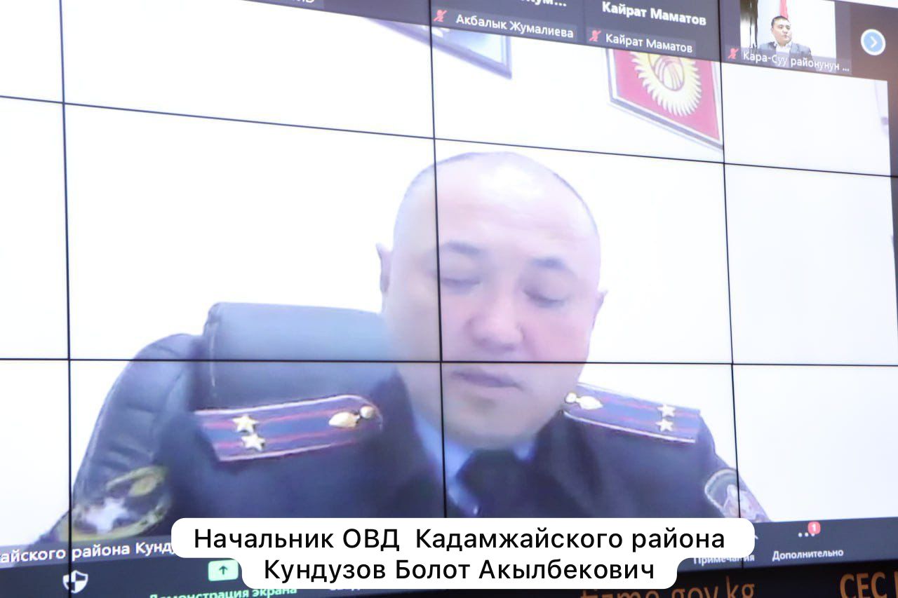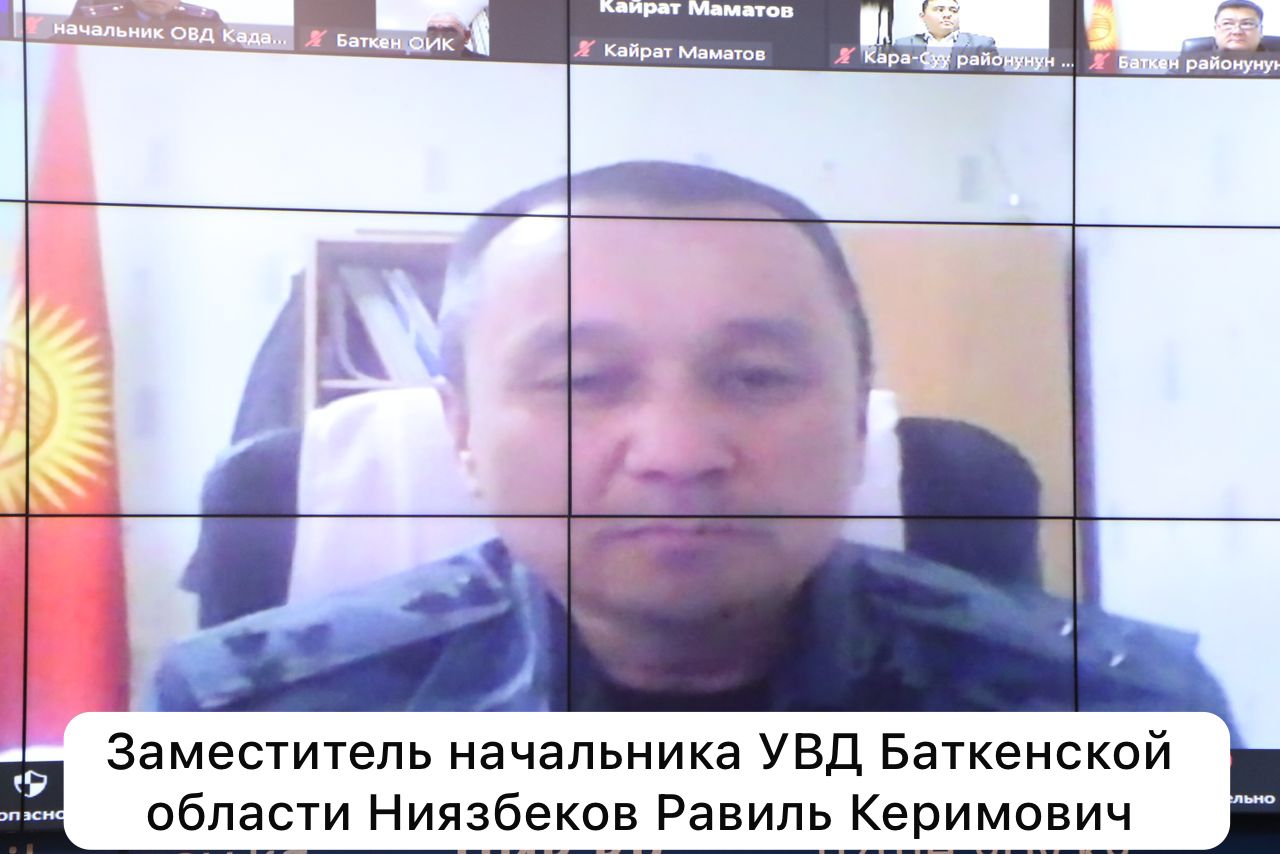 Жыйынга Кыргыз Республикасынын Ички иштер министрлигинин төмөнкү өкүлдөрү: Кыргыз Республикасынын ИИМдин Тергөө кызматынын бөлүм башчысы Макилов Султан Бейшенбекович, анын орун басары Эшимкан уулу Нурдин, Баткен областынын ички иштер башкармалыгынын начальниги Кундузов Болот Акылбекович, анын орун басары Ниязбеков Равиль Керимович, Ош ОИИБнын тергөө кызматынын башчысы Тургуналиев Канат Аскарбекович, анын орун басары Нуралиев Тынчтыкбек Кадырович, Кара-Суу районунун ИИБдин башчысынын орун басары Мусаев Максат Абдыкаимович катышты.