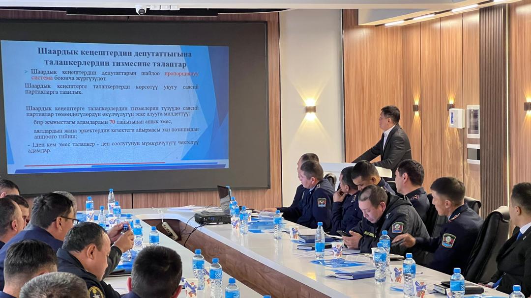 КР БШКсы Ички иштер министрлигинин өкүлдөрү С. Макилов, М. Ажыгулов жана Башкы прокуратуранын өкүлү Т. Атабаев менен биргеликте окуу өткөрдү. Шайлоо процессинин мыйзамдуулугун жана коопсуздугун камсыздоо үчүн тартылган адамдардын ишинде мыйзамды бирдей колдонушун камсыздоо максатында, алар укук коргоо органынын кызматкерлерин төмөнкүлөр менен тааныштырышты: