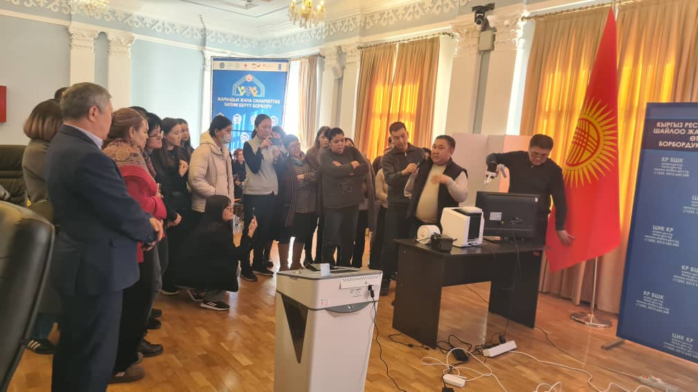 Тренингдин катышуучуларына биометрикалык идентификациялоо, автоматтык эсептөөчү урналар (АЭУ) аркылуу добуштарды эсепке алуу жана БШКнын борбордук серверинде добуш берүүнүн жыйынтыктарын жыйындылоо боюнча жабдуу кандай иштээри көрсөтүлдү. Алдыда турган шайлоодо колдонулуучу идентификациялоонун жаңы комбинирленген түзүлүшүнүн аркасында бир нече аппараттарды пайдалануу кыскарат жана биометрикалык маалыматтар – бети жана манжалардын тактары боюнча идентификациялоо мүмкүнчүлүгү келип чыгат. Түзүлүш электрондук документтерди кошуп алганда, паспорттордон маалыматтарды окууга жана идентификацияланган шайлоочулар үчүн гана бюллетендерди басып чыгарууга да мүмкүнчүлүк түзөт, бул басып чыгарууга жана жеткирип берүүгө каражаттарды жана ресурстарды олуттуу үнөмдөйт.