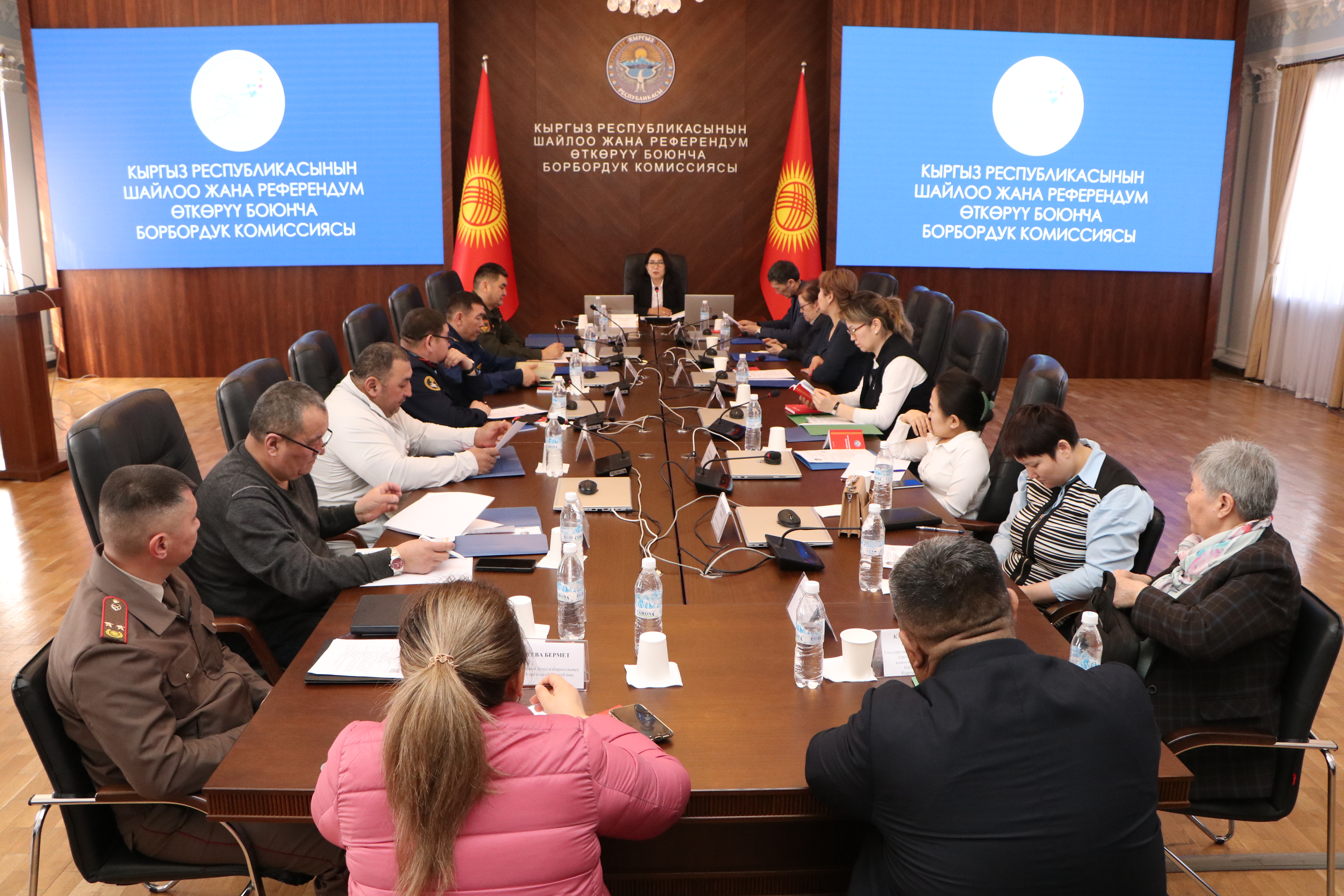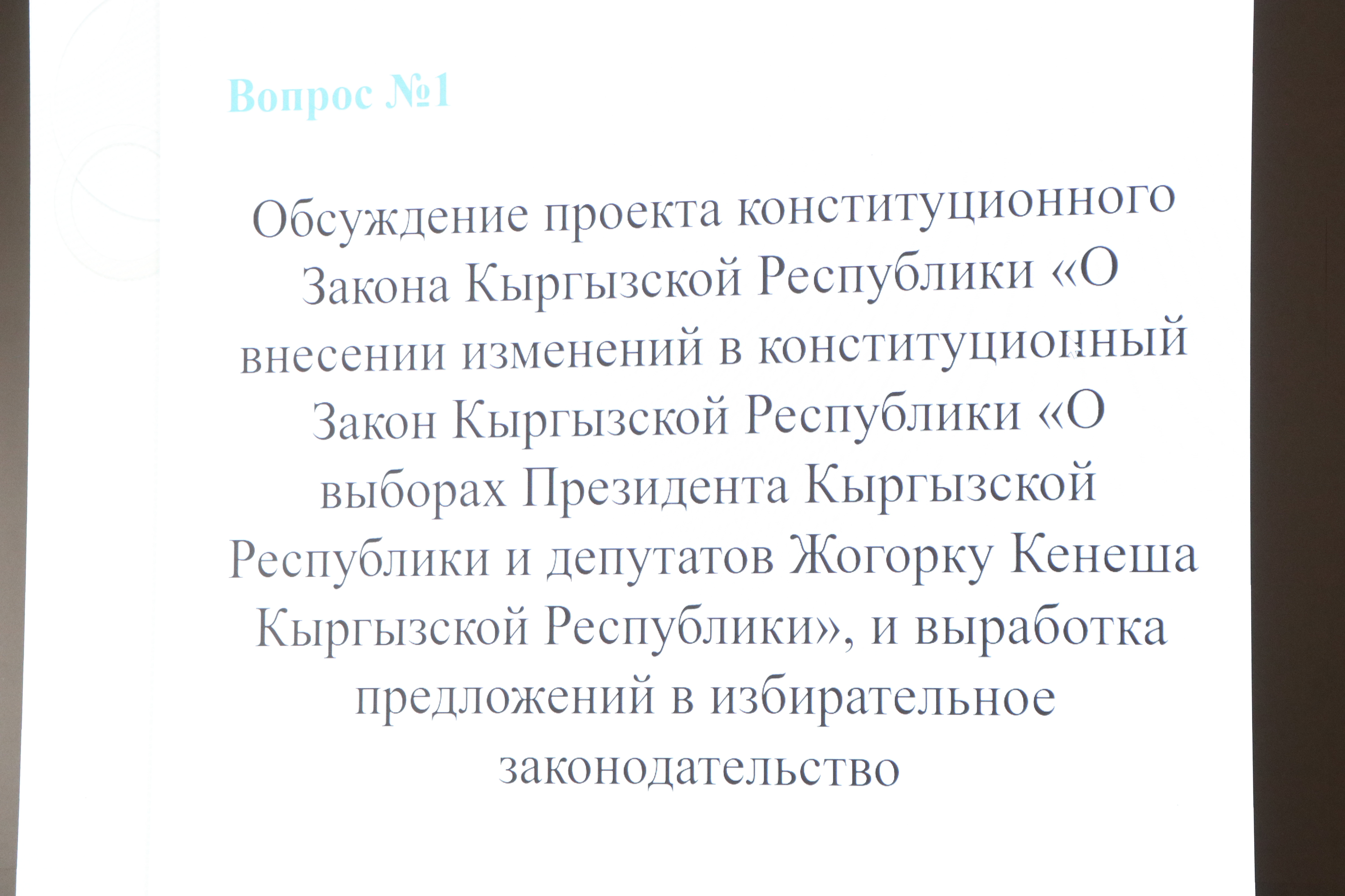Жыйында "Кыргыз Республикасынын Президентин жана Кыргыз Республикасынын Жогорку Кеңешинин депутаттарын шайлоо жөнүндө" Кыргыз Республикасынын конституциялык Мыйзамына өзгөртүүлөрдү киргизүү долбоору, ЕККУ/ДИАУБ Миссиясынын айрым шайлоочулар категориясынын шайлоо укуктарын ишке ашыруу боюнча сунуштары, ошондой эле жумушчу топтун иш планын карашты.