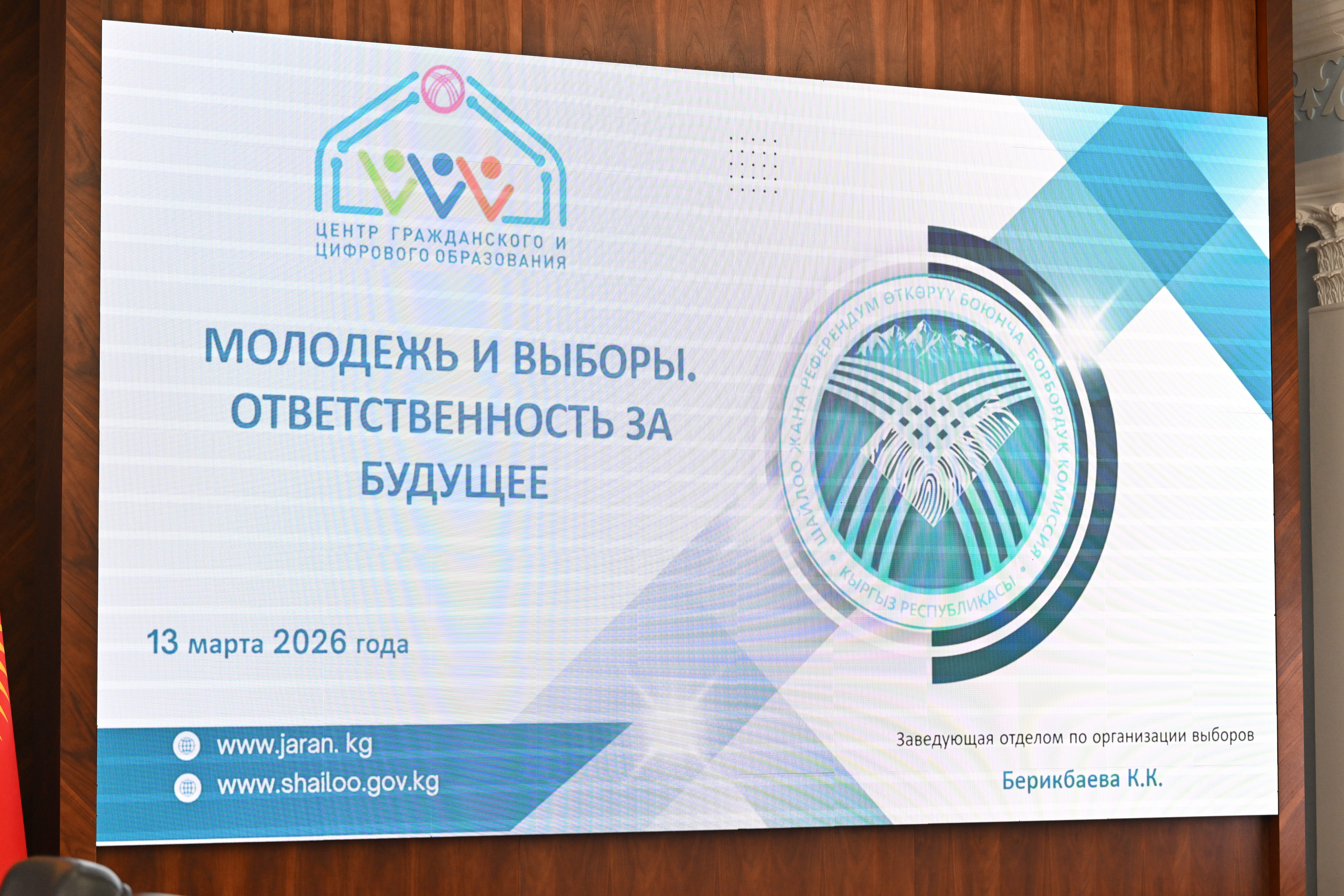 КР БШКнын шайлоону уюштуруу бөлүмүнүн башчысы Керемет Берикбаева катышуучуларды Кыргыз Республикасындагы шайлоо процесстеринин өзгөчөлүктөрү жана шайлоону өткөрүүнүн негизги этаптары менен тааныштырды. Өзгөчө көңүл шайлоо процессин санариптештирүү маселелерине бурулду.