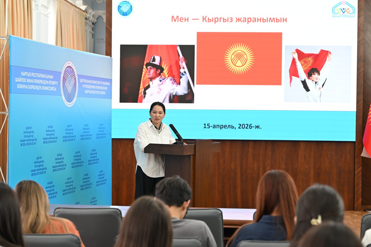 Бүгүн, 15-апрелде Шайлоо жана референдум өткөрүү боюнча борбордук комиссиясы Жарандык билим берүү жана шайлоо технологиялары борбору менен биргеликте Эл аралык Ала-Тоо университетинин (МУА) студенттери менен маалыматтык-билим берүү жолугушуусун өткөрдү.