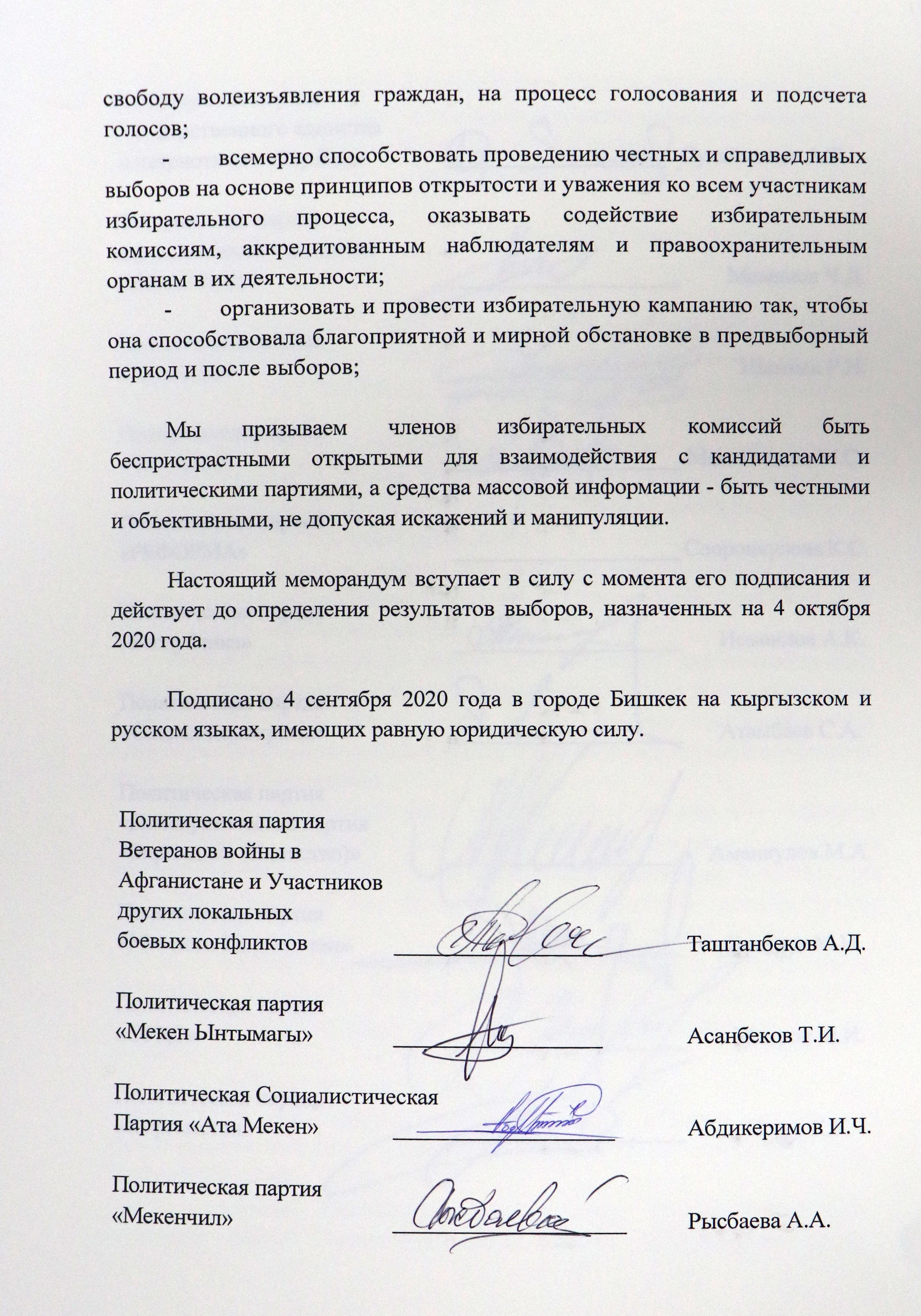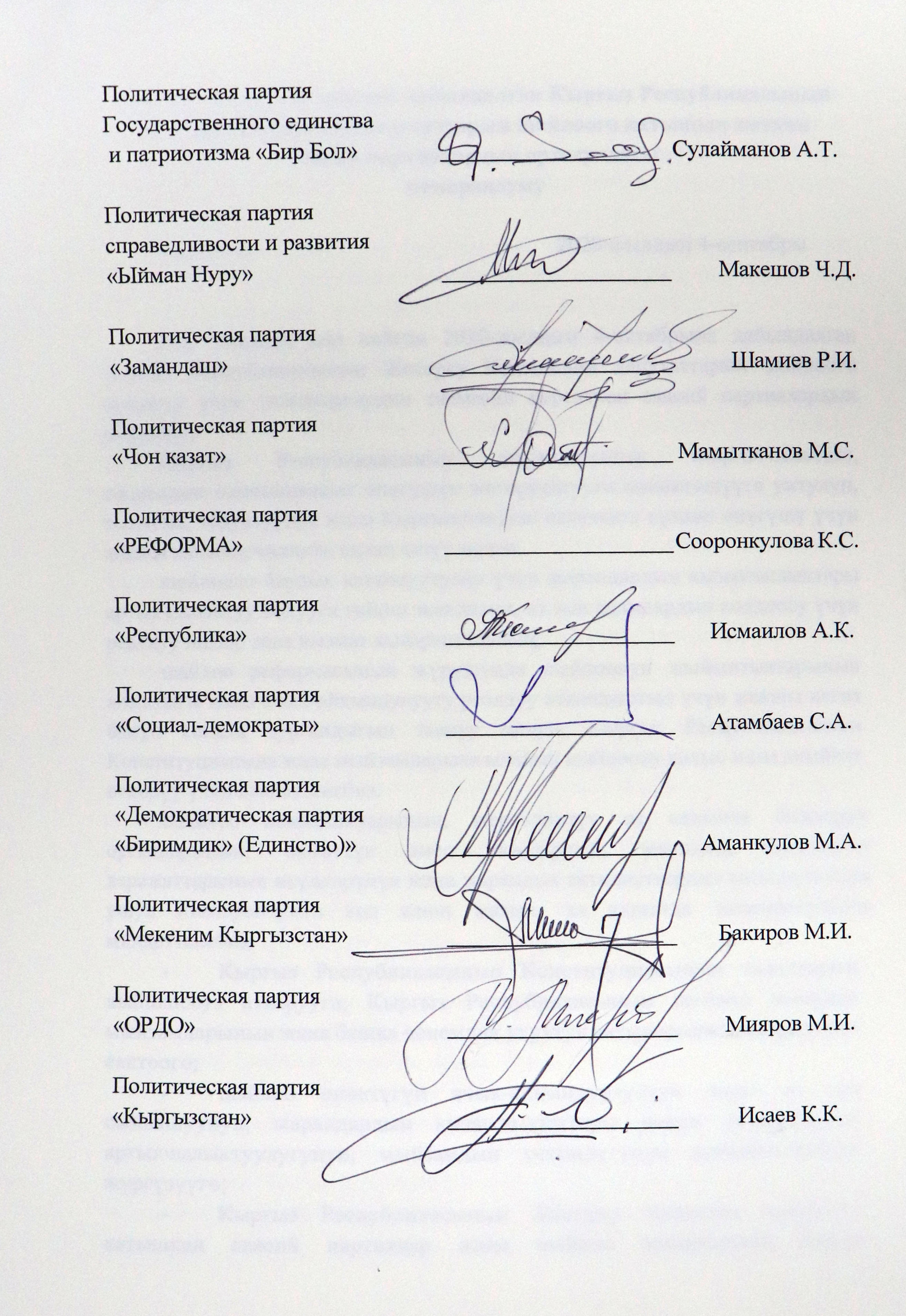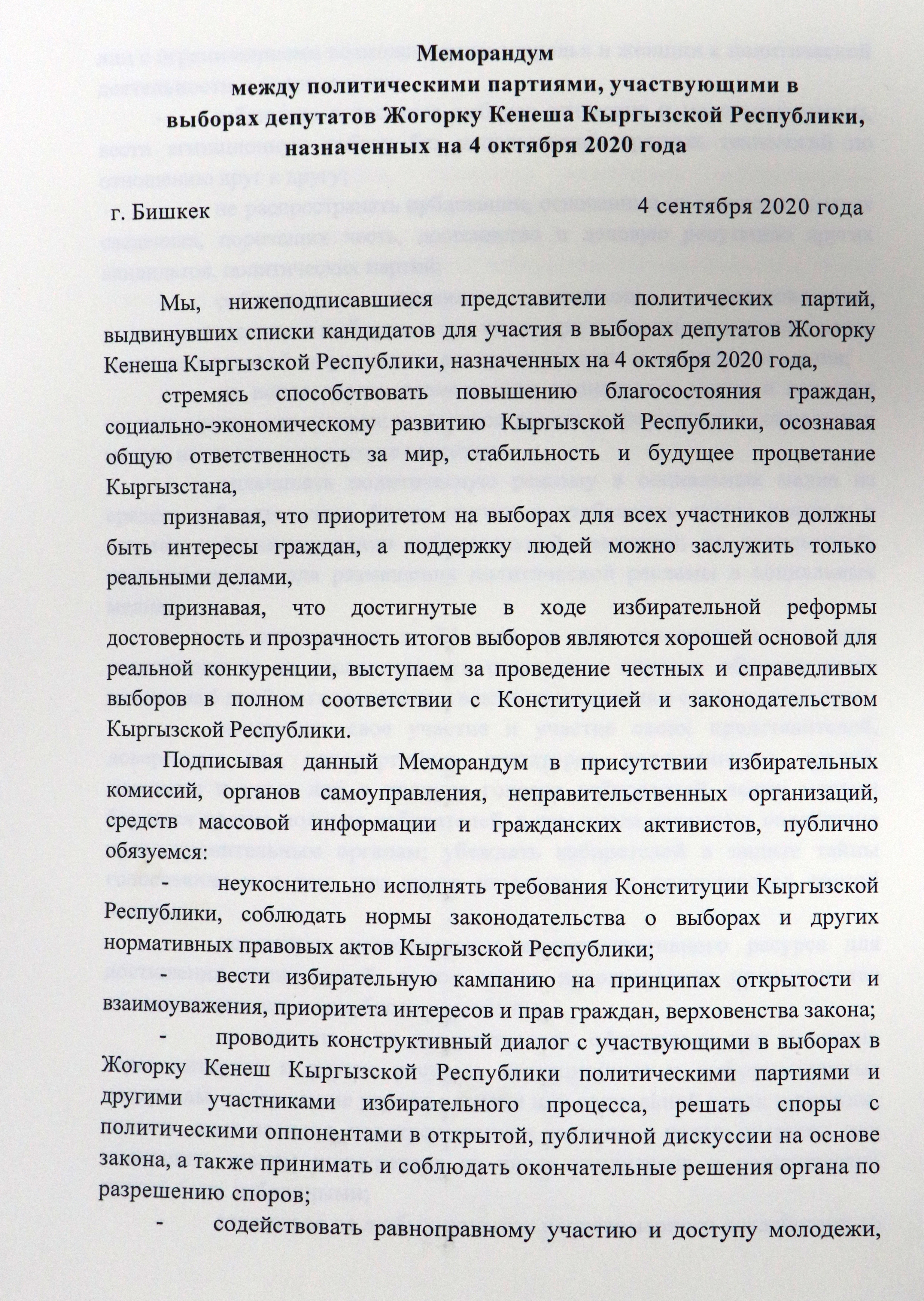Партии приняли на себя обязательства неукоснительно исполнять требования Конституции Кыргызской Республики, соблюдать нормы законодательства о выборах и других нормативных правовых актов, а также вести избирательную кампанию на принципах открытости и взаимоуважения, приоритета интересов и прав граждан, верховенства закона.