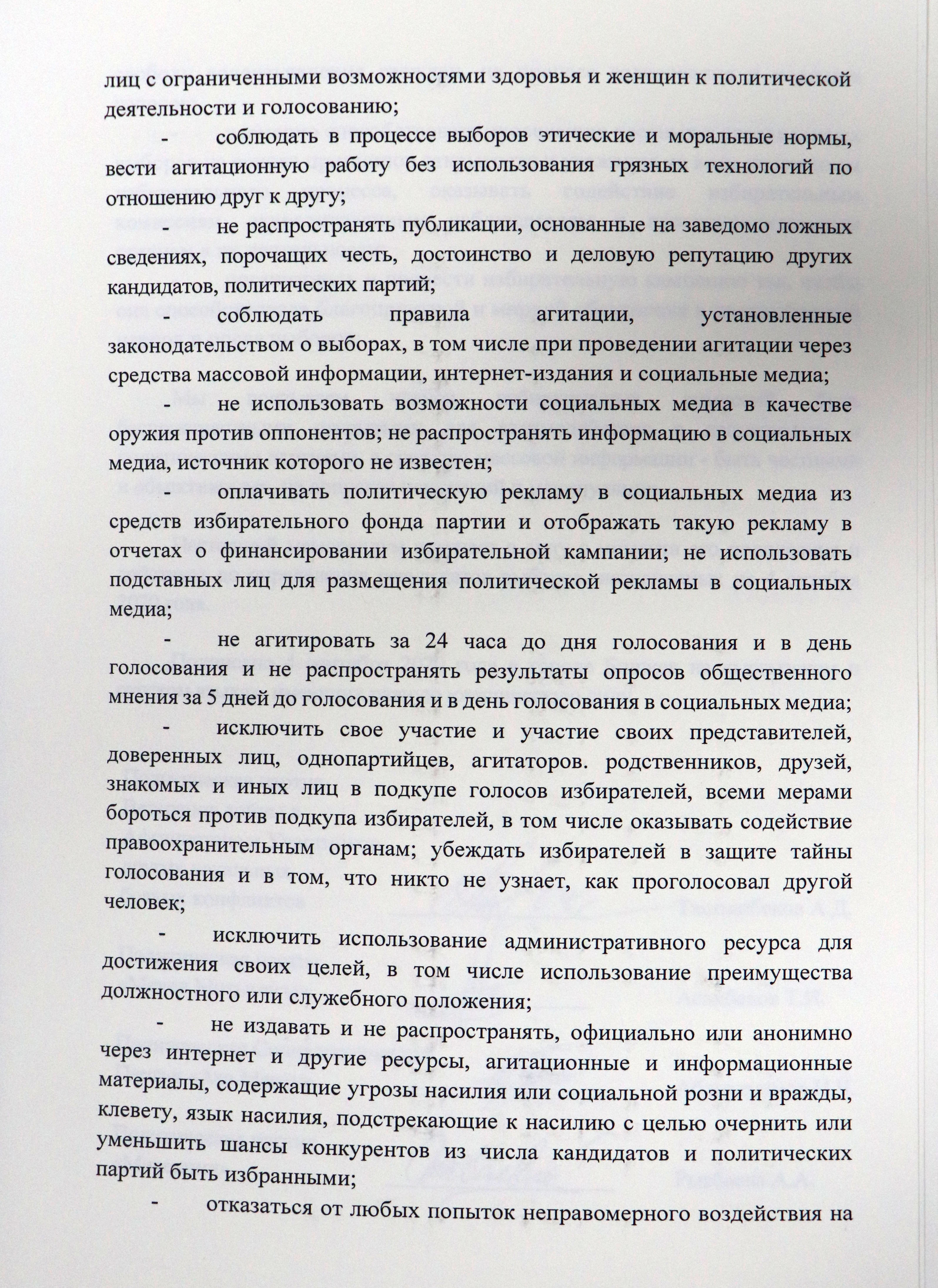 Подписывая документ, партии подтвердили свою готовность решать споры с политическими оппонентами в открытой, публичной дискуссии на основе закона, соблюдать в процессе выборов этические и моральные нормы, вести агитационную работу без использования грязных технологий по отношению друг к другу, соблюдать правила агитации, установленные законодательством о выборах.