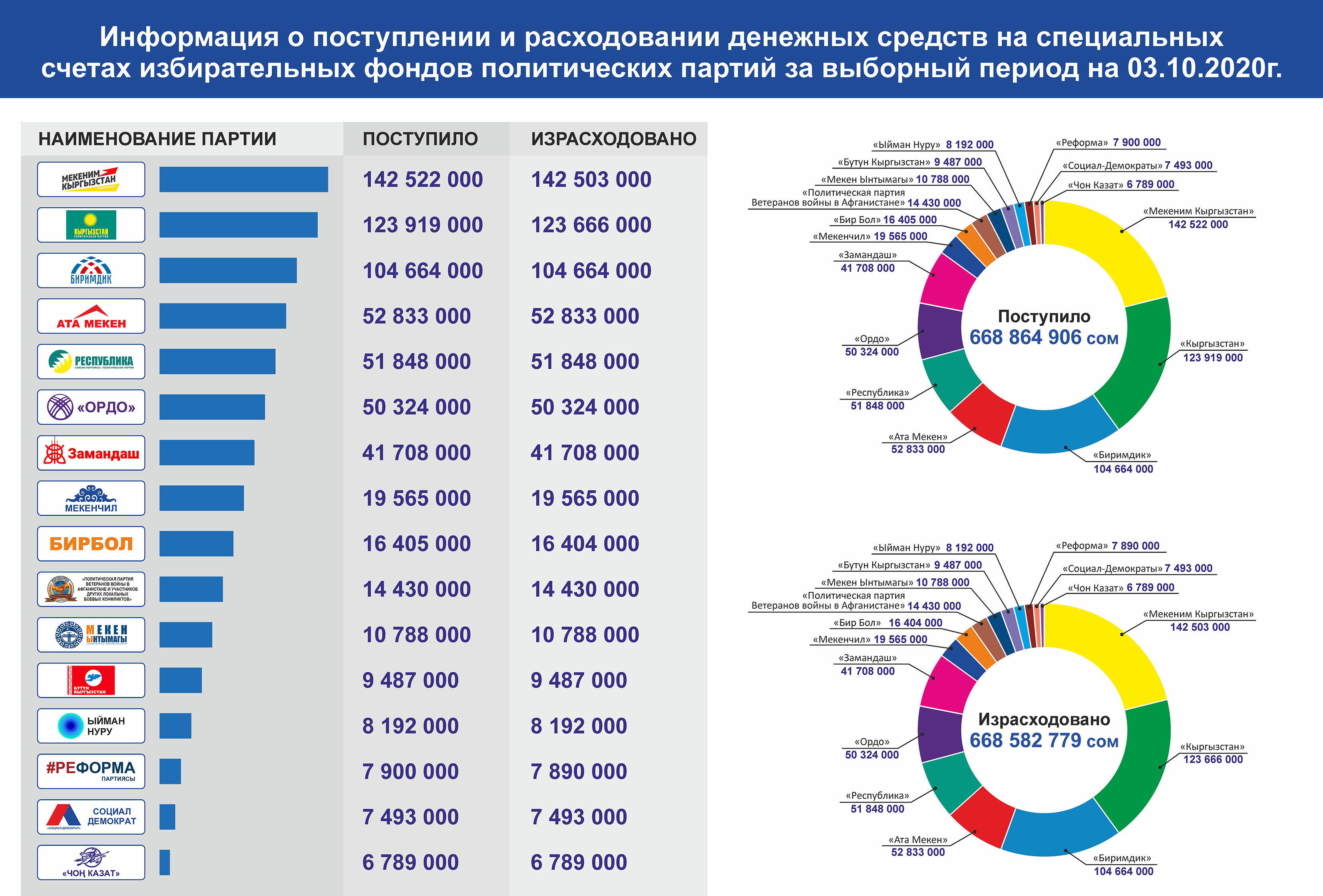 За избирательный период на специальные счета избирательных фондов политических партий в общей сумме поступило 668 864 906 сомов, израсходовано 668 582 779 сом.