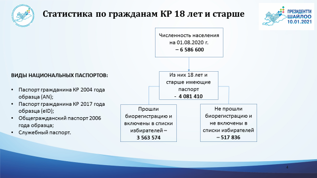 Численность населения Кыргызской Республики старше 18 лет составляет 6 586 600 граждан, из которых 18 лет и старше, имеющих паспорт, - 4 081 410 граждан. Прошли биометрическую регистрацию и были включены в списки избрателей 3 563 574 гражданина.