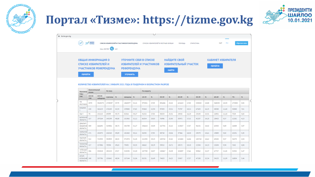 Таким образом, выгрузка списка избирателей на портал https://tizme.gov.kg// - это автоматическая выгрузка граждан 18 лет и старше, сдавших биометрические данные. Выгрузка производится по участкам на основе регистрации паспорта, ежедневно исключаются умершие граждане и, напротив, включаются те, кому исполнилось 18 лет.