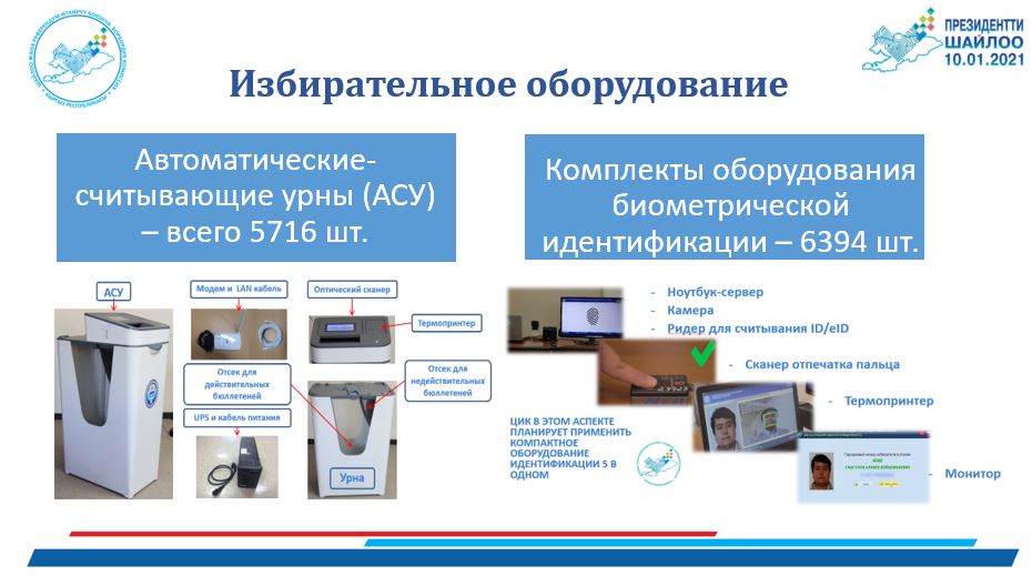 При этом в республике 11 избирательных участков расположены в высокогорных и отдаленных районах, в которых отсутствует Интернет связи. Это такие участки как пограничные заставы в селе Энилчек Аксуйского района и в селе Зардалы Баткенской области, такие же отдаленные участки есть в Сузакском районе Жалал-Абадской области, Кара-Кульджинском и Ноокатском районах Ошской области и т.д.