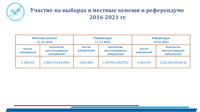 Участники были проинформированы, что 11 апреля 2021 года состоятся выборы депутатов 448 местных кенешей, из них 28 городских кенешей, 420 айыльных кенешей.