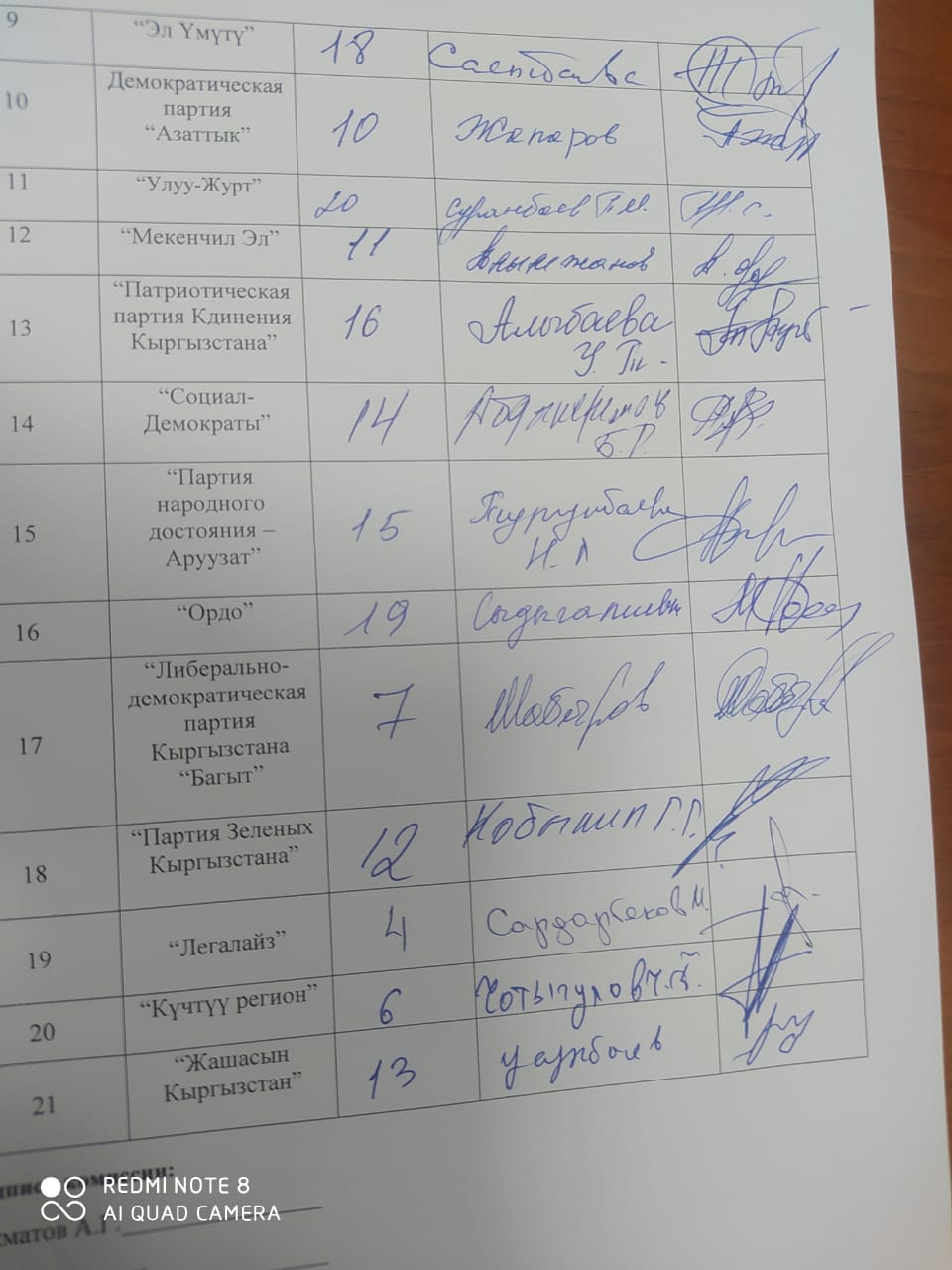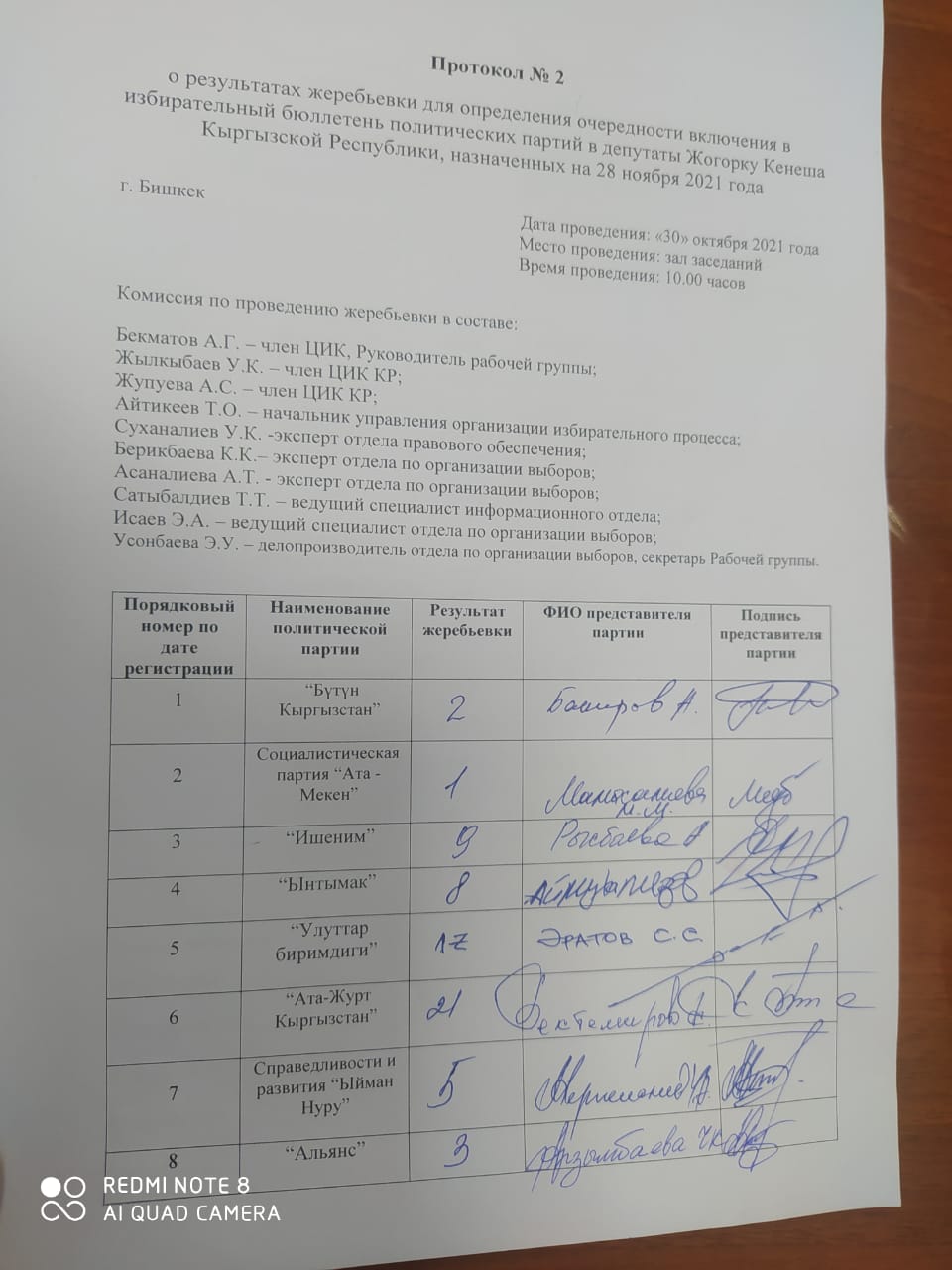 Центральная комиссия по выборам и проведению референдумов Кыргызской Республики провела жеребьевку по определению мест политических партий в избирательных бюллетенях по единому избирательному округу на выборах депутатов Жогорку Кенеша Кыргызской Республики, назначенных на 28 ноября 2021 года.
