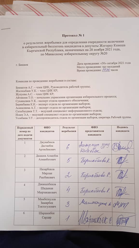 Центральная комиссия по выборам и проведению референдумов Кыргызской Республики провела жеребьевку по определению мест кандидатов в избирательном бюллетене по Манасскому избирательному округу №20 на выборах депутатов Жогорку Кенеша Кыргызской Республики, назначенных на 28 ноября 2021 года.