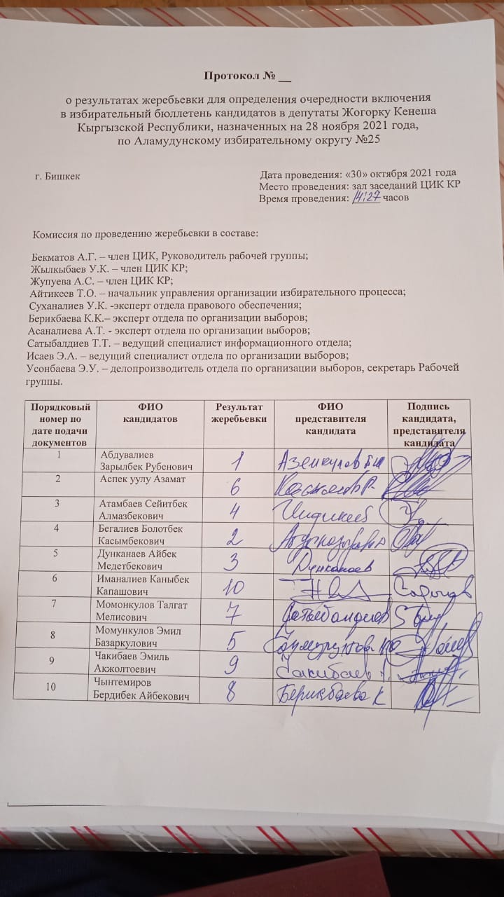 Центральная комиссия по выборам и проведению референдумов Кыргызской Республики провела жеребьевку по определению мест кандидатов в избирательном бюллетене по Аламудунскому избирательному округу №25 на выборах депутатов Жогорку Кенеша Кыргызской Республики, назначенных на 28 ноября 2021 года.
