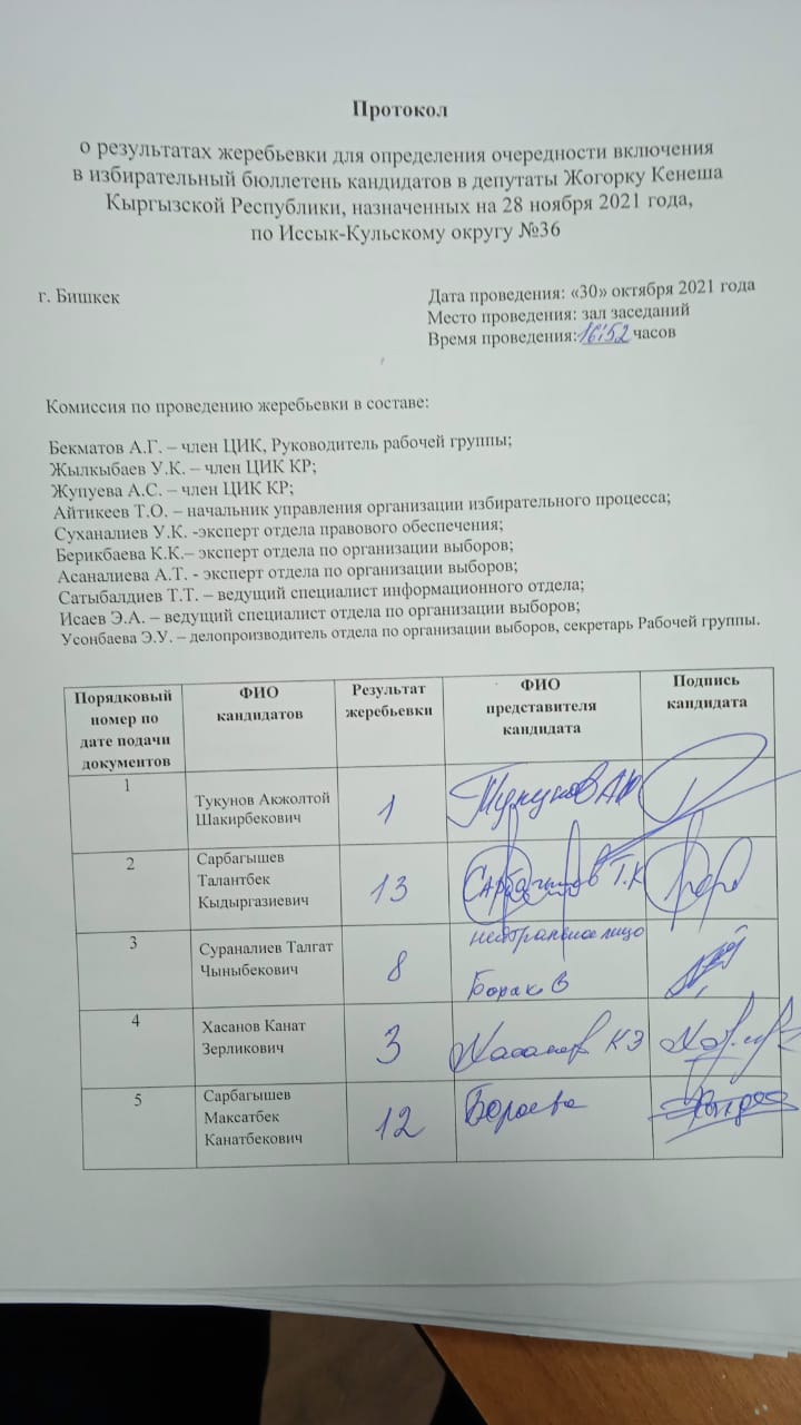 Иссык-Кульский избирательный округ №36: Итоги жеребьевки по определению мест в бюллетене