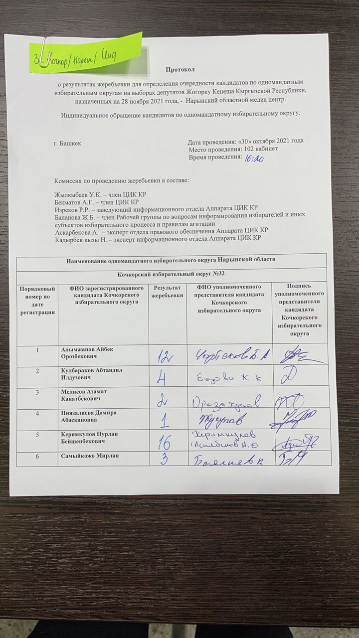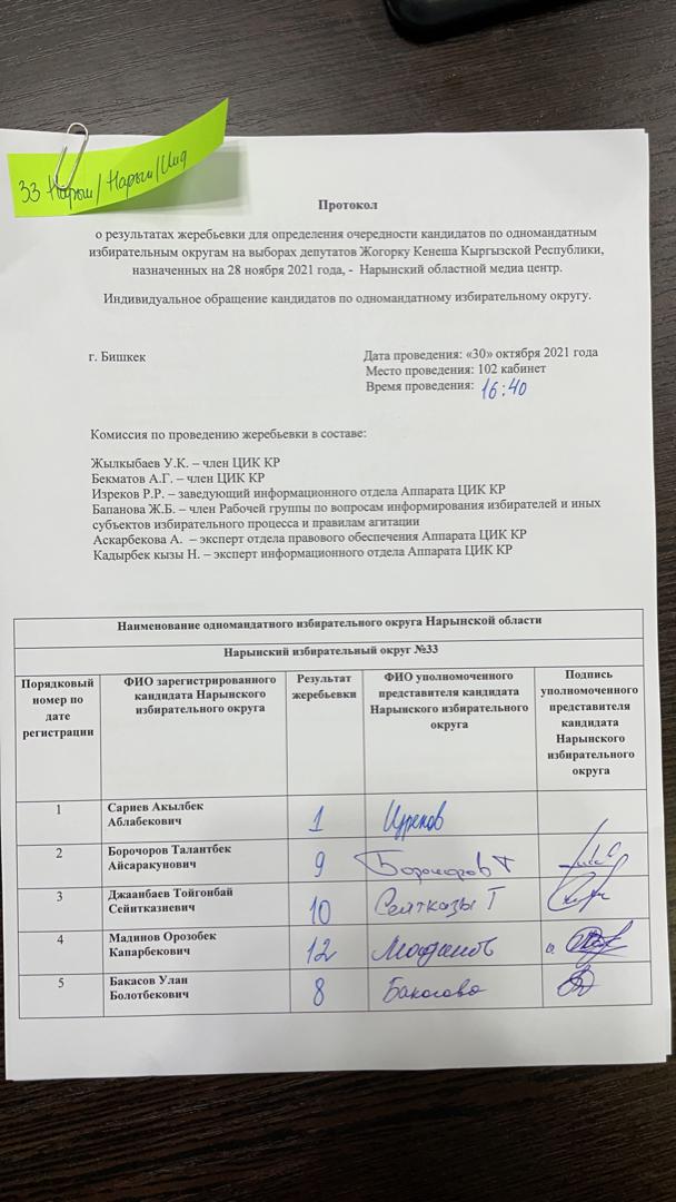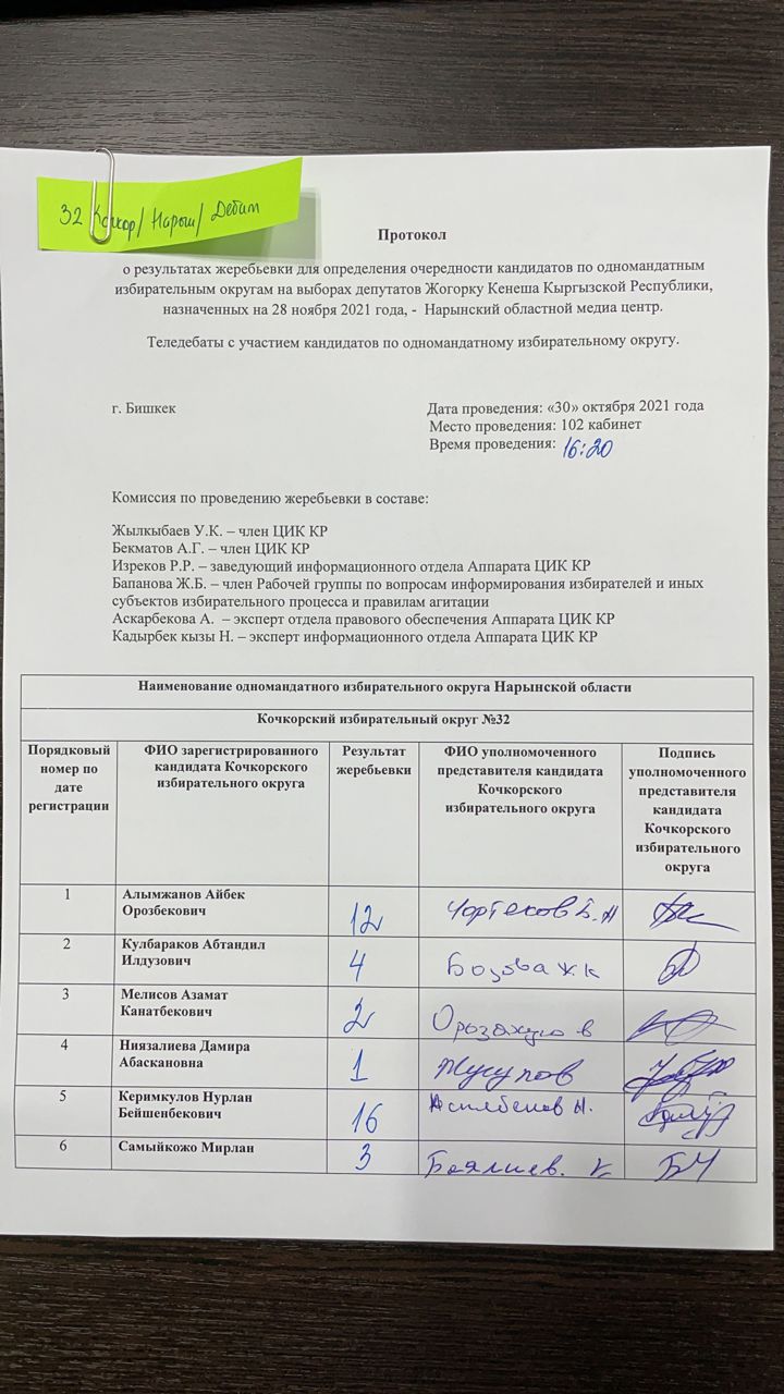 Центральная комиссия по выборам и проведению референдумов Кыргызской Республики провела жеребьевку по распределению бесплатного эфирного времени в эфире Нарынского медиа центра для кандидатов, зарегистрированных для участия на выборах депутатов Жогорку Кенеша Кыргызской Республики по одномандатным избирательным округам Нарынской области – Кокорский №32, Нарынский №33.