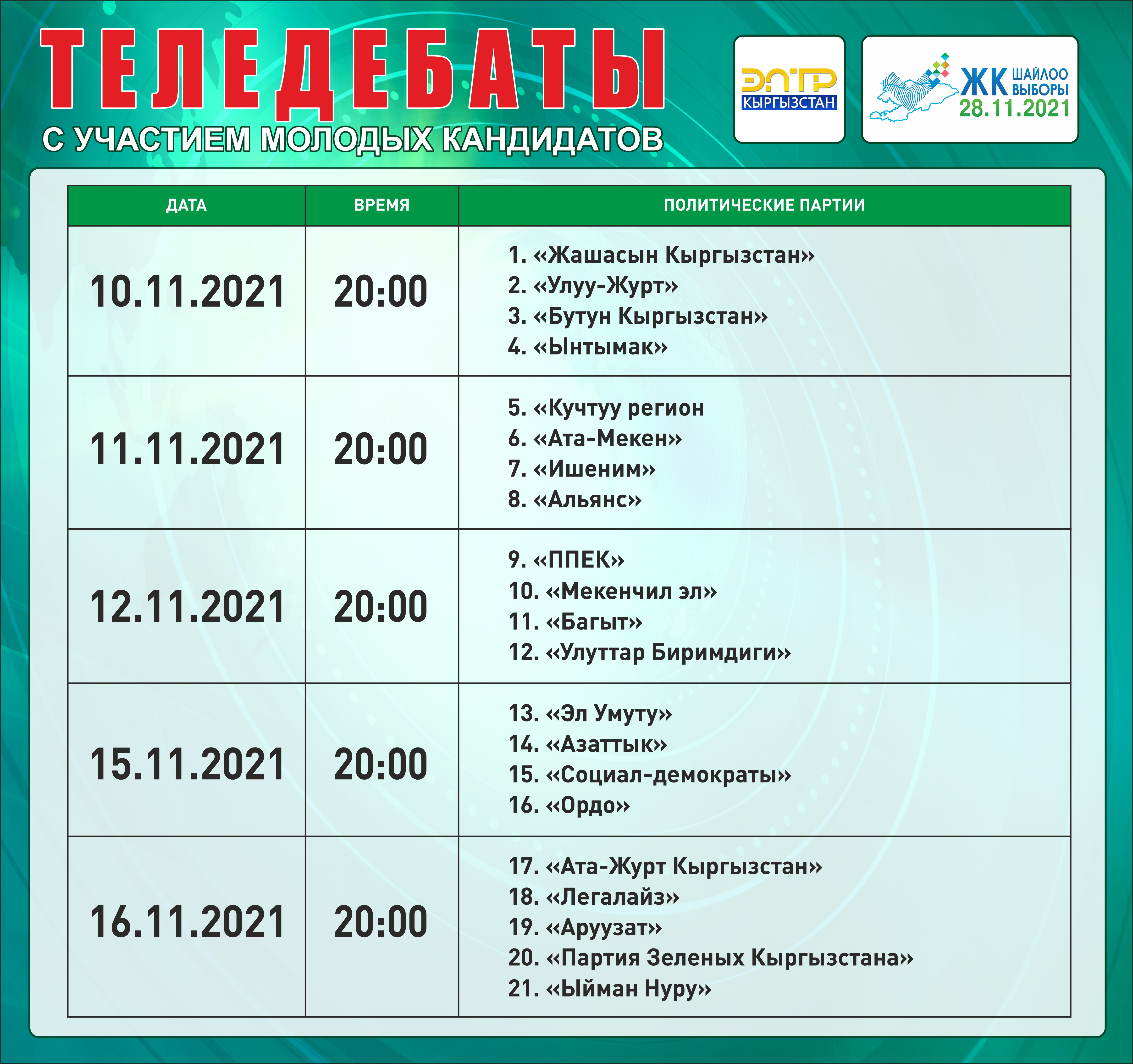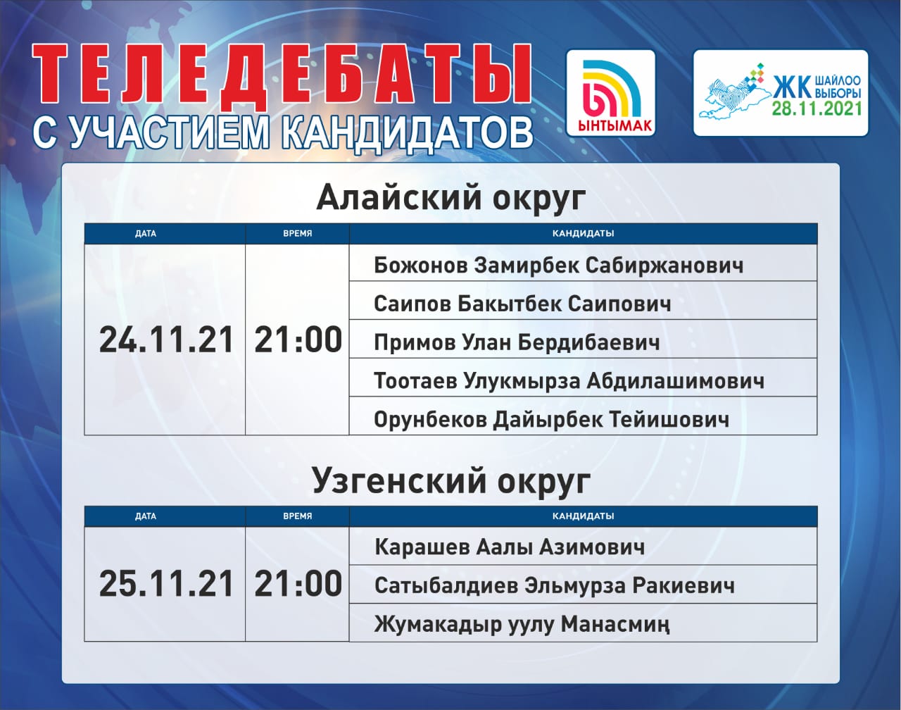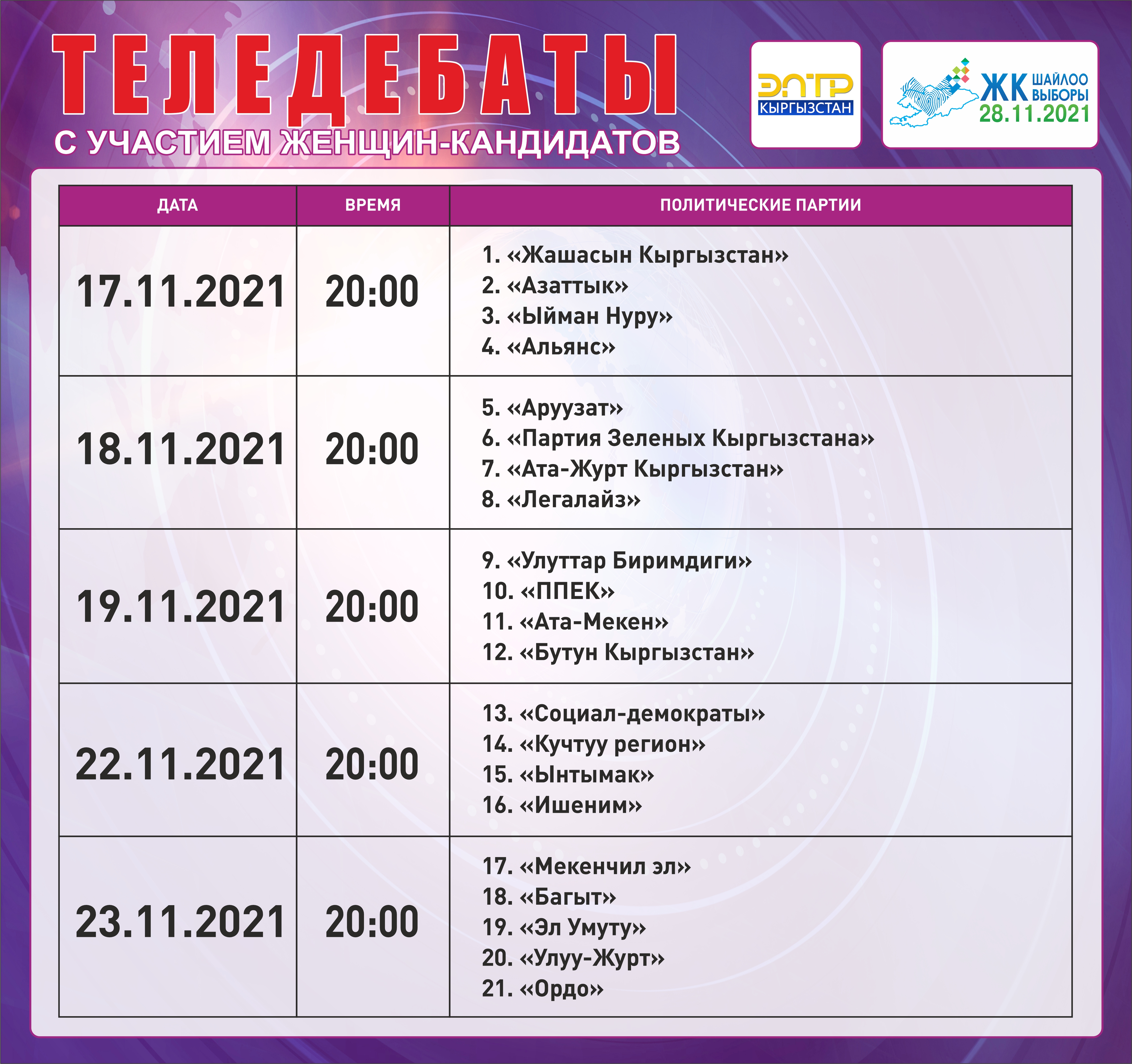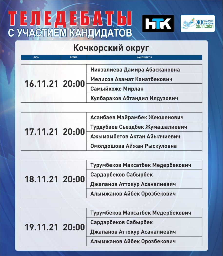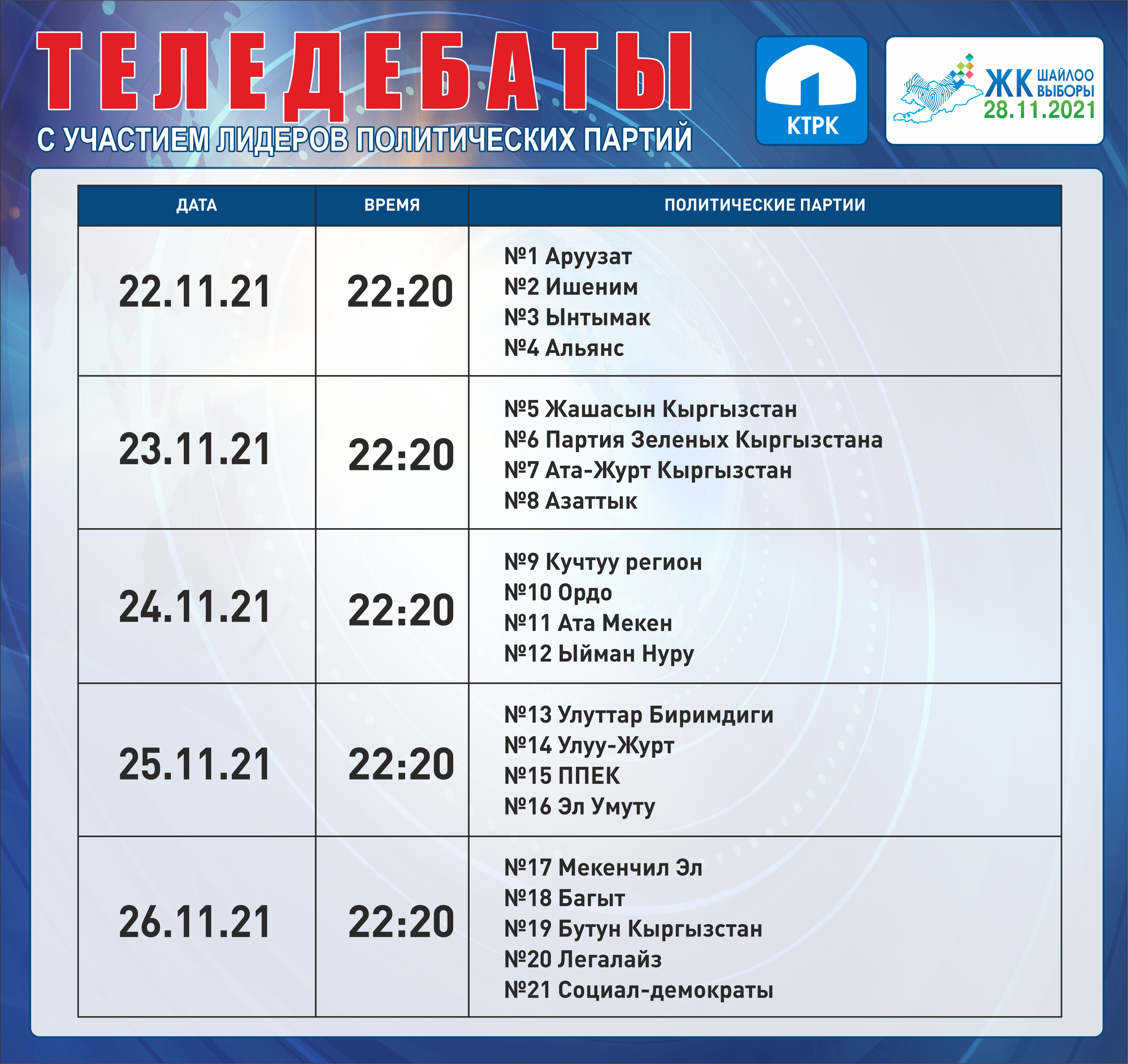 ОТРК - дебаты с участием лидеров партий: с 22 ноября по 26 ноября с 20:00 до 00:00.