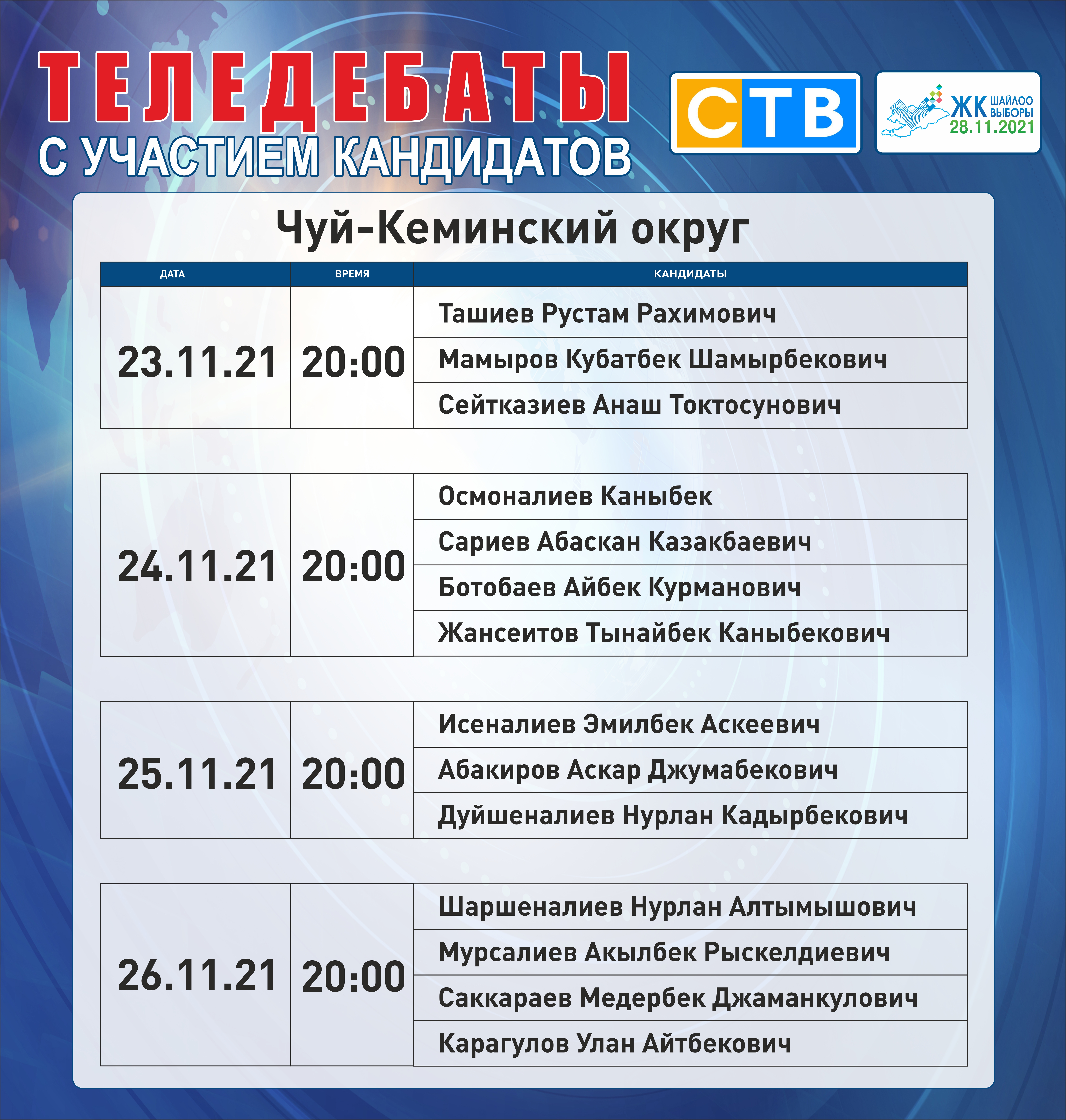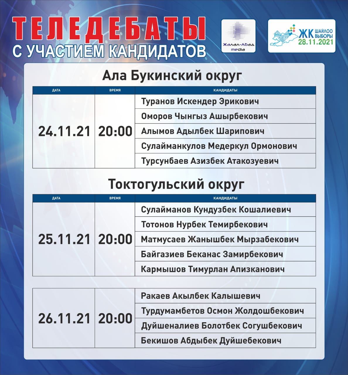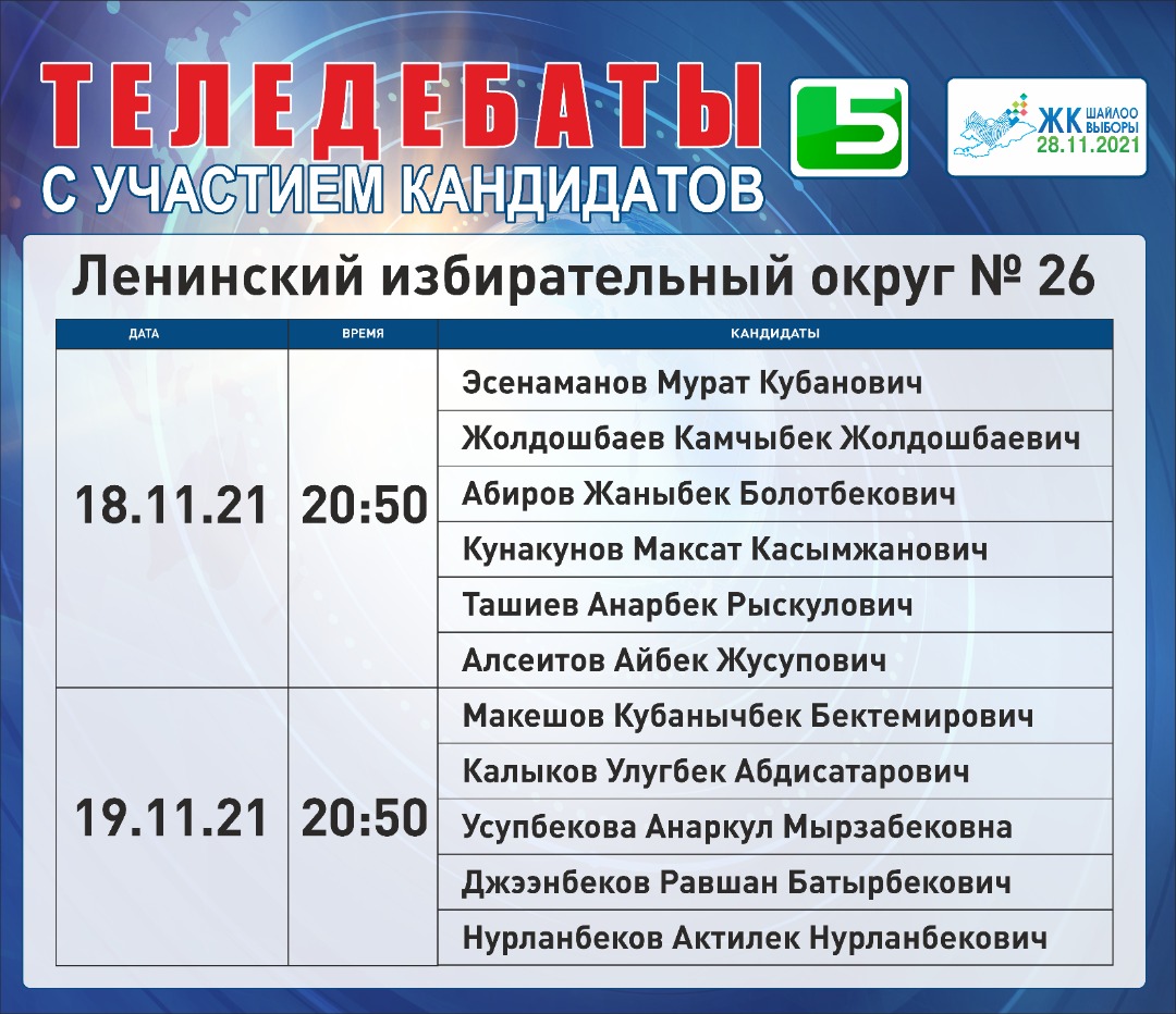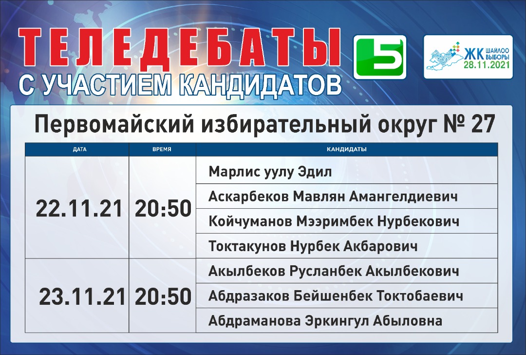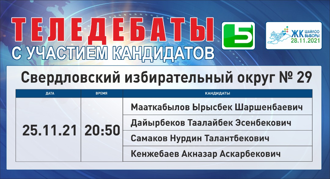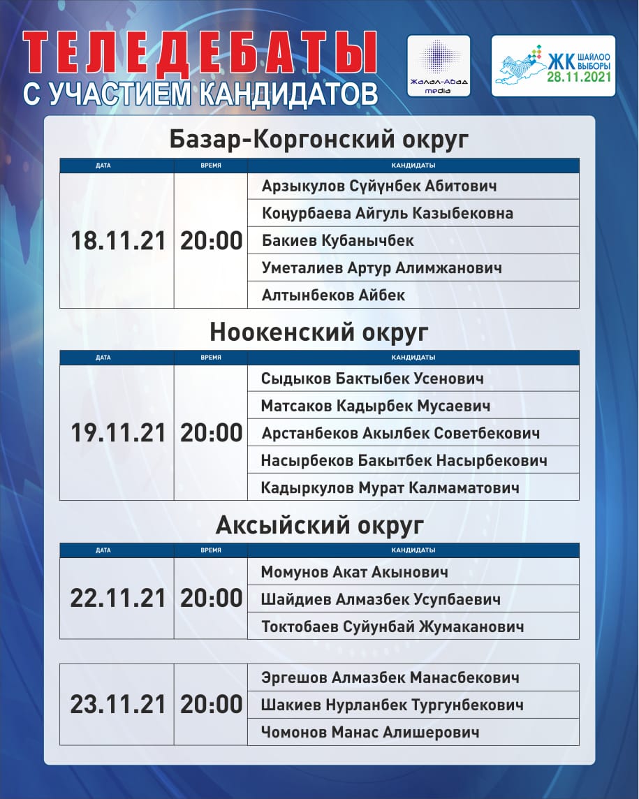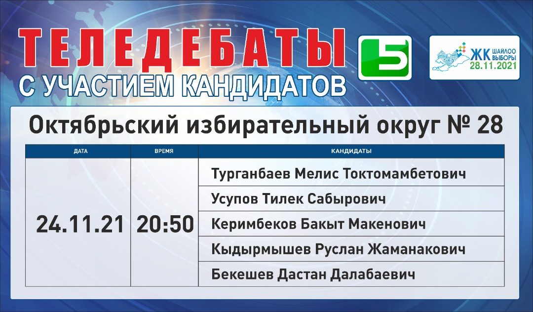 ОТРК - дебаты с участием лидеров партий: с 22 ноября по 26 ноября с 20:00 до 00:00.