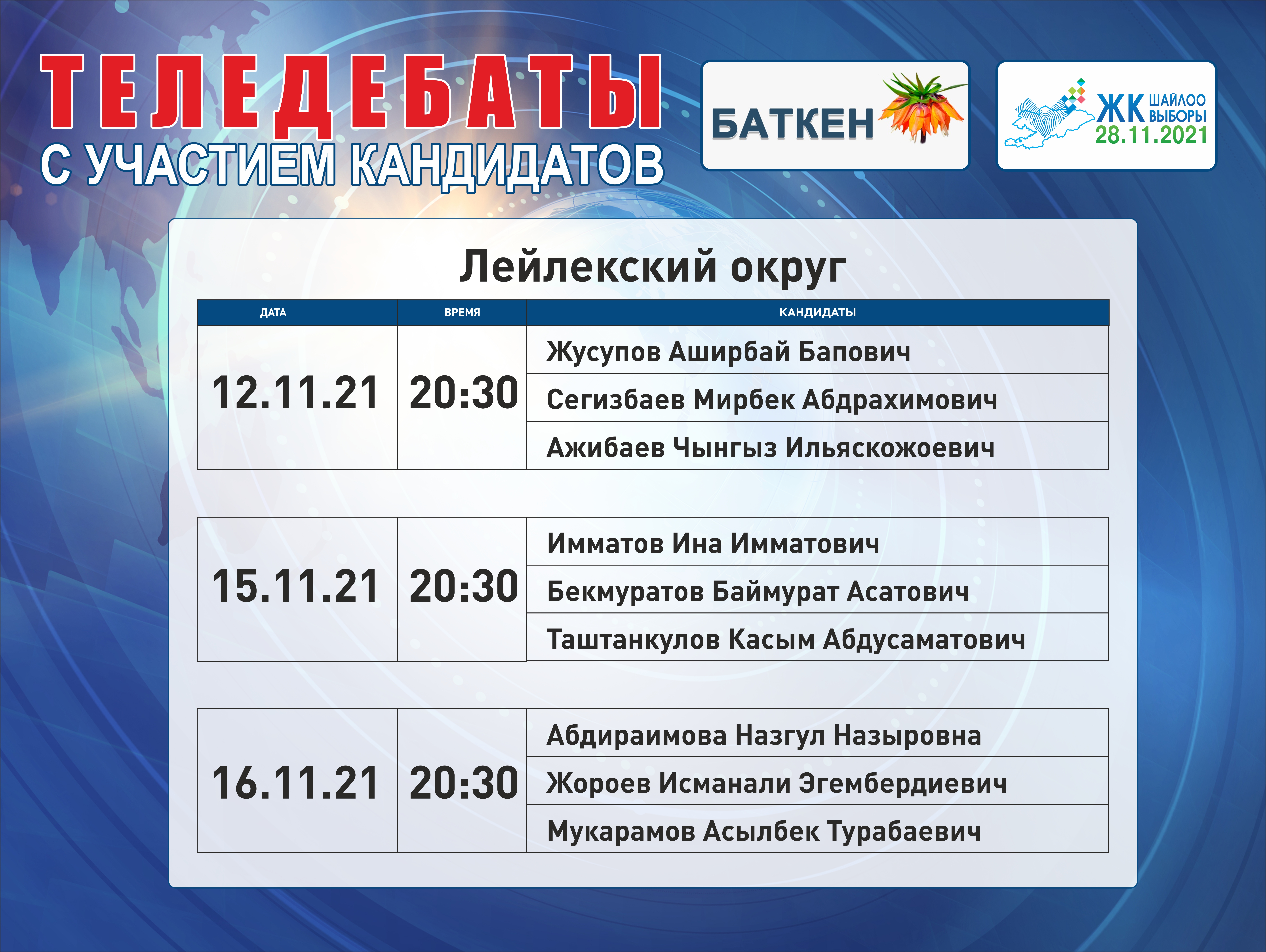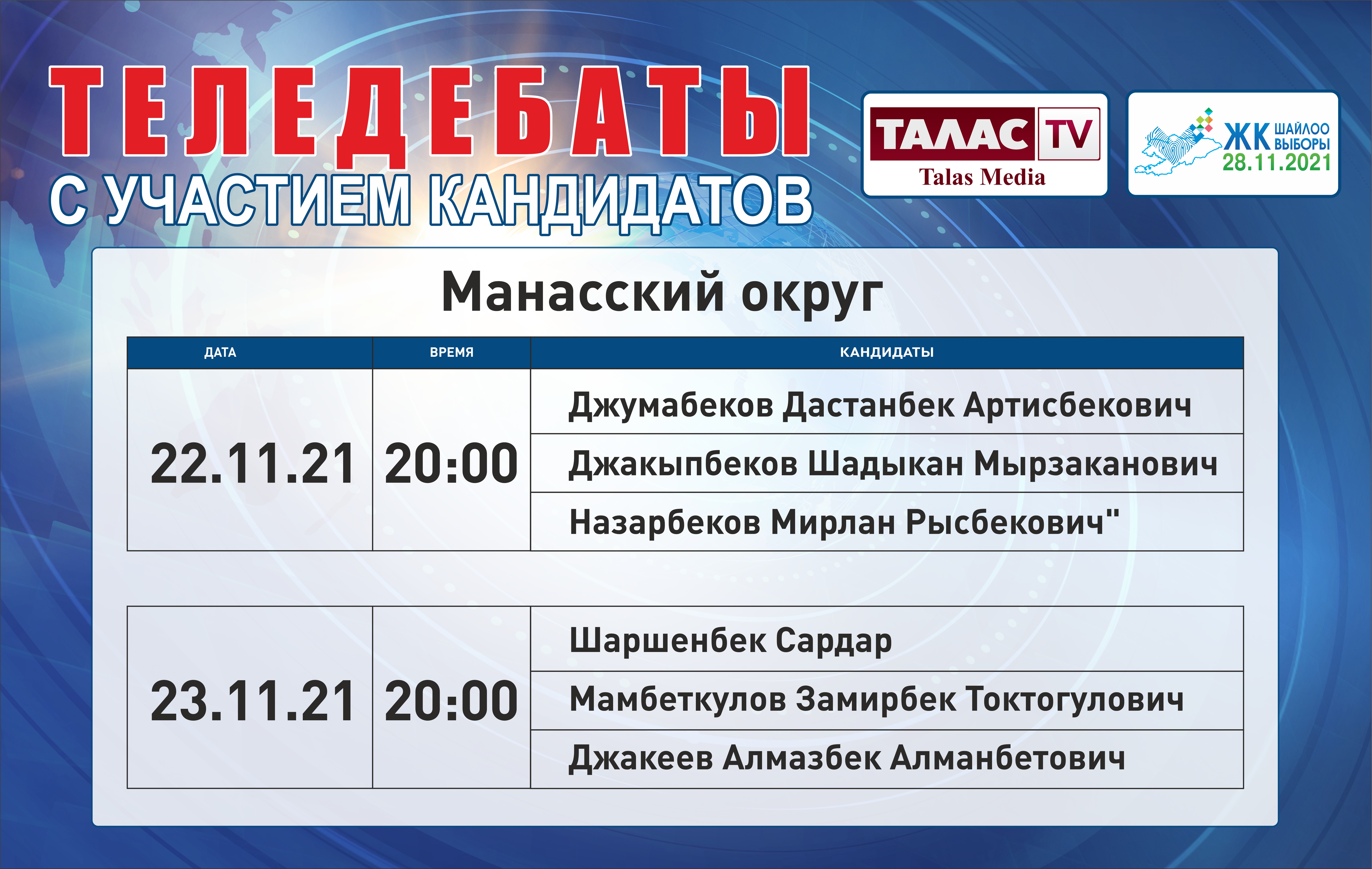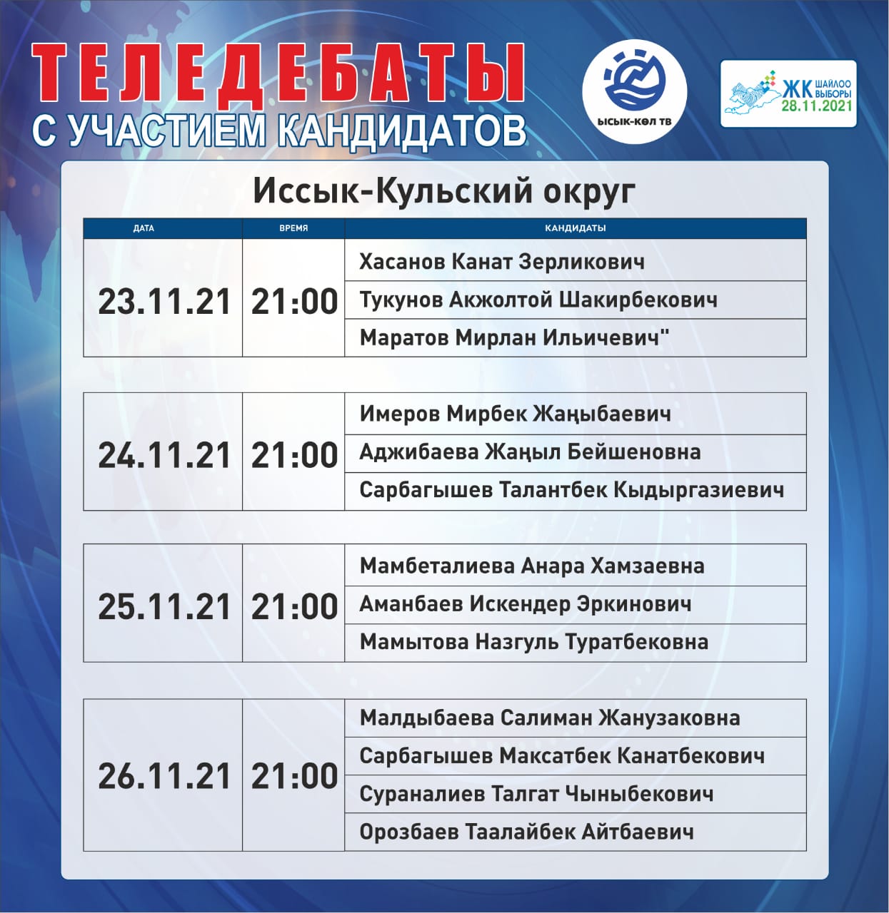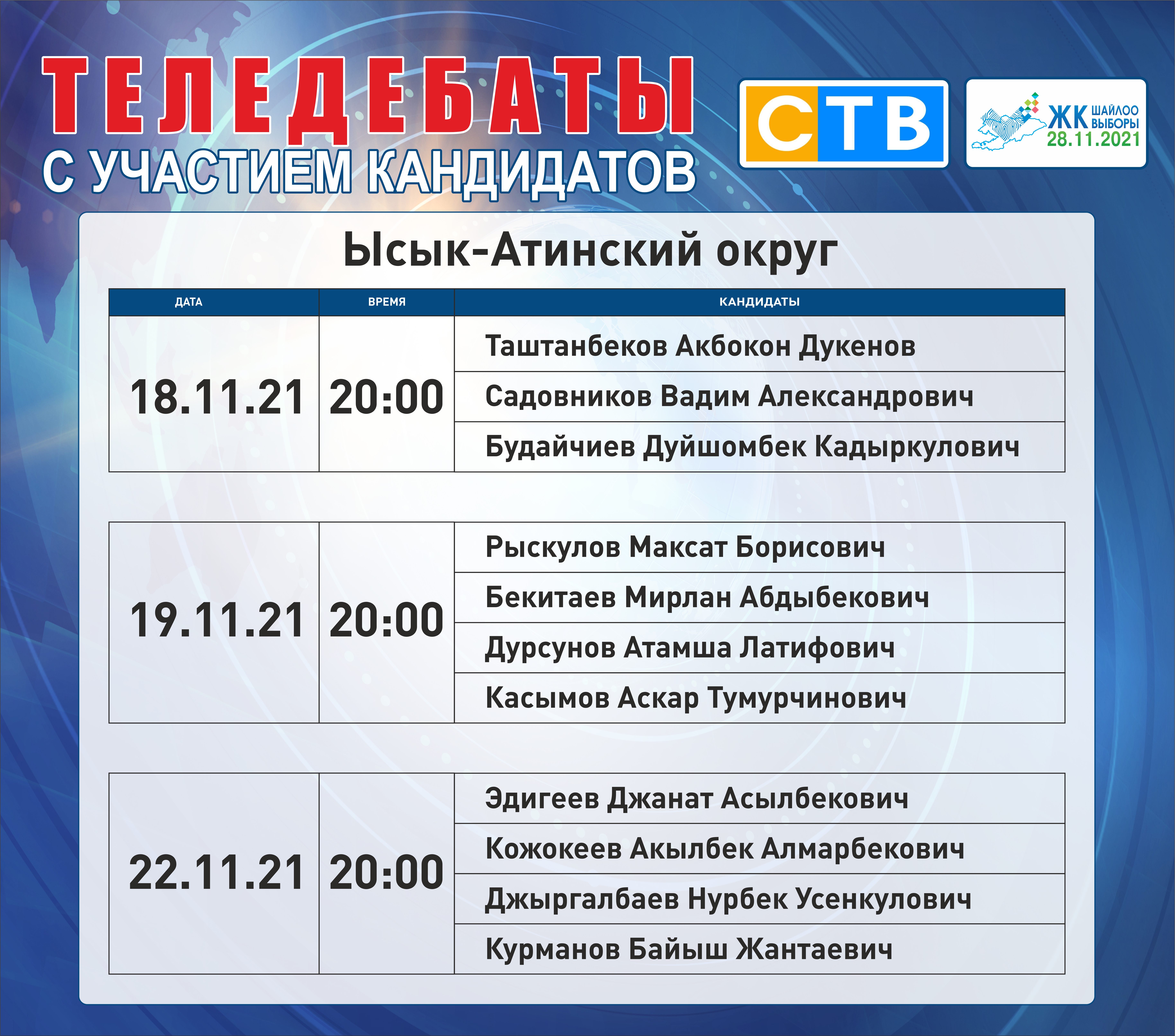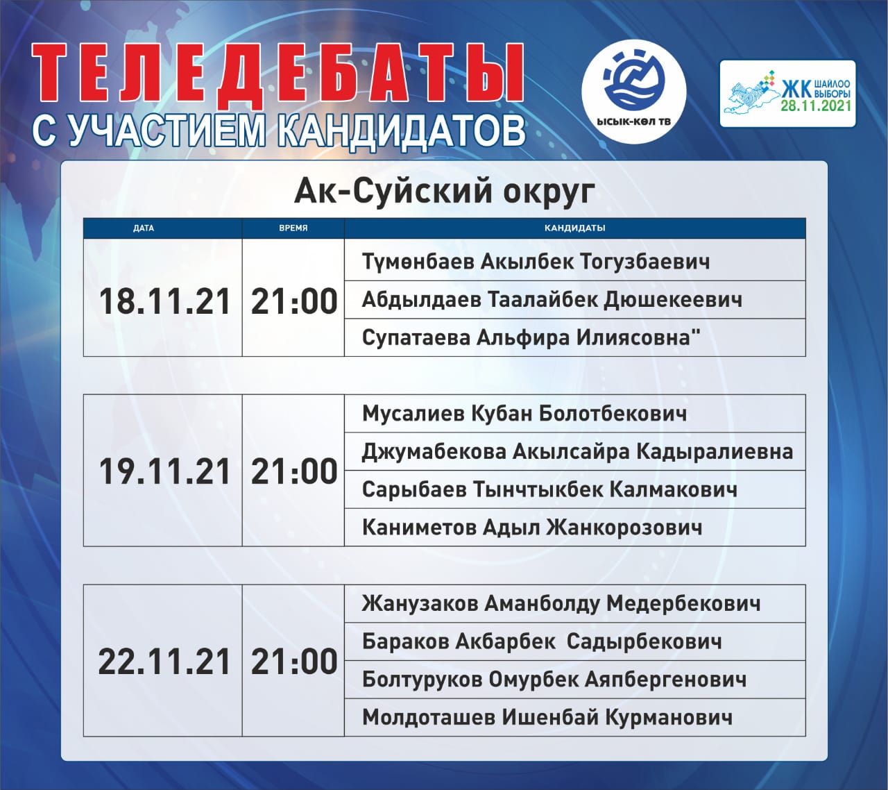 ОТРК - дебаты с участием лидеров партий: с 22 ноября по 26 ноября с 20:00 до 00:00.