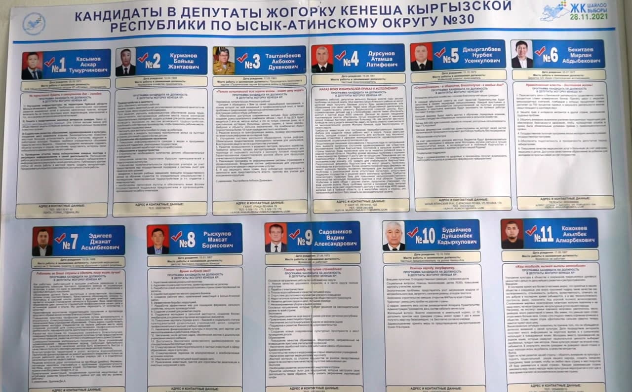 В рамках своей ответственности Центральная комиссия по выборам и проведению референдумов Кыргызской Республики организовала массовое информирование избирателей о кандидатах, баллотирующихся по одномандатным избирательным округам, и кандидатов, выдвинутых от политических партий по единому избирательному округу.