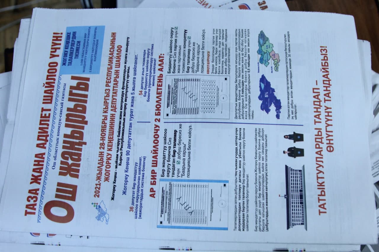 Кроме того, Центральная избирательная комиссия организовала публикацию в этих же спецвыпусках районных газет, а также в газетах “Эркин Тоо”, “Для Вас” и “Супер инфо” информации о новой смешанной избирательной системе, процедуре голосования на избирательном участке и правилах заполнения избирательных бюллетеней.