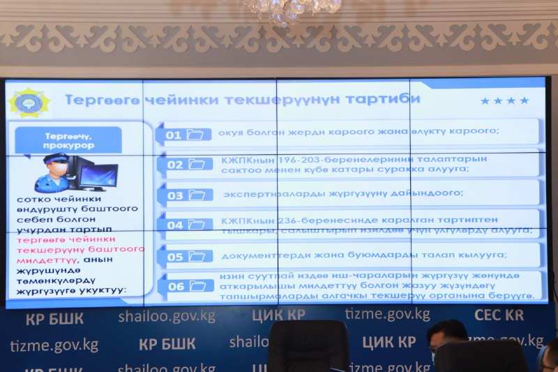 18 января 2022 года в Центральной избирательной комиссии Кыргызской Республики в рамках подготовки к повторным выборам депутатов Жогорку Кенеша Кыргызской Республики в одномандатных избирательных округах Первомайском и Свердловском районах г. Бишкек прошло обучение для сотрудников руководящего и оперативного состава правоохранительных органов указанных подразделений: прокуратуры ГУ, УГКН по г. Бишкек и УВД г. Бишкек по применению новых Кодексов Кыргызской Республики: уголовного кодекса Кыргызской Республики, уголовно-процессуального кодекса Кыргызской Республики и кодекса о правонарушениях Кыргызской Республики.