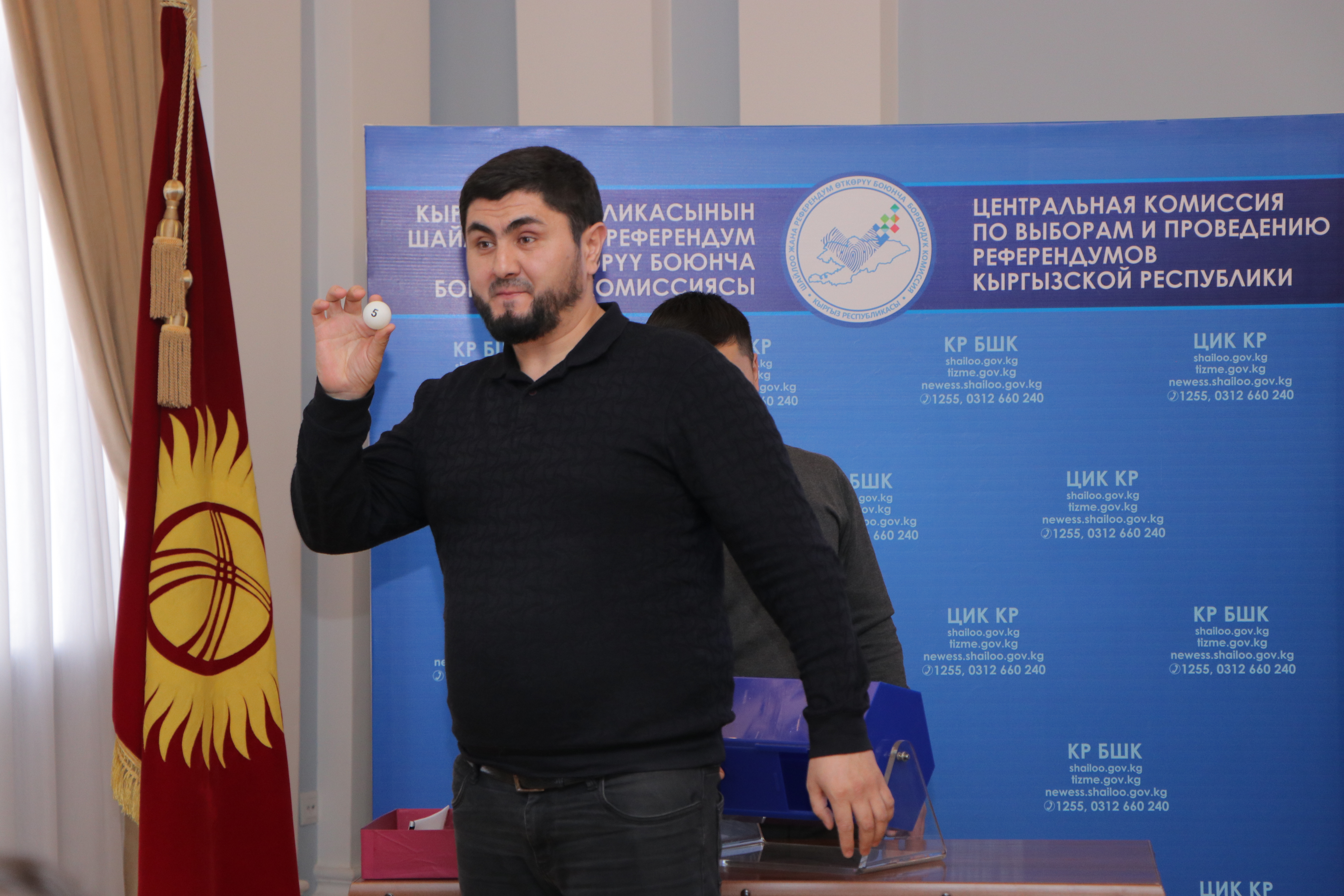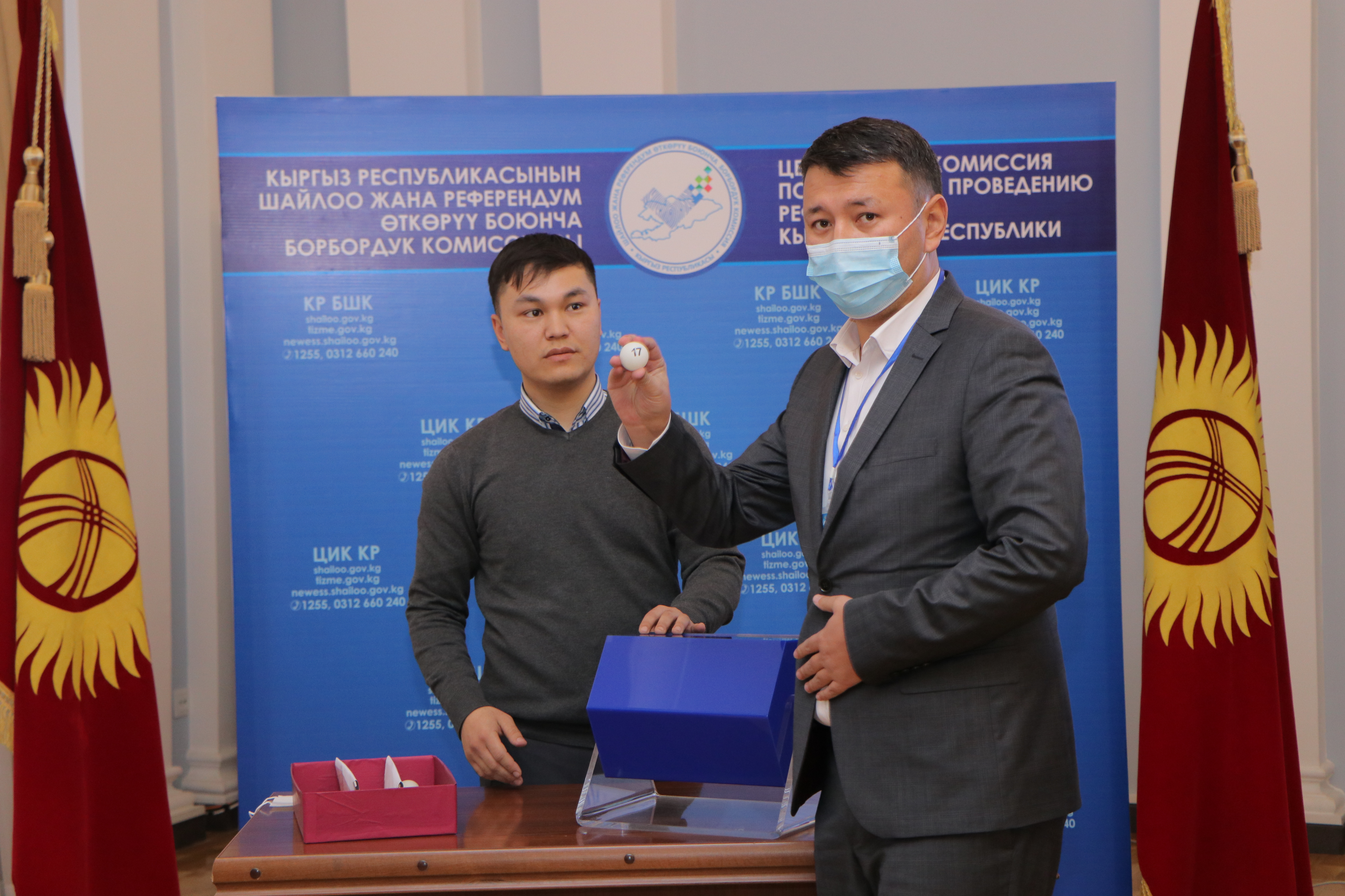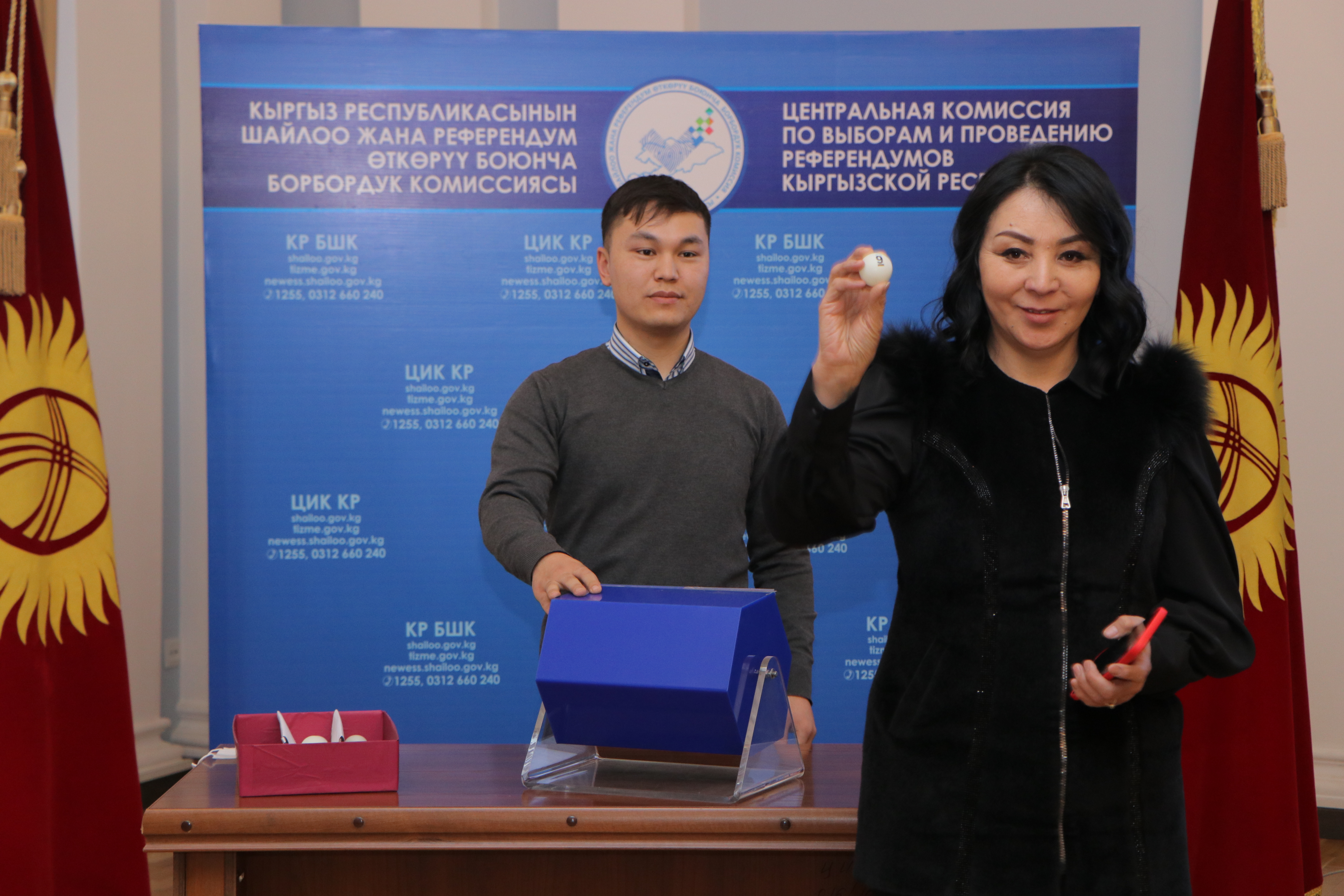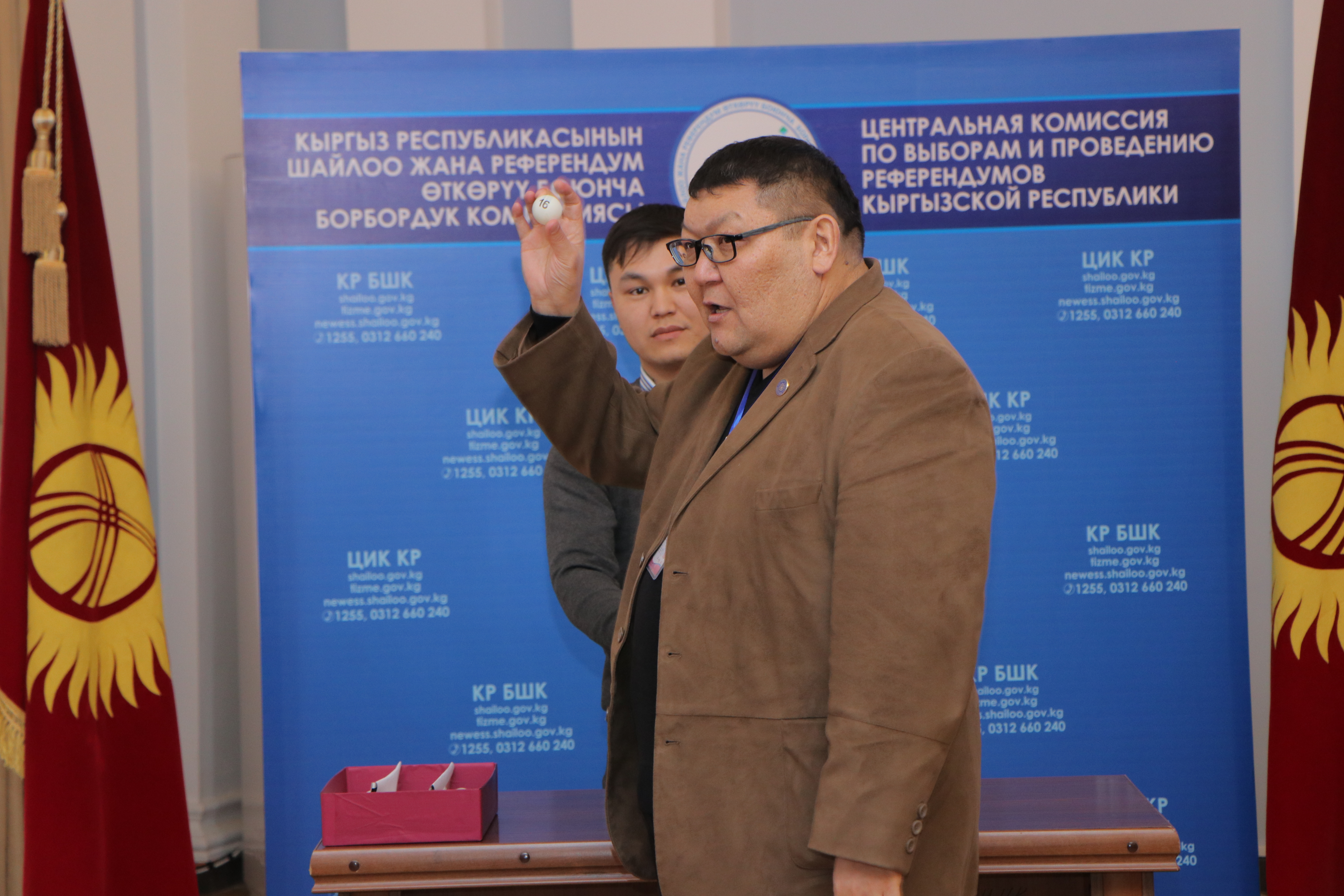 В жеребьевке участвовали кандидаты в депутаты Жогорку Кенеша КР, уполномоченные представители зарегистрированных кандидатов в депутаты ЖК КР, представители средств массовой информации, а также общественные наблюдатели.