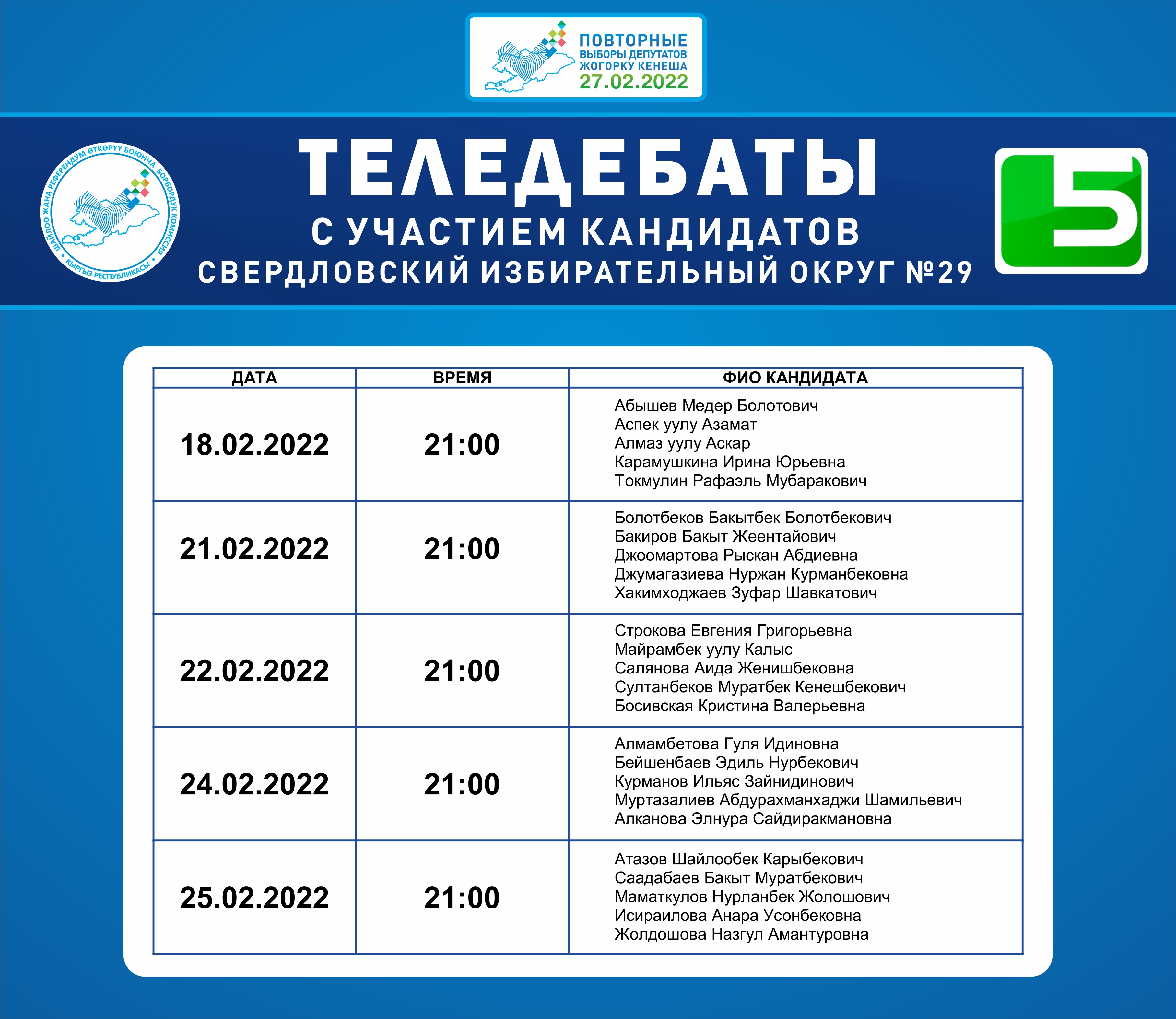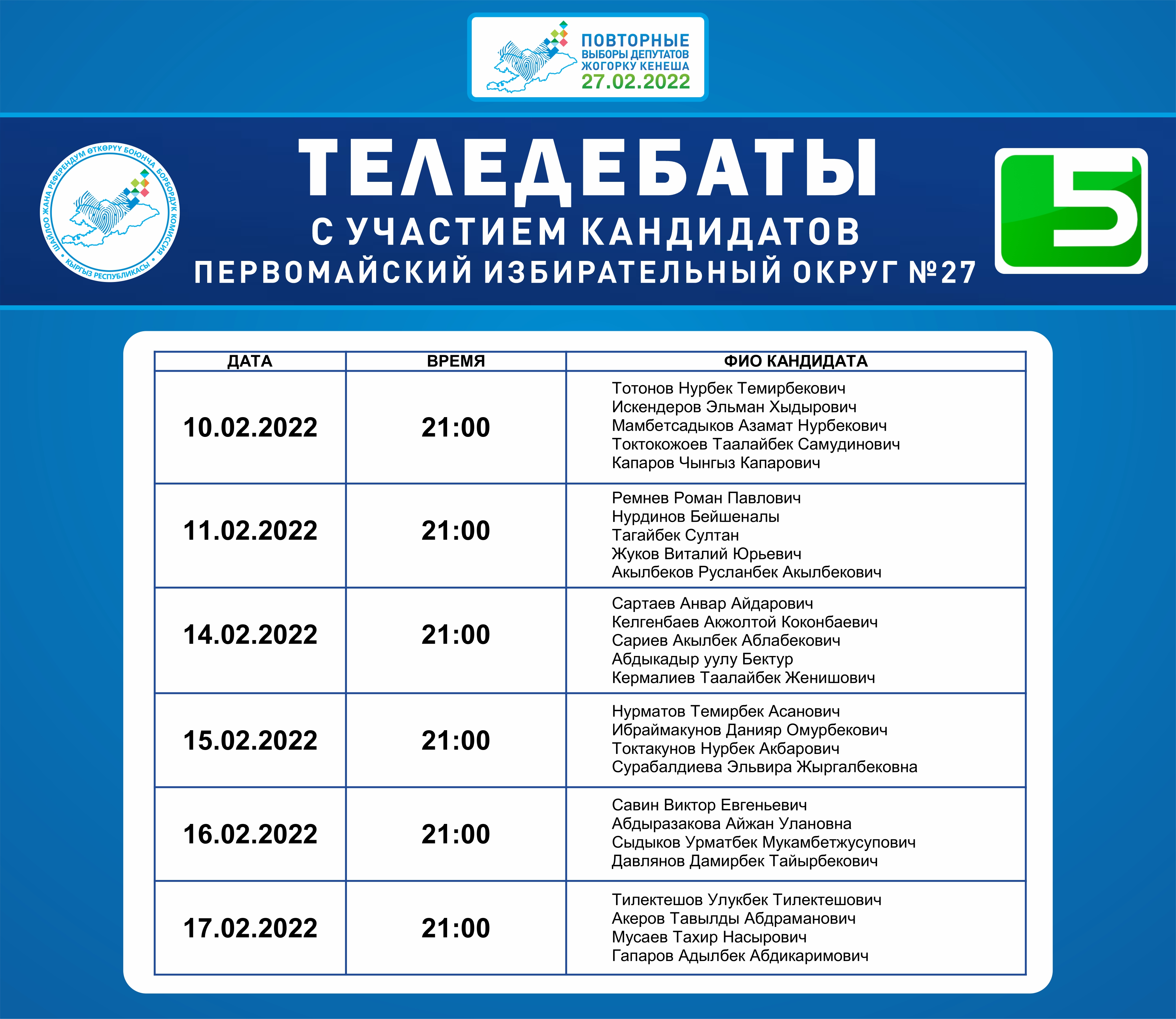 Эфирное время (индивидуальное выступление) с 9 февраля по 25 февраля, 15 минут для каждого кандидата