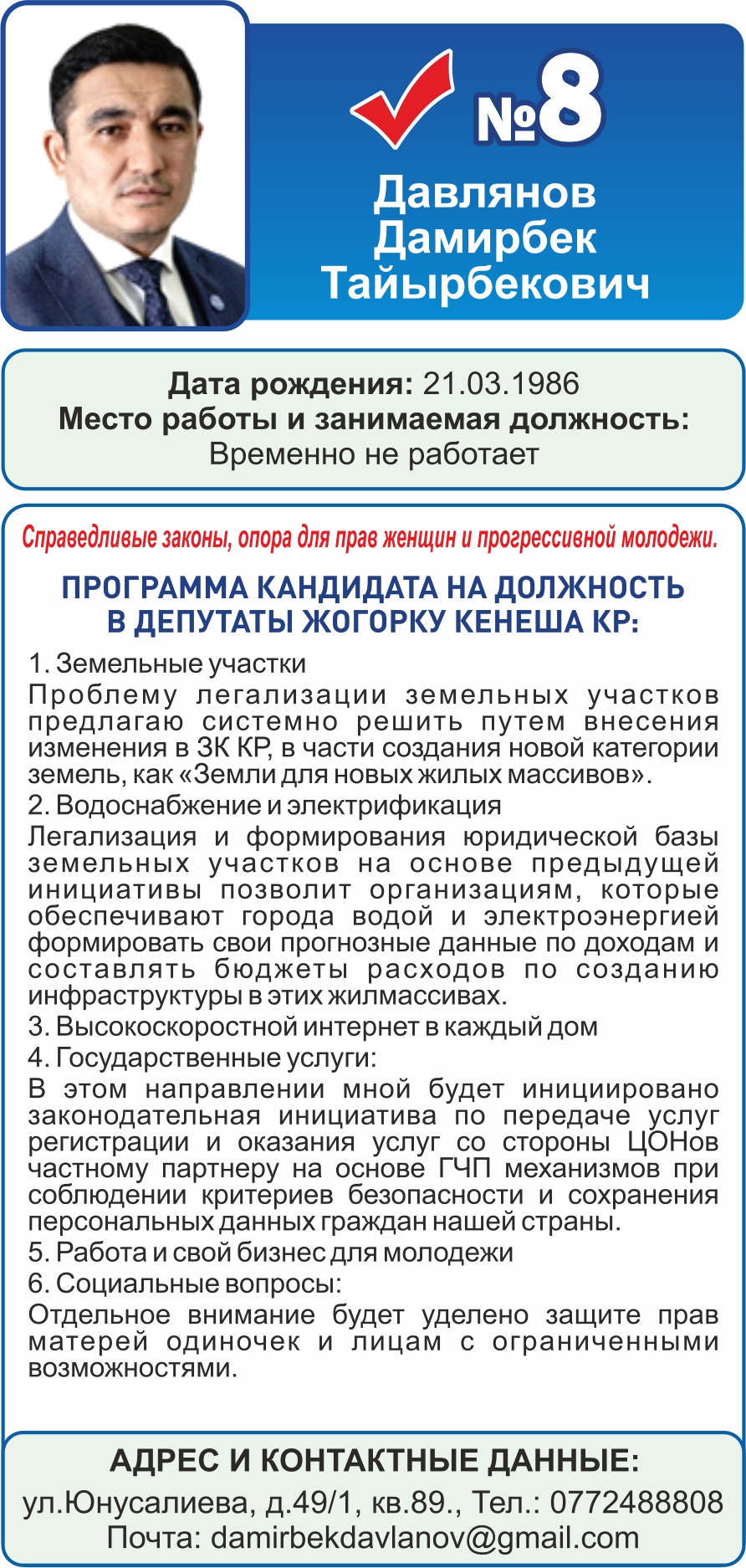 ЦИК КР: на информационном ресурсе «Талапкер» опубликованы сведения о кандидатах, баллотирующихся по двум округам г. Бишкек