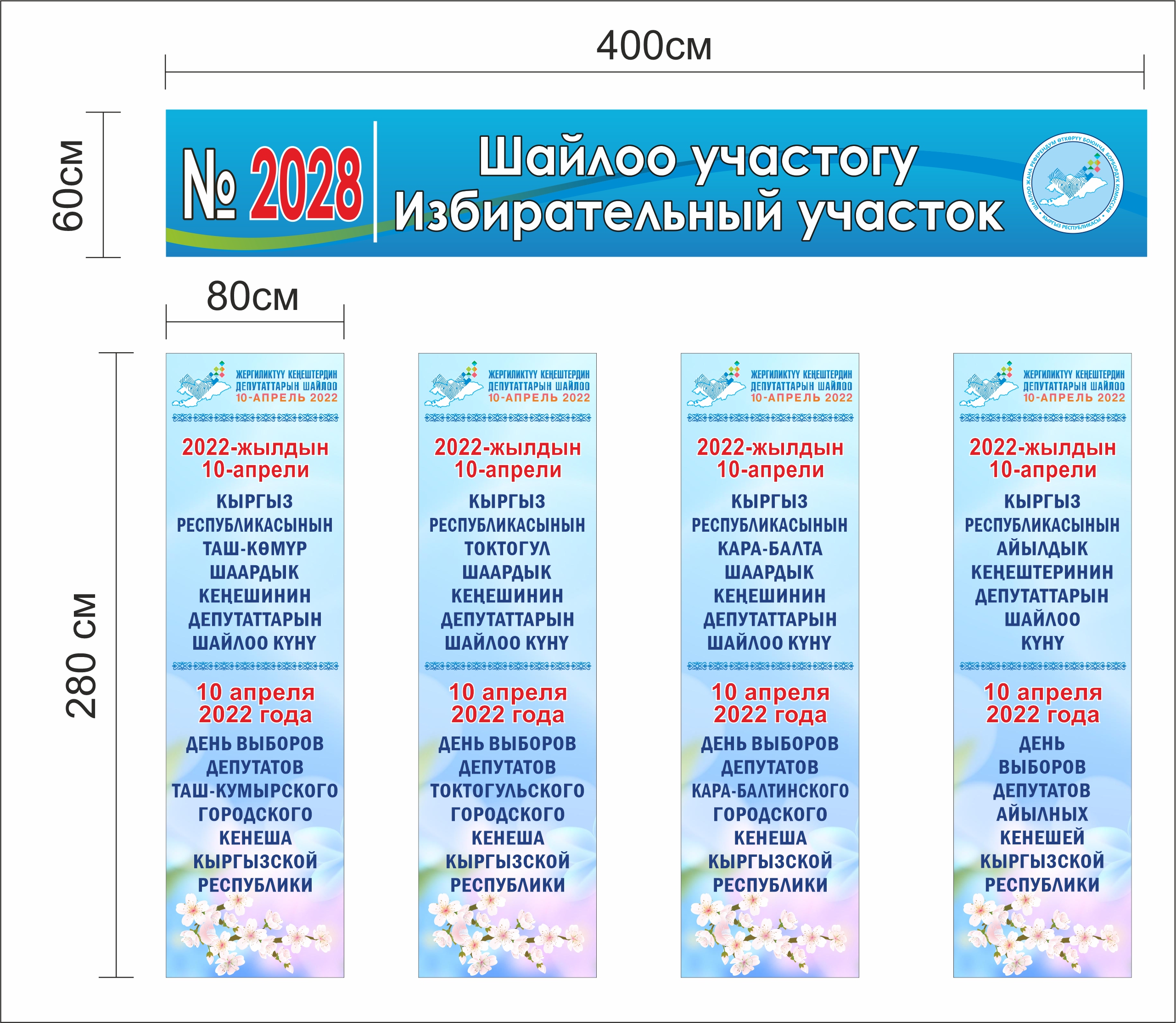 Центральная комиссия по выборам проведению референдумов Кыргызской Республики на заседании 11 февраля 2022 года постановила утвердить тексты вывески и календаря для избирательных участков на выборах депутатов некоторых местных кенешей Джалал-Абадской, Иссык-Кульской, Нарынской, Ошской и Чуйской областей Кыргызской Республики, назначенных на 10 апреля 2022 года.