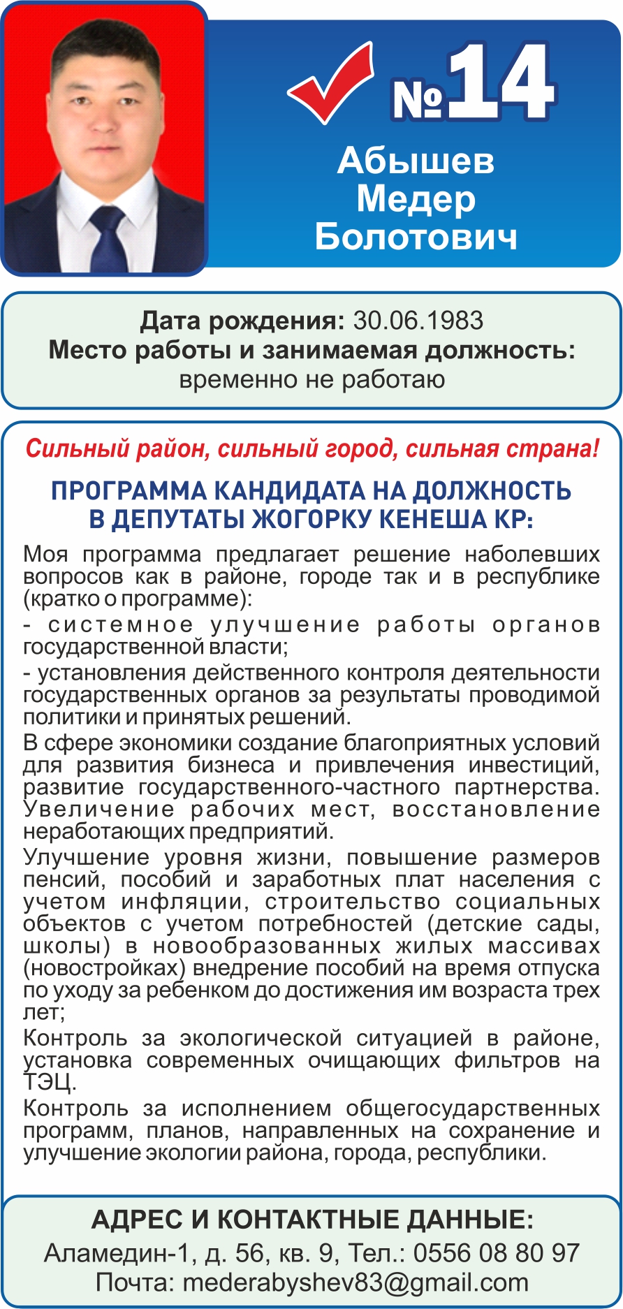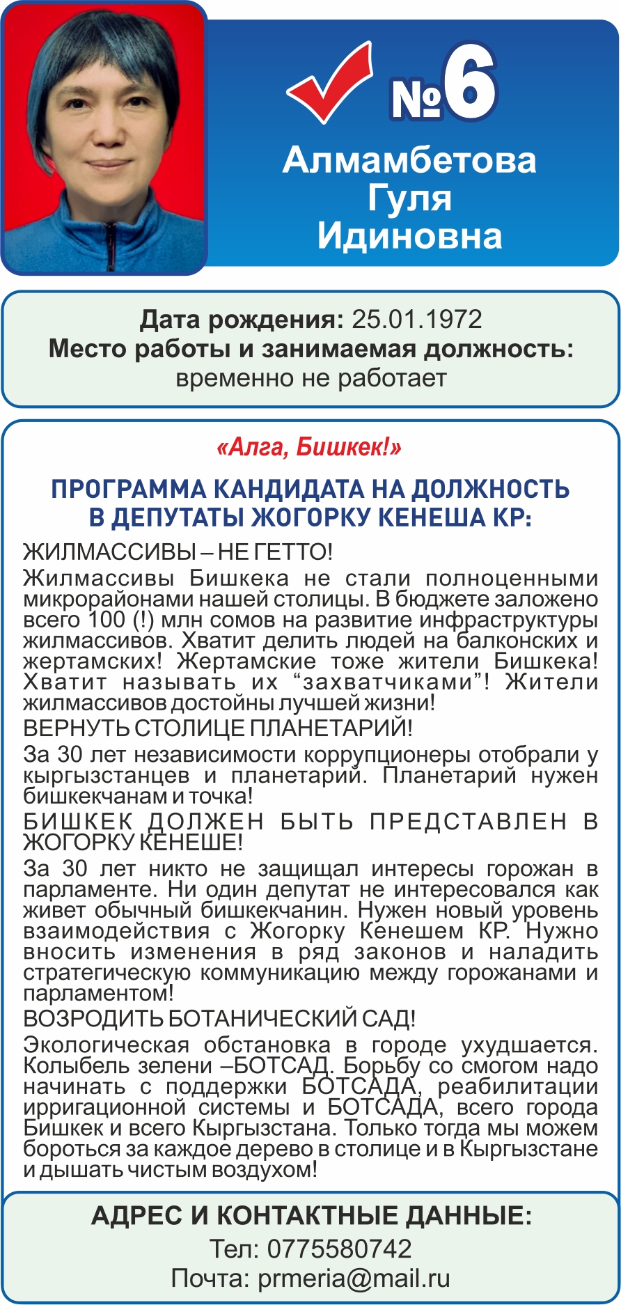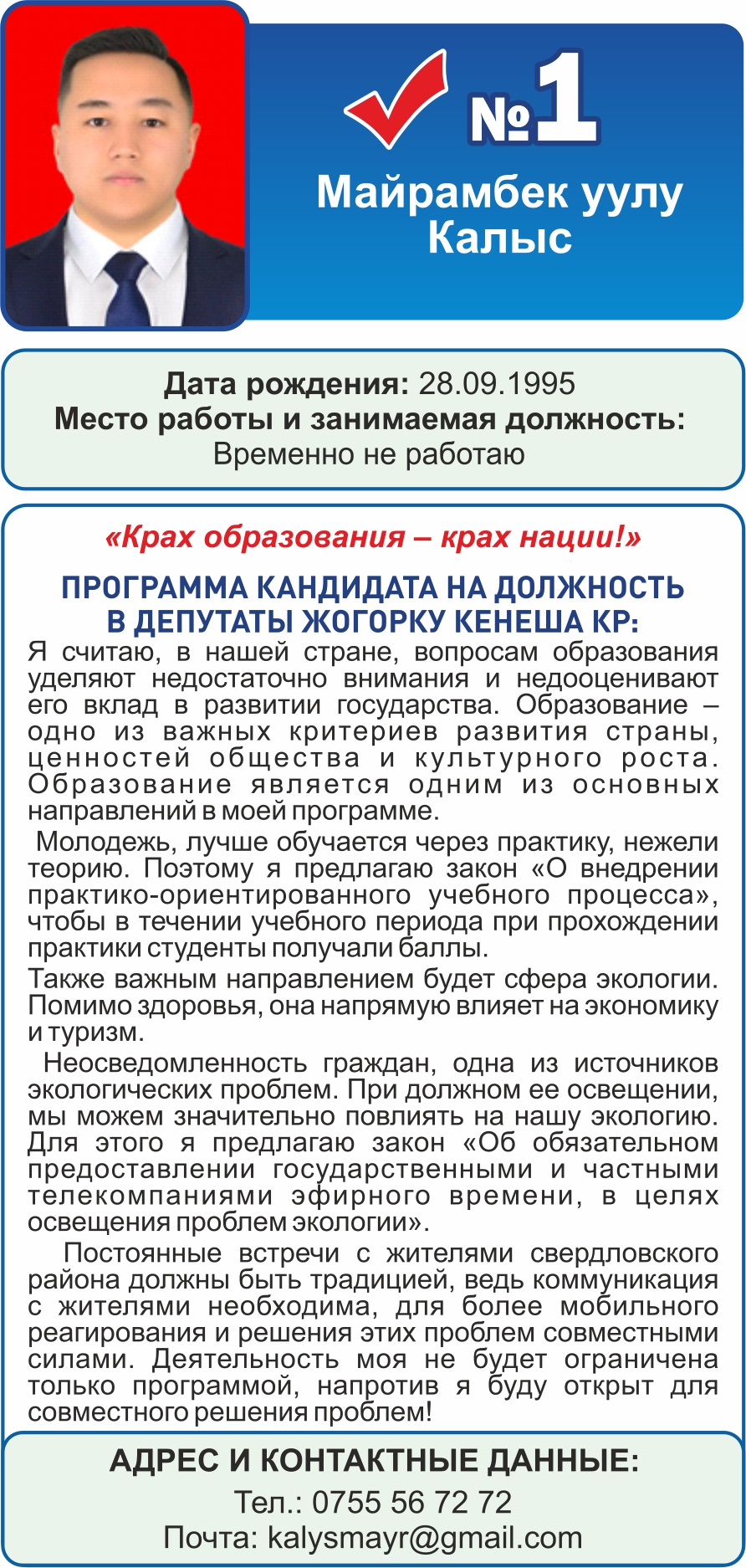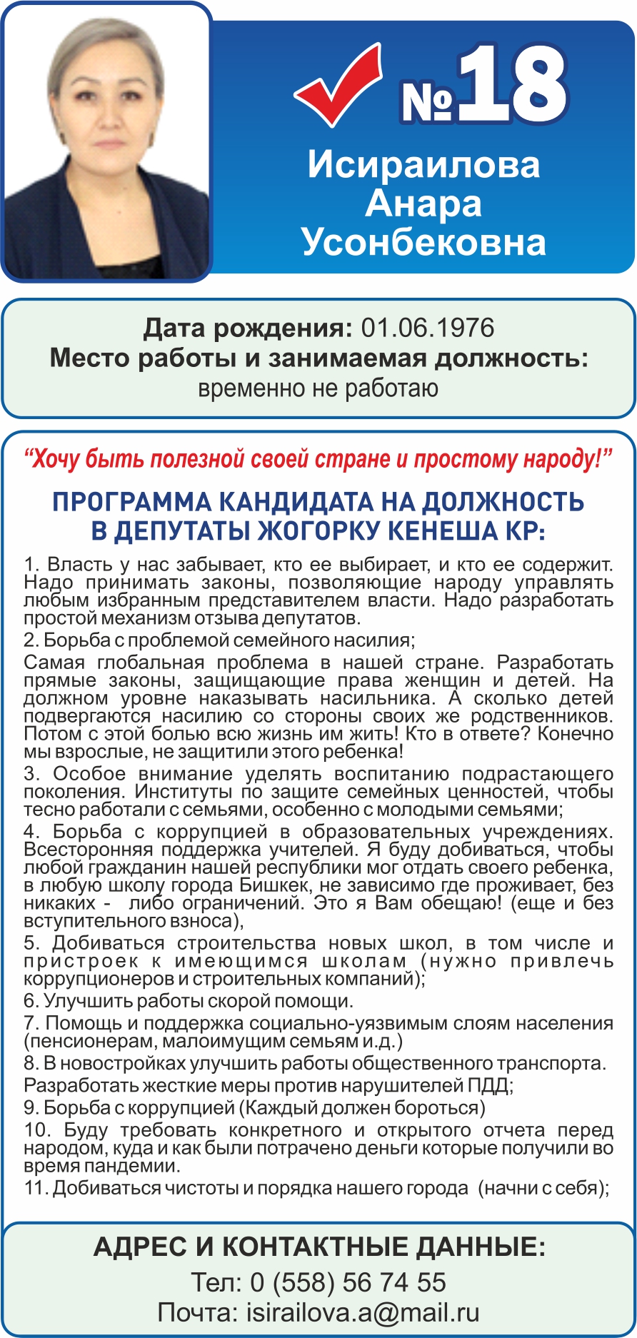 Центризбирком напоминает, что в целях информирования избирателей о кандидатах в депутаты Жогорку Кенеш Кыргызской Республики по Свердловскому одномандатному избирательному округу ЦИК опубликовала информацию о каждом кандидате: