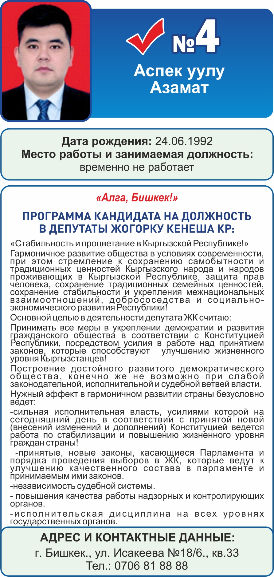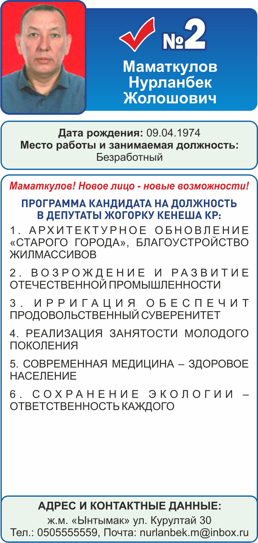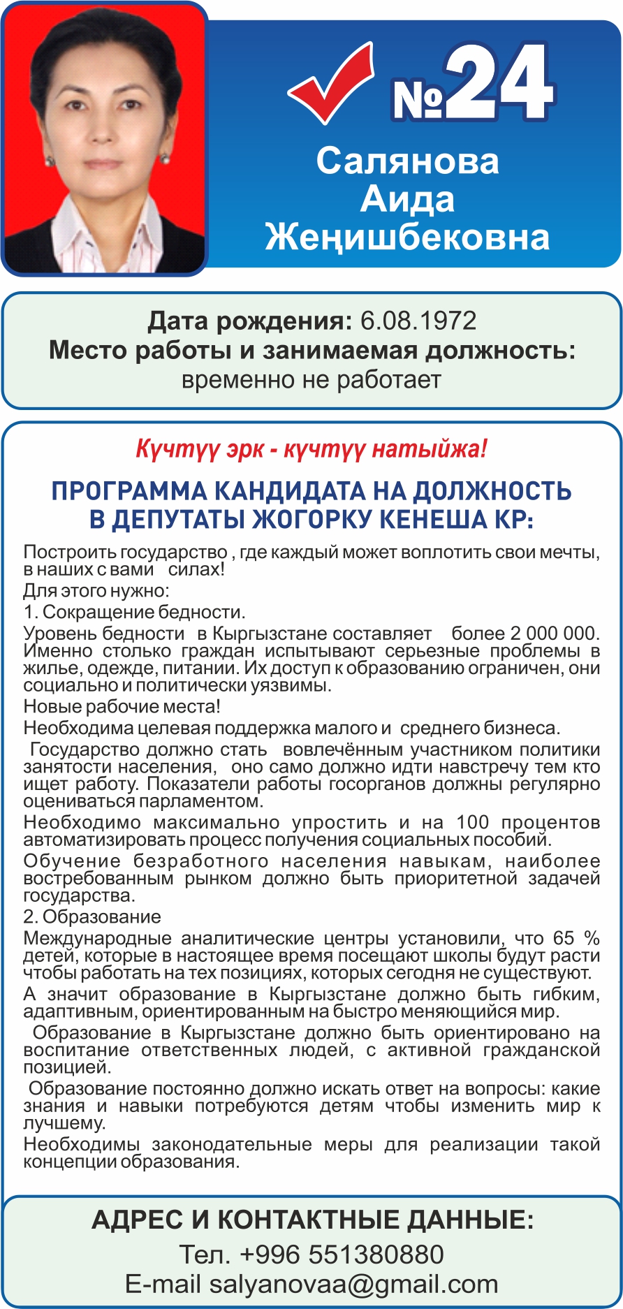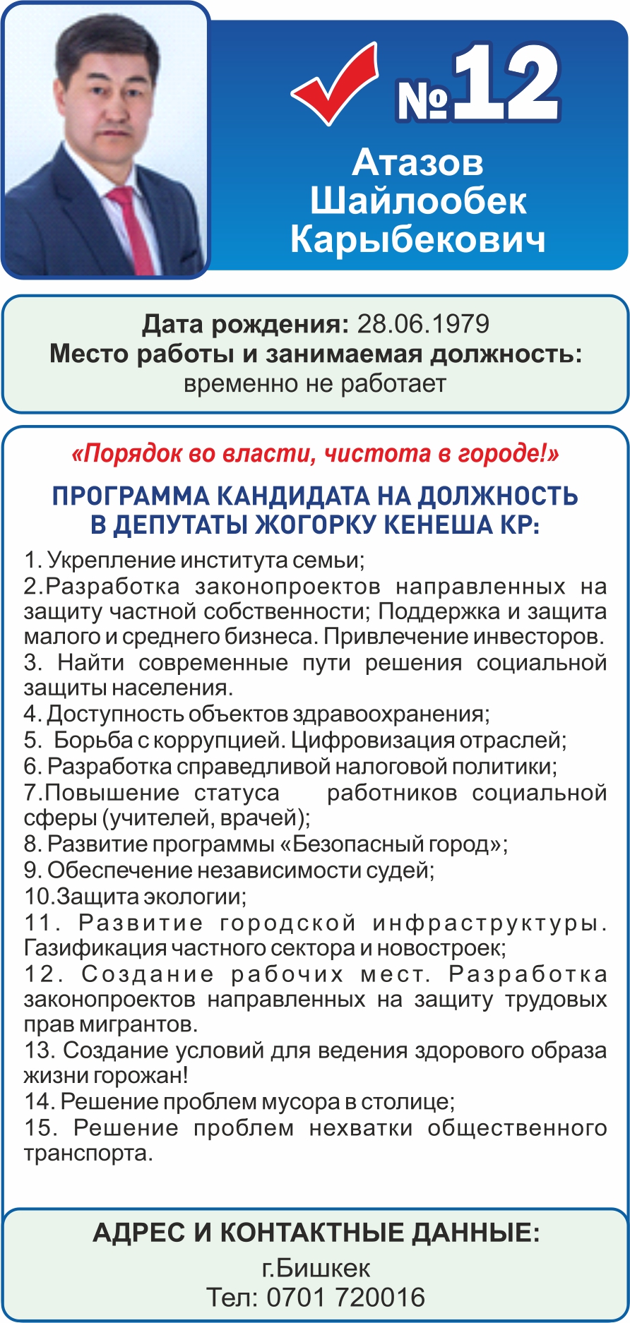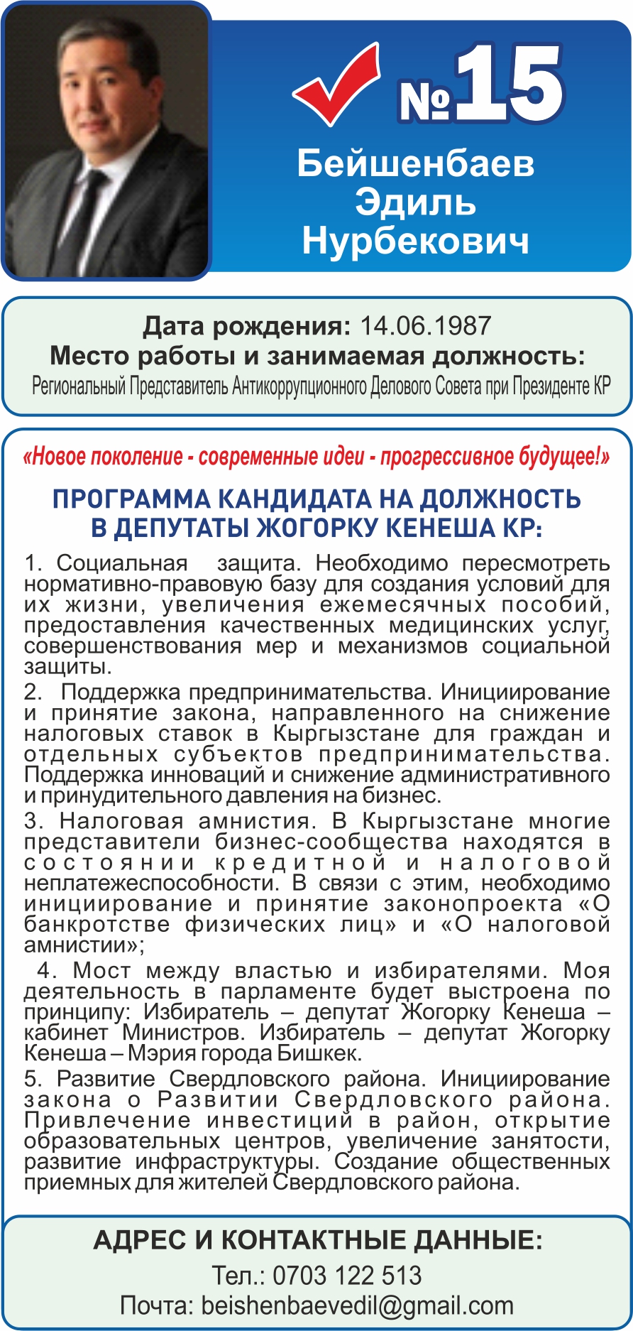 Центризбирком напоминает, что в целях информирования избирателей о кандидатах в депутаты Жогорку Кенеш Кыргызской Республики по Свердловскому одномандатному избирательному округу ЦИК опубликовала информацию о каждом кандидате: