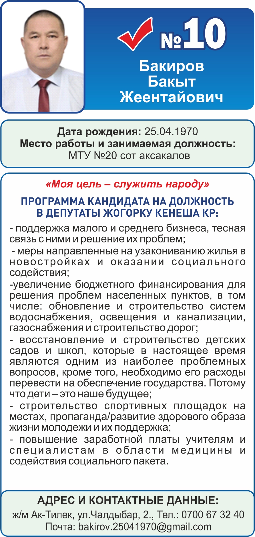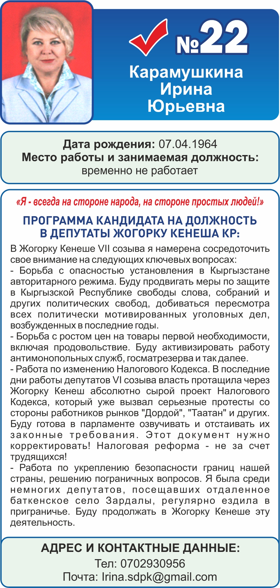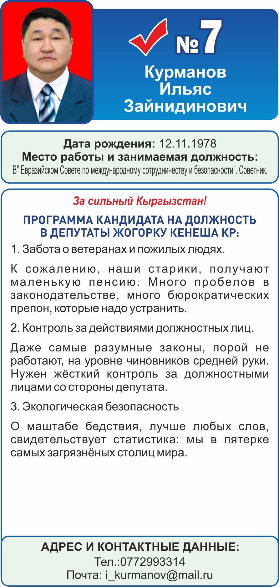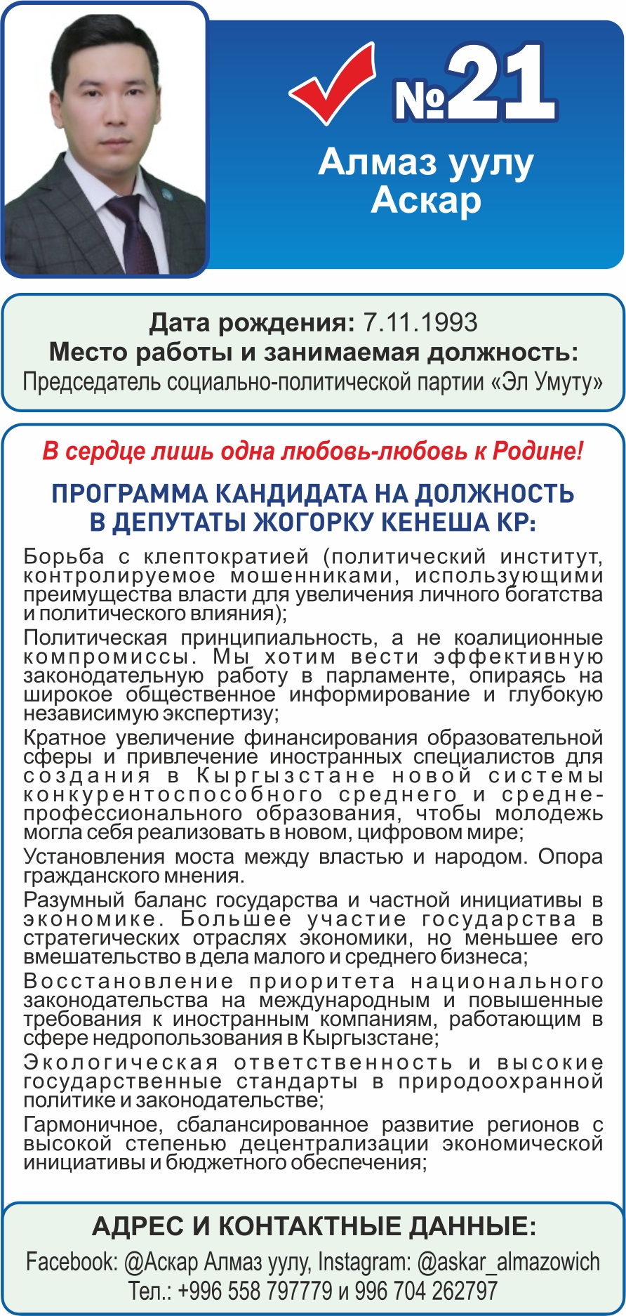 Центризбирком напоминает, что в целях информирования избирателей о кандидатах в депутаты Жогорку Кенеш Кыргызской Республики по Свердловскому одномандатному избирательному округу ЦИК опубликовала информацию о каждом кандидате: