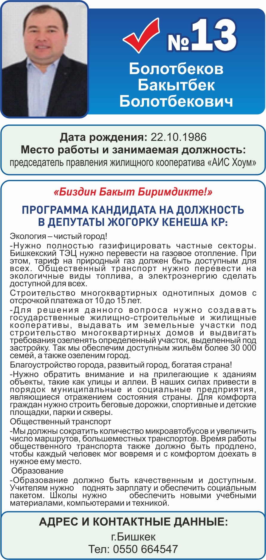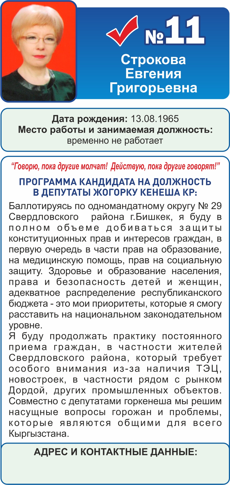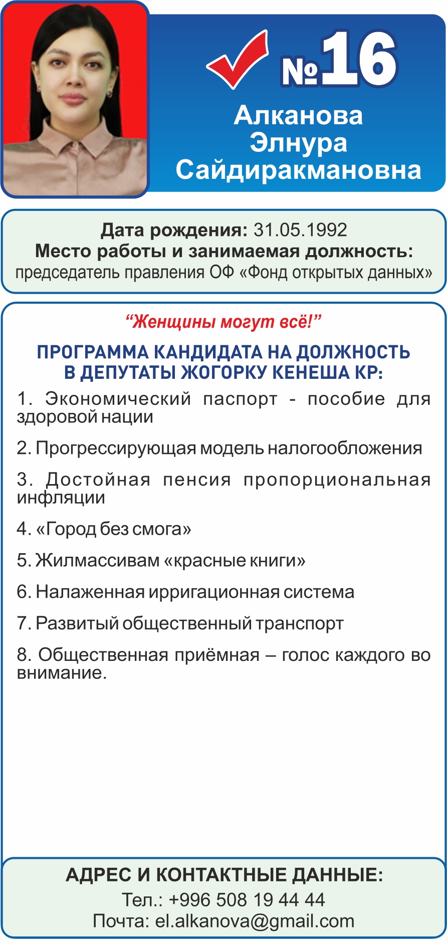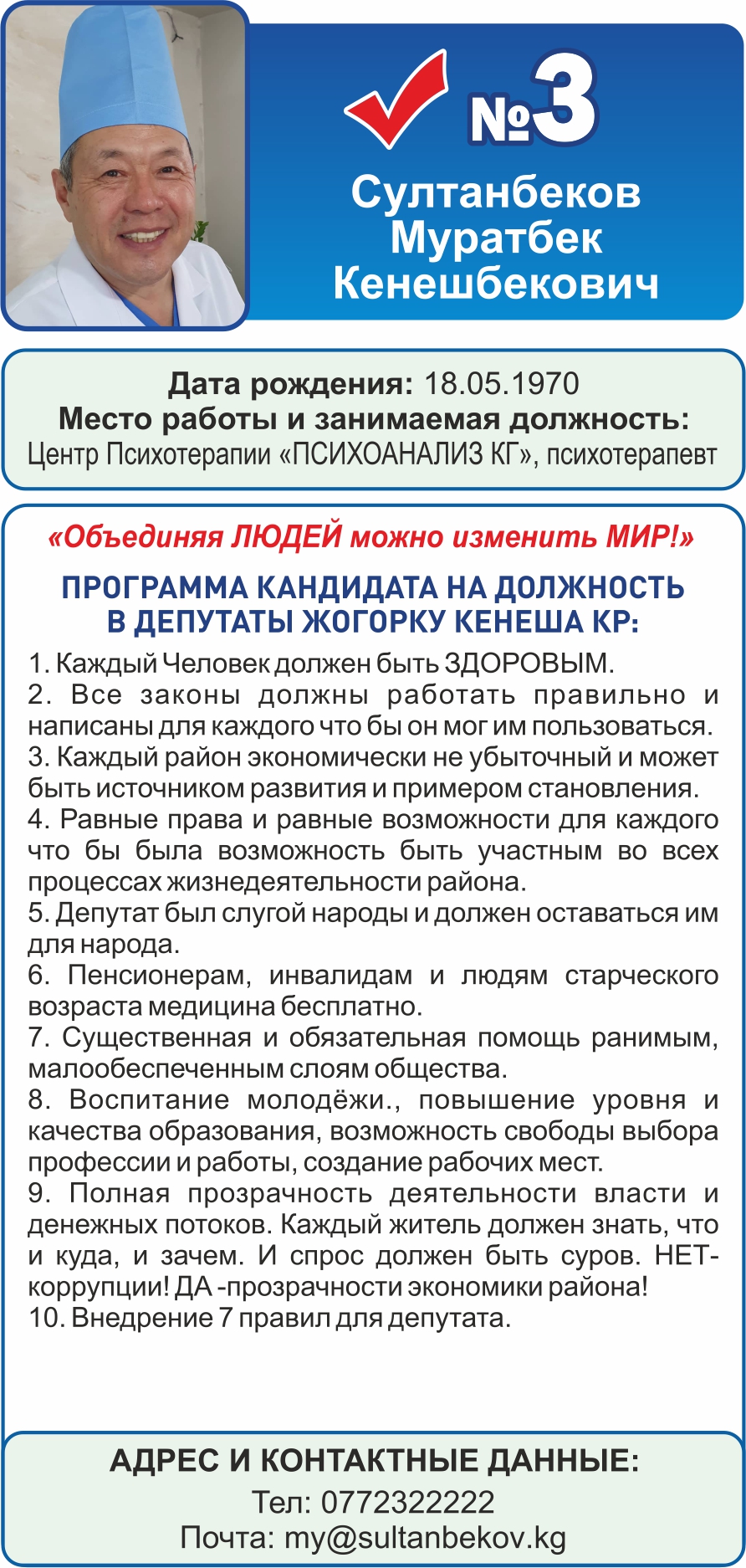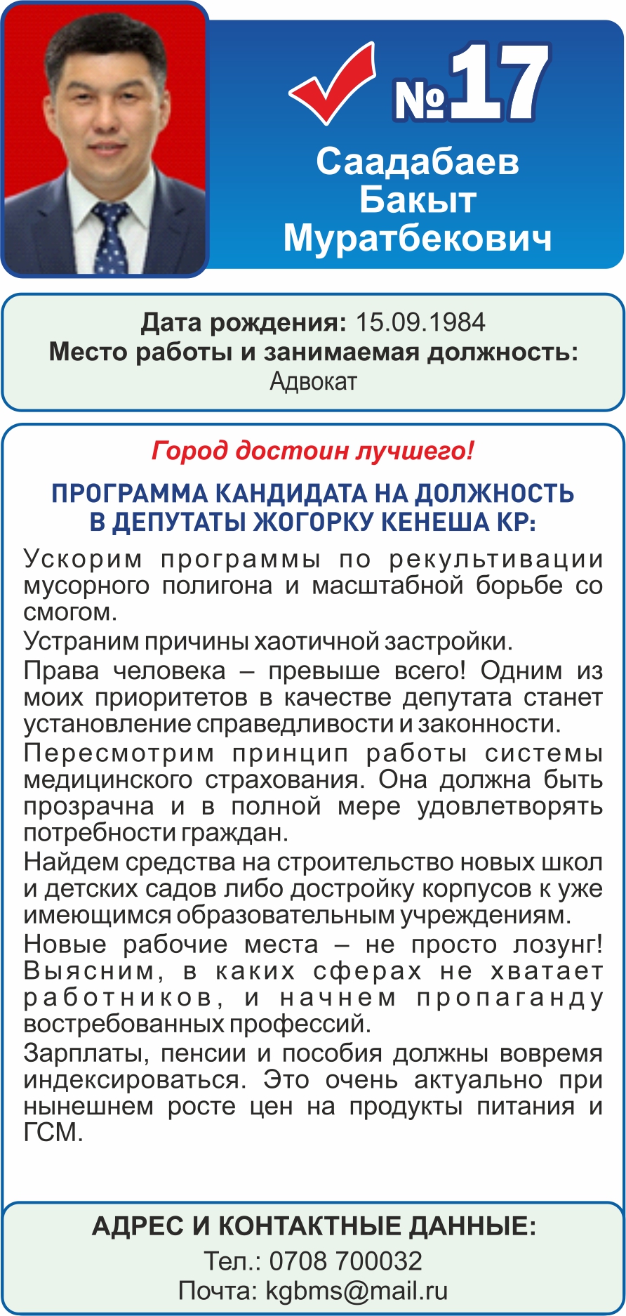 Центризбирком напоминает, что в целях информирования избирателей о кандидатах в депутаты Жогорку Кенеш Кыргызской Республики по Свердловскому одномандатному избирательному округу ЦИК опубликовала информацию о каждом кандидате: