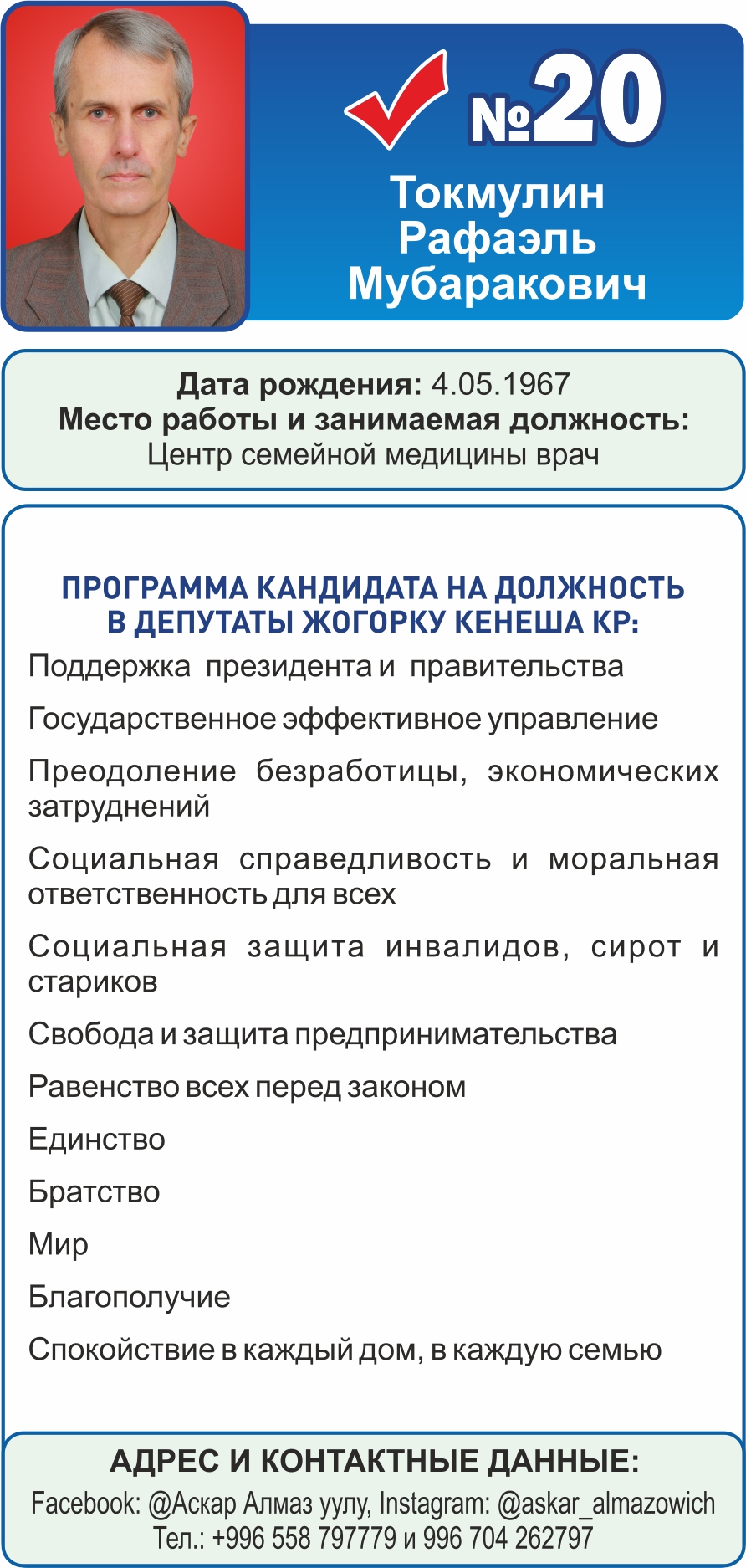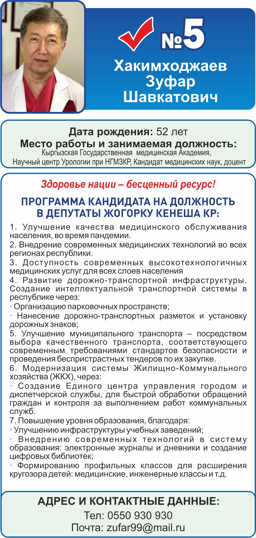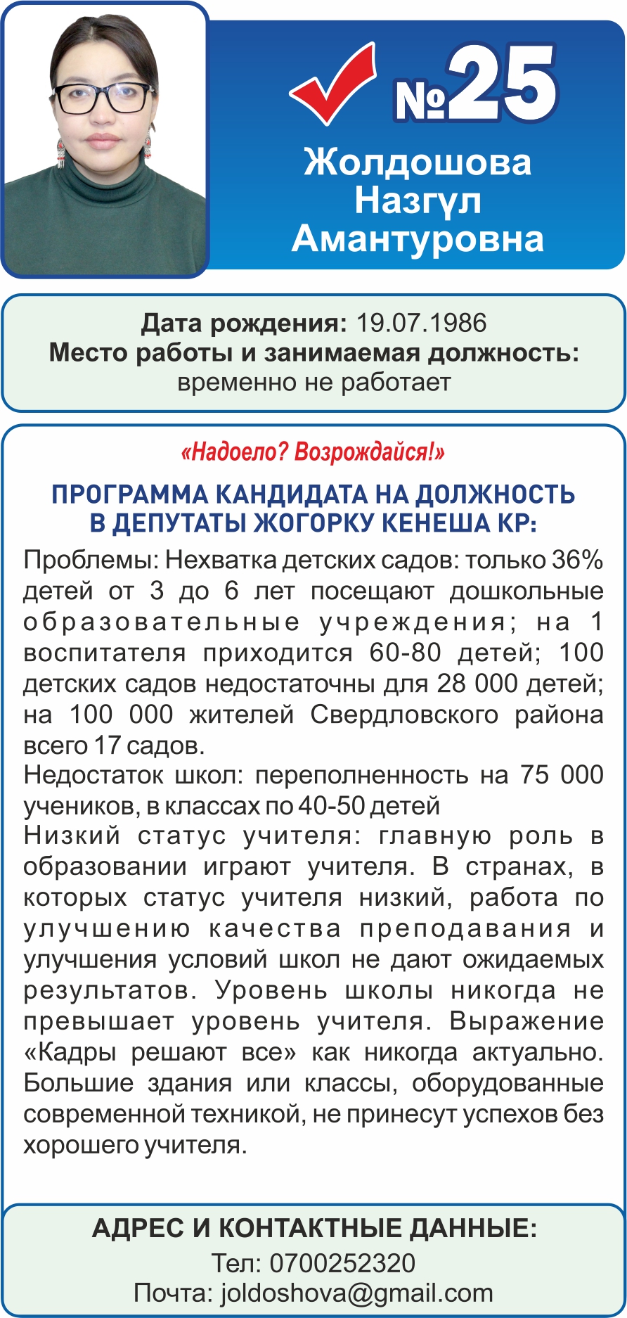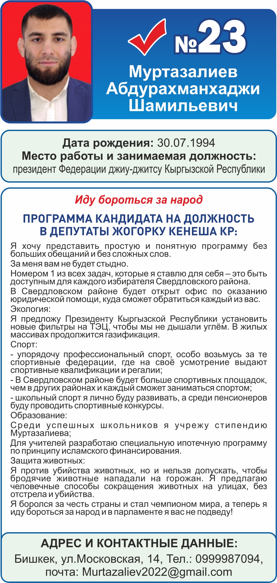 Центризбирком напоминает, что в целях информирования избирателей о кандидатах в депутаты Жогорку Кенеш Кыргызской Республики по Свердловскому одномандатному избирательному округу ЦИК опубликовала информацию о каждом кандидате: