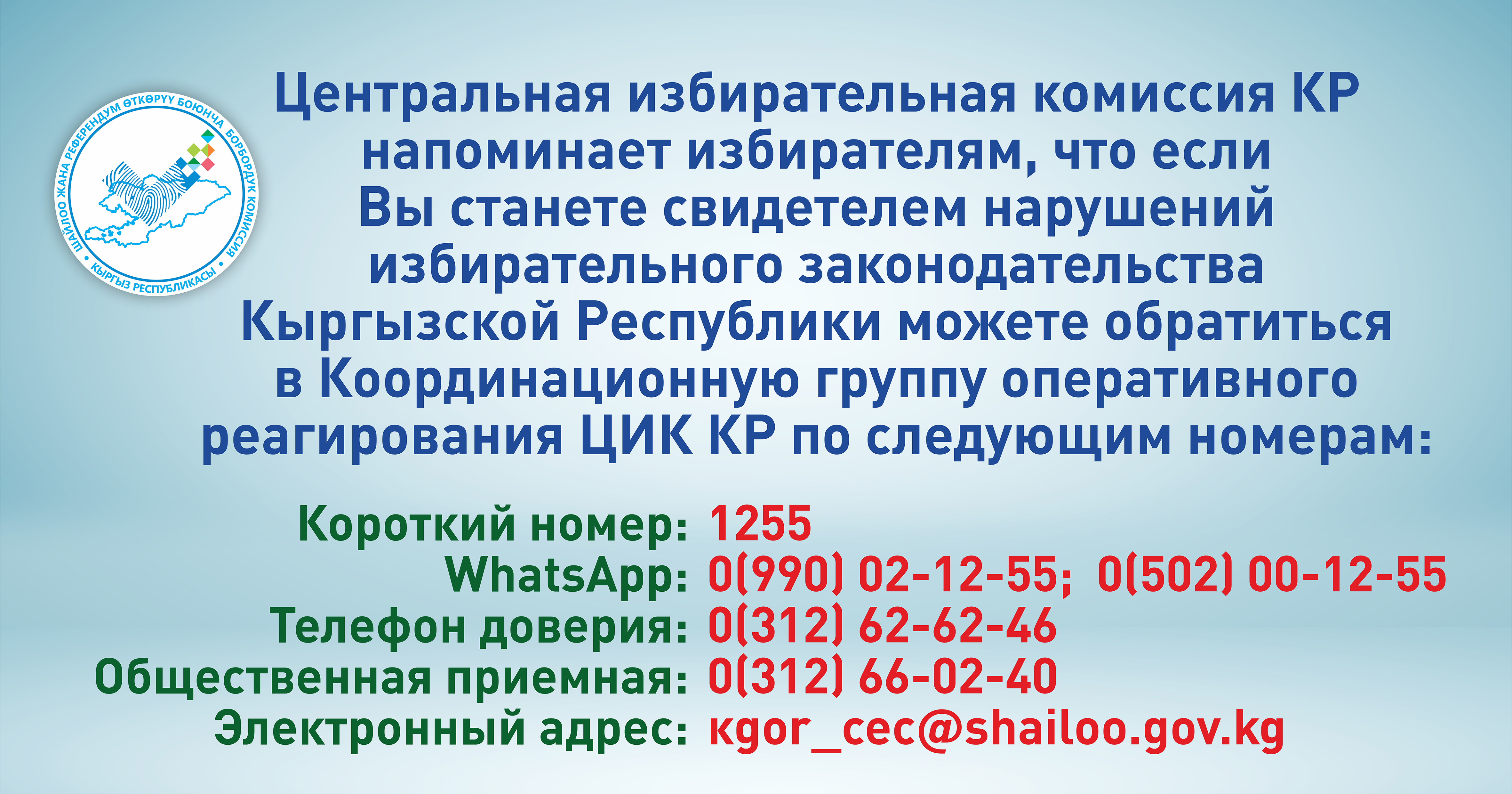 Центральная избирательная комиссия КР напоминает избирателям, что если Вы станете свидетелем нарушений избирательного законодательства Кыргызской Республики можете обратиться в Координационную группу оперативного реагирования ЦИК КР (далее - КГОР) по следующим номерам: