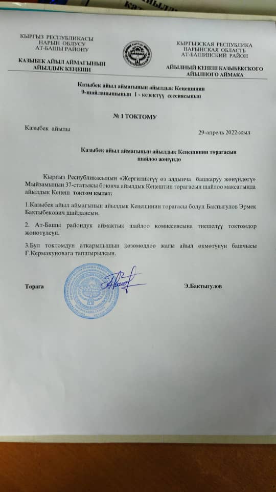 29 апреля 2022 года состоялась первая сессия Казыбекского айылного кенеша.