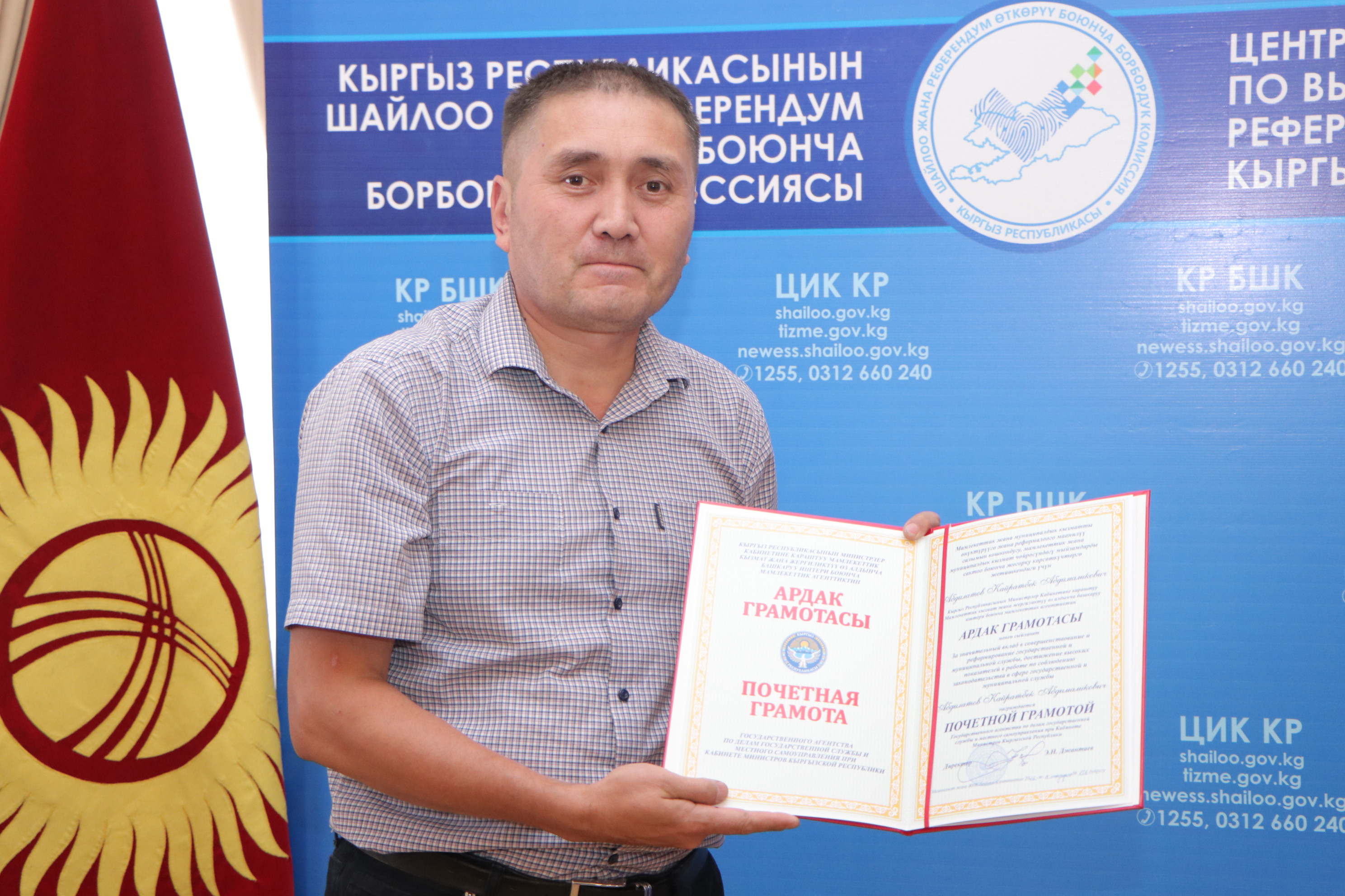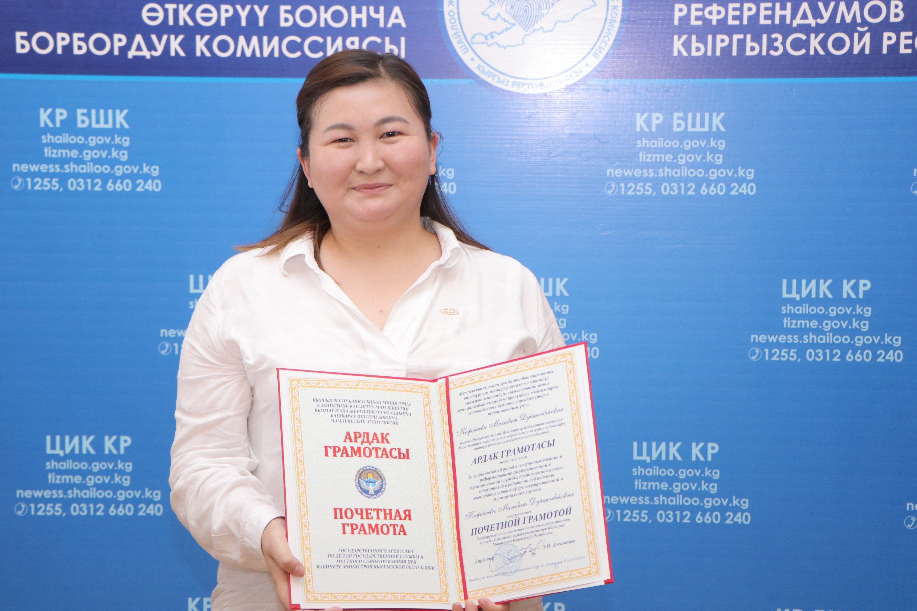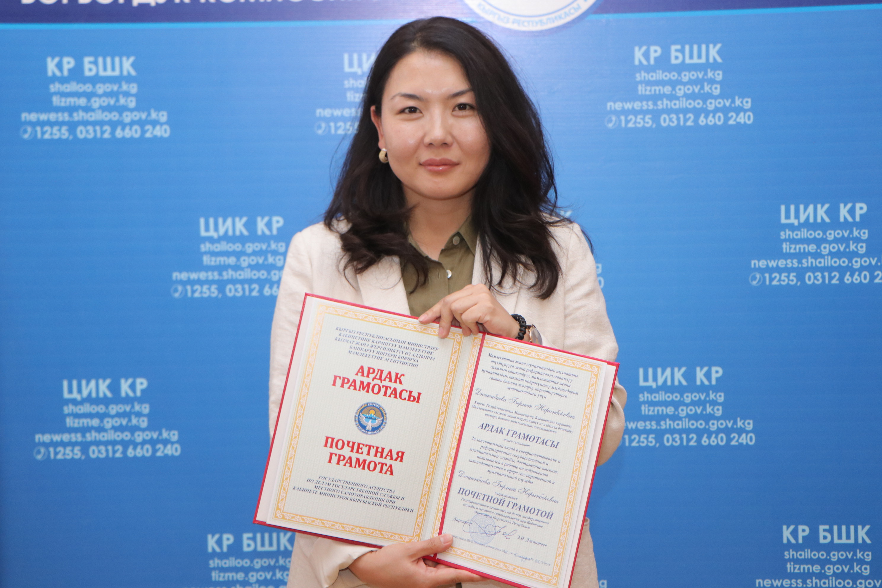 За значительный вклад в совершенствование и реформирование государственной и муниципальной службы, достижения высоких показателей в работе по соблюдению законодательства в сфере государственной и муниципальной службы, Государственное Агентство по делам государственной службы и местного самоуправления при Кабинете Министров Кыргызской Республики наградила нагрудными знаками «Отличник государственной службы Кыргызской Республики» и Почетной грамотой ряд сотрудников аппарата ЦИК КР.