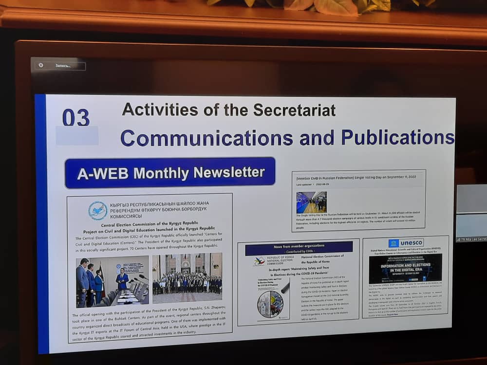 Тему выборов в Кыргызстане затронула в своем выступлении представитель Всемирной ассоциации избирательных органов (А-WEB) Тэрьюнг Рита Ли – она отметила о важности запуска Центров гражданского и цифрового образования в Кыргызской Республике для повышения осведомленности граждан, о чем также было опубликовано в журнале А-WEB.