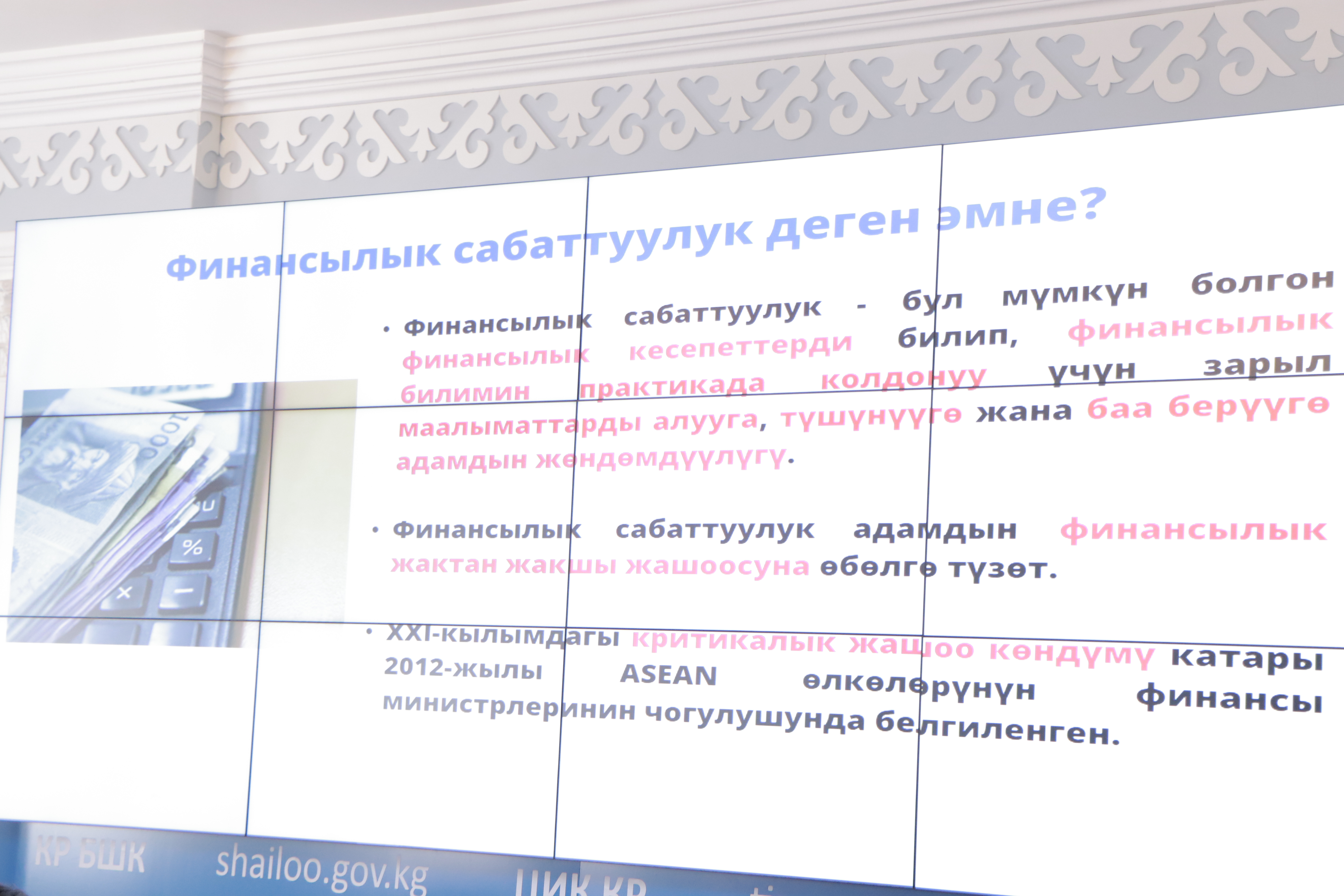 Следует отметить, что ранее Центром гражданского образования и избирательных технологий ЦИК КР было организовано проведение Ассоциацией микрофинансовых организаций обучающих курсов по финансовой грамотности населения в центрах гражданского и цифрового образования городов Бишкек и Ош, Ошской, Чуйской, Баткенской и Таласской областей. На следующем этапе планируется проведение обучающих курсов по финансовой грамотности в центрах гражданского и цифрового образования в Джалал-Абадской, Нарынской и Иссык-Кульской областей.
