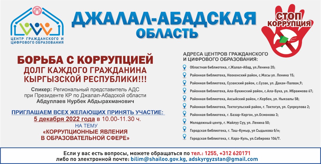 5 декабря 2022 года в 10.00-11.30 ч. на тему «Коррупционные явления в образовательной сфере» в следующих Центрах гражданского и цифрового образования Джалал-Абадской области: