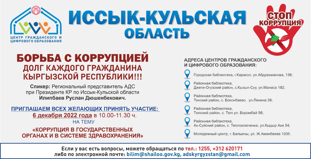 6 декабря 2022 года в 10.00-11.30 ч. на тему «Коррупция в государственных органах и в системе здравохранения» в следующих Центрах гражданского и цифрового образования Иссык-Кульской области: